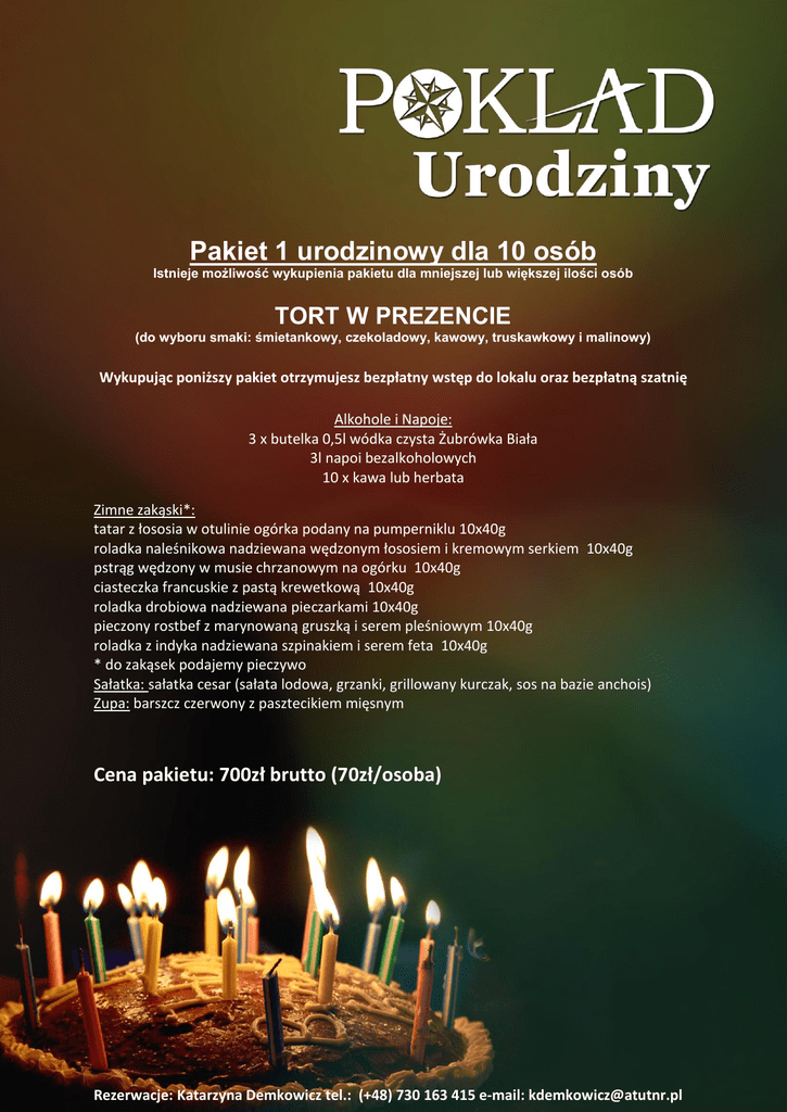 Pakiet 1 urodzinowy dla 10 osób Istnieje możliwość wykupienia pakietu dla mniejszej lub większej ilości osób TORT W PREZENCIE (do wyboru smaki: śmietankowy, czekoladowy, kawowy, truskawkowy i malinowy) Wykupując poniższy pakiet otrzymujesz bezpłatny wstęp do lokalu oraz bezpłatną szatnię Alkohole i Napoje: 3 x butelka 0,5l wódka czysta Żubrówka Biała 3l napoi bezalkoholowych 10 x kawa lub herbata Zimne zakąski*: tatar z łososia w otulinie ogórka podany na pumperniklu 10x40g roladka naleśnikowa nadziewana wędzonym łososiem i kremowym serkiem 10x40g pstrąg wędzony w musie chrzanowym na ogórku 10x40g ciasteczka francuskie z pastą krewetkową 10x40g roladka drobiowa nadziewana pieczarkami 10x40g pieczony rostbef z marynowaną gruszką i serem pleśniowym 10x40g roladka z indyka nadziewana szpinakiem i serem feta 10x40g * do zakąsek podajemy pieczywo Sałatka: sałatka cesar (sałata lodowa, grzanki, grillowany kurczak, sos na bazie anchois) Zupa: barszcz czerwony z pasztecikiem mięsnym Cena pakietu: 700zł brutto (70zł/osoba) Rezerwacje: Katarzyna Demkowicz tel.: (+48) 730 163 415 e-mail: [email protected] Pakiet 2 urodzinowy dla 10 osób Istnieje możliwość wykupienia pakietu dla mniejszej lub większej ilości osób TORT W PREZENCIE (do wyboru smaki: śmietankowy, czekoladowy, kawowy, truskawkowy i malinowy) Wykupując poniższy pakiet otrzymujesz bezpłatny wstęp do lokalu oraz bezpłatną szatnię Alkohole i Napoje: 4 x butelka 0,5l wódka czysta Żubrówka Biała 5l napoi bezalkoholowych 10 x kawa lub herbata Zimne zakąski*: pieczony rostbef z marynowaną gruszką i serem pleśniowym 10x40g roladka z indyka nadziewana szpinakiem i serem feta 10x40g ciasteczka filo nadziewane szpinakiem i serem feta 10x40g łosoś marynowany w białym winie i zielonym pieprzu 10x40g tatar z czerwonego śledzia na razowcu z domową śmietaną 10x40g śledzik w pikantnej oliwie 10x40g pstrąg wędzony w musie chrzanowym na ogórku 10x40g *do zakąsek podajemy pieczywo Sałatka: sałatka z grillowanym kurczakiem (kurczak, sałata lodowa, kukurydza, fasola, papryka, ogórek, sos winegret) Danie główne: zrazy z mięsa schabowego w towarzystwie ziemniaków puree oraz mixu sałat Zupa (serwowana po północy): tradycyjny żurek staropolski pachnący leśnymi grzybami z białą kiełbasą Cena pakietu: 1000zł brutto (100zł/osoba) Rezerwacje: Katarzyna Demkowicz tel.: (+48) 730 163 415 e-mail: [email protected]