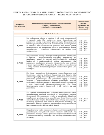 EFEKTY KSZTAŁCENIA DLA KIERUNKU STUDIÓW FINANSE I RACHUNKOWOŚĆ (STUDIA PIERWSZEGO STOPNIA — PROFIL PRAKTYCZNY) Kod efektu kierunkowego Kierunkowe efekty kształcenia dla kierunku studiów Finanse i rachunkowość – studia pierwszego stopnia Odniesienie do efektów kształcenia dla obszaru nauk społecznych W I E D Z A K_W01 K_W02 K_W03 K_W04 K_W05 Ma podstawową wiedzę o miejscu i roli nauk ekonomicznych w systemie nauk. Zna podstawowe teorie ekonomiczne, ma podstawową wiedzę o zjawiskach gospodarczych. Zna podstawową terminologię używaną w naukach ekonomicznych, w szczególności w finansach. Zna uwarunkowania społeczne oraz prawne zjawisk ekonomicznych. Ma podstawową wiedzę o determinantach wzrostu gospodarczego i czynnikach wpływających na poziom życia społeczeństwa. Ma podstawową wiedzę o funkcjonowaniu gospodarki otwartej oraz o regułach międzynarodowej współpracy gospodarczej. Ma podstawową wiedzę w zakresie międzynarodowych stosunków handlowych i międzynarodowej polityki ekonomicznej. Zna podstawowe mechanizmy procesów integracyjnych, oraz strukturę i system organizacji Unii Europejskiej. Zna podstawowe mechanizmy i formy wsparcia ekonomicznego krajów członkowskich przez Unię Europejską. Zna istotę i mechanizmy funkcjonowania systemu bankowego oraz finansowego państwa, instytucji finansowych oraz banków. Zna zależności pomiędzy finansami państwa a rynkami finansowymi oraz podmiotami gospodarczym. Zna podstawowe rygory i wymogi związane z gospodarowaniem środkami publicznymi. Rozumie kwestię deficytu budżetowego oraz długu publicznego i wynikających z tego konsekwencji ekonomiczno-społecznych. Zna istotę funkcjonowania rynków finansowych i ich wpływu na całą gospodarkę. Zna regulacje ekonomiczne oraz podstawy prawne dotyczące zasad gospodarowania zasobami organizacji, w szczególności zasobami finansowymi. Ma podstawową wiedzę o zarządzaniu składnikami majątkowymi przedsiębiorstwa, pozyskiwaniu źródeł finansowania, oraz metod oceny ryzyka. Zna metody oceny sytuacji ekonomicznofinansowej organizacji oraz rachunek efektywności inwestycji. Ma podstawową wiedzę o kryteriach podejmowania decyzji finansowych oraz o zasadach oceny skutków takich decyzji. Ma podstawową wiedzę z zakresu rachunkowości różnych podmiotów gospodarczych, oraz jednostek sektora finansów publicznych. Ma podstawową wiedzę z zakresu sporządzania sprawozdań finansowych i zastosowania analizy finansowej. Zna standardy sprawozdawczości finansowej. S1P _ W01 S1P _ W02 S1P _ W03 S1P _ W08 S1P _ W09 S1P _ W11 S1P _ W02 S1P _ W03 S1P _ W05 S1P _ W07 S1P _ W08 S1P _ W10 S1P _ W02 S1P _ W03 S1P _ W05 S1P _ W07 S1P _ W08 S1P _ W09 S1P _ W10 S1P _ W11 S1P _ W02 S1P _ W06 S1P _ W07 S1P _ W11 K_W06 K_W07 K_W08 Ma podstawową wiedzę z zakresu systemu podatkowego oraz ubezpieczeń, a także regulacji prawnych dotyczących systemu podatkowego oraz ubezpieczeń. Zna zakres i podstawowe formy opodatkowania działalności gospodarczej w Polsce i wybranych krajach UE. Zna metody i narzędzia w tym techniki pozyskiwania danych właściwe dla nauk ekonomicznych, pozwalające na opisywanie struktur społecznych i procesów w nich zachodzących. Ma podstawową wiedzę o wykorzystaniu w finansach metod ilościowych, w szczególności matematyki oraz statystyki, a także technologii informatycznych i informatyki. Ma wiedzę na temat wpływu aktywności ruchowej na zdrowie S1P _ W02 S1P _ W06 S1P _ W07 S1P _ W11 S1P _ W06 S1A_W01 U M I E J Ę T N O Ś C I K_U01 Potrafi wykorzystać wiedzę z zakresu ekonomii oraz powiązanych z nią dyscyplin naukowych do analizy i interpretacji problemów gospodarczych oraz do rozwiązywania problemów praktyki gospodarczej. Potrafi – w podstawowym zakresie – formułować wnioski wynikające z zachodzących procesów i zdarzeń gospodarczych. S1P _ U01 S1P _ U02 S1P _ U03 S1P _ U04 K_U02 Potrafi, w podstawowym zakresie, określać, analizować i stosować właściwe narzędzia i regulacje ekonomiczno-prawne dla rozwiązywania problemów międzynarodowej współpracy gospodarczej. Potrafi określić możliwe do pozyskania źródła środków finansowych w ramach współpracy międzynarodowej. S1P _ U02 S1P _ U03 S1P _ U05 K_U03 Potrafi w podstawowym zakresie rozpoznawać i oceniać zjawiska finansowe zachodzące w gospodarce oraz wyjaśnić zasady i procedury podejmowania decyzji finansowych na szczeblu krajowym, samorządowym i podmiotu gospodarczego. S1P _ U02 S1P _ U03 K_U04 Potrafi wykorzystać metody ilościowe do opisu oraz analizy wybranych zjawisk ekonomicznych. S1P _ U02 S1P _ U04 K_U05 Potrafi stosować technologie informacyjne, a także określić problemy i procesy, które mogą być efektywnie rozwiązywane współczesnymi środkami informatycznymi. S1P _ U02 S1P _ U04 K_U06 Potrafi ocenić stosowane w organizacji procesy i metody dotyczące zarządzania finansami oraz instrumentami finansowymi, a także potrafi zaproponować odpowiednią zmianę w zakresie powyższych zagadnień. Potrafi ocenić kondycję finansową przedsiębiorstwa i formułować ewentualne wnioski restrukturyzacyjne. S1P _ U01 S1P _ U02 S1P _ U03 K_U07 Prawidłowo posługuje się terminologią z zakresu rachunkowości. Potrafi identyfikować i interpretować skutki operacji gospodarczych. Potrafi zaksięgować operacje gospodarcze, sporządzić i zinterpretować sprawozdanie finansowe podmiotów gospodarczych oraz jednostek sektora finansów publicznych. S1P _ U04 S1P _ U05 S1P _ U06 S1P _ U07 K_U08 Potrafi dokonać wstępnej identyfikacji prawnej stanów faktycznych w organizacji z punktu widzenia reguł prawa gospodarczego, prawa cywilnego i prawa pracy, a także reguł prawnych dotyczących ochrony własności przemysłowej i własności intelektualnej. S1P _ U05 K_U09 Potrafi oceniać ofertę bankową i ubezpieczeniową. Potrafi w podstawowym zakresie prowadzić ewidencje podatkowe oraz dokonywać rozliczeń podatkowych . Umie okre