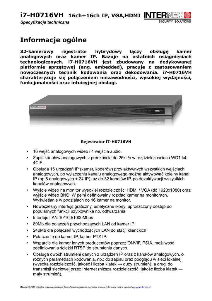 i7-H0716VH 16ch+16ch IP, VGA,HDMI Specyfikacja techniczna Informacje ogólne 32-kamerowy rejestrator hybrydowy łączy obsługę kamer analogowych oraz kamer IP. Bazuje na ostatnich osiągnięciach technologicznych. i7-H0716VH jest zbudowany na dedykowanej platformie sprzętowej (ang. embedded), pracuje z zastosowaniem nowoczesnych technik kodowania oraz dekodowania. i7-H0716VH charakteryzuje się połączeniem niezawodności, wysokiej wydajności, funkcjonalności oraz intuicyjnej obsługi. Rejestrator i7-H0716VH • • • • • • • • • • • 16 wejść analogowych wideo i 4 wejścia audio. Zapis kanałów analogowych z prędkością do 25kl./s w rozdzielczościach WD1 lub 4CIF. Obsługa 16 urządzeń IP (kamer, koderów) przy aktywnych wszystkich wejściach analogowych, po wyłączeniu kanału analogowego można aktywować kolejny kanał IP (np.8 analogowych + 24 IP), aż do 32 kanałów IP, po dezaktywacji wszystkich kanałów analogowych. Wyście wideo na monitor wysokiej rozdzielczości HDMI / VGA (do 1920x1080) oraz wyjście wideo BNC. W pełni definiowalny rozkład kamer na monitorach. Wyświetlanie w podziałach do 16 kamer na monitor. Nowoczesny interfejs graficzny, estetyczne ikony; uproszczony dostęp do popularnych funkcji użytkownika np. odtwarzania. Interfejs LAN 10/100/1000Mbps 80Mb dla połączeń przychodzących LAN od kamer IP 240Mb dla połączeń wychodzących LAN do stacji klienckich Połączenie do kamer IP, kamer PTZ IP. Wsparcie dla kamer innych producentów poprzez ONVIF, PSIA, możliwość zdefiniowania ścieżki RTSP do strumienia danych. Obsługa dwóch strumieni danych z urządzeń IP oraz z kanałów analogowych, o różnych parametrach kodowania, np.: do zapisu oraz podglądu w sieci lokalnej (wysoka rozdzielczość, jakość i liczba klatek → duży strumień), a drugi do transmisji sieciowej przez Internet (niższa rozdzielczość, jakość liczba klatek → mały strumień). Wersja 06.2015 Wszelkie prawa zastrzeżone. Specyfikacja urządzenia może ulec zmianie. Informacje można uzyskać na www.internec.pl . i7-H0716VH 16ch+16ch IP, VGA,HDMI Specyfikacja techniczna • • • • • • • • • • • • • • • • • • • • • • Obsługa kamer IP w rozdzielczościach: 4CIF / 720P / XVGA/ 1080P / UXGA / 2048*1536(3Mpix) / 2560×1290 (5Mpix). Obsługa podglądu, zapisu i odtwarzania w wysokiej rozdzielczości. Powiększenie cyfrowe w podglądzie i odtwarzaniu. Odtwarzanie – różne tryby: szybki dostęp do ostatnich minut nagrania pozostawiając tryb na żywo dla pozostałych kanałów. Szybkie przejście bezpośrednio z podglądu do odtwarzania wybranego kanału. Odtwarzanie - funkcje: jedno i wielokamerowe, w przód, wstecz, zwolnione, przyspieszone - duża prędkość przeglądania nagrań (aż do x16). Dodawanie własnych znaczników na nagraniu tzw. tagów ułatwia późniejszy powrót do nagrania. Szybki backup nagrań na USB z poziomu odtwarzania. Funkcja inteligentnego wyszukiwania nagrań w trybie odtwarzania * – post-detekcyjne wyszukiwanie zdarzeń dla zaznaczonego fragmentu w nagraniu . Wsparcie dla myszy w sterowaniu PTZ, w tym tryb 3D * - zaznaczając fragment obrazu kamera PTZ wykonuje ruch i zbliżenie optyczne fragmentu. Tryb nagrywania ciągły bądź aktywowany zdarzeniem, określony harmonogramem, oddzielnie definiowalny dla każdego kanału. Obsługiwane zdarzenia z urządzeń IP*: detekcja ruchu, alarmy z wejść alarmowych. Parametry: rozdzielczość, ilość klatek, przepływność bitowa oraz jakość obrazu oddzielnie definiowalne dla każdej kamery Definiowanie oddzielnych parametrów dla zapisu ciągłego oraz dla zapisu alarmowego * Wejścia alarmowe i wyjścia alarmowe. Możliwość powiązania wejść alarmowych z szeregiem reakcji np. wywołanie zapisu z dowolnej kamery, pozycjonowanie kamery PTZ itp. Wyjścia alarmowe mogą informować o błędach i alarmach systemowych np. uszkodzenie dysku, utrata obrazu z kamery, itp. RS485 do sterowania analogowymi kamerami PTZ Obudowa typu rack 1U, z miejscem na 2 dyski SATA. Obsługa S.M.A.R.T., standby i pre-alokacji dla HDD, obsługa dysków SATA o pojemności do 4TB każdy. Możliwość łączenia dysków w grupy, przydziału dysków dla poszczególnych kamer, ustalenia limitów pojemności dla zapisu danego kanału. Szeroki zakres diagnostyki z poziomu menu, informacje o zajętości sieci dla połączeń przychodzących oraz wychodzących. Własny serwer DDNS umożliwia ułatwia konfigurację połączenia zdalnego w lokalizacjach o zmiennym IP (np. przez Neostradę, Dialnet itp.) Protokoły TCP/IP: IPv6, PPPoE, DHCP, DNS, DDNS, NTP, SADP, SMTP, SNMP, NFS, UPnP™, iSCSI. Możliwość obsługi rejestratorów przez sieć TCP/IP, w pakiecie zaawansowane oprogramowanie typu CMS na PC: i7-VMS PL bez limitu stanowisk. Wbudowany serwer web. Obsługa rejestratora przez przeglądarki IE, Mozilla, Opera i inne. Oprogramowanie na urządzenia mobilne i7-MVS PL. Pilot zdalnego sterowania pozwalający na obsługę wybranych funkcji. Wersja 06.2015 Wszelkie prawa zastrzeżone. Specyfikacja urządzenia może ulec zmianie. Informacje można uzyskać na www.internec.pl . i7-H0716VH 16ch+16ch IP, VGA,HDMI Specyfikacja techniczna Informacje podstawowe • • • • • • • • Wejścia wideo w standardzie PAL/NTSC. Wykorzystanie kodeka H.264 dla kompresji kanałów analogowych. Możliwość podłączenia kamer IP innych producentów, kamer PTZ IP, koderów wideo IP. Możliwość zapisu strumienia wideo, lub wideo + audio, definiowalna oddzielnie dla każdego kanału. Synchronizacja wideo i audio w procesie kompresji. Każdy kanał obsługuje dwu-strumieniowość. Niezależna konfiguracja dla każdego kanału, w tym rozdzielczość, liczba klatek na sekundę, przepływność bitowa, jakość obrazu. Definiowalne ustawienia parametrów wyświetlania na monitorach. Znak wodny. Praca na monitorach lokalnych • • • • • • • • • Jednoczesne 