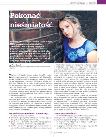 psychologia w szkole Pokonać nieśmiałość Fot. Fotolia W każdej klasie jest co najmniej jedno dziecko, któremu przypisywana jest etykieta „nieśmiałe”. Wychowawcy mogą albo przyczyniać się do nasilenia nieśmiałości u swoich podopiecznych, albo pomóc im ją przezwyciężyć. Nie będą jednak w stanie im pomóc, jeśli nie posiądą odpowiedniej wiedzy i nie uświadomią sobie w pełni rzeczywistej wagi tego podstępnego problemu. jawisko nieśmiałości stanowi złożony kompleks problemów psychologicznych i pedagogicznych. Harwas-Napierała określa nieśmiałość jako pojęcie nieostre, im bliżej mu się przyglądamy, tym więcej odkrywamy odmian nieśmiałości. Okazuje się, że żadna z pojedynczych definicji nie jest adekwatna, ponieważ nieśmiałość oznacza różne rzeczy dla różnych osób. Zimbardo twierdzi, że jest to złożona przypadłość, która pociąga za sobą całą gamę skutków – od lekkiego uczucia skrępowania, nieuzasadnionego lęku przed ludźmi, aż do skrajnej nerwicy [7]. Być osobą nieśmiałą to znaczy być trudnym w kontakcie z powodu bojaźliwości, ostrożności lub nieufności, niechęci w kontaktach z pewnymi osobami i przedmiotami [7]. Osoba nieśmiała jest ostrożna w kontaktach i działaniu, wzdrygająca się przed okazywaniem pewności siebie, przewrażliwiona i bojaźliwa, skromna i pełna rezerwy z powodu braku wiary we własne siły [7]. Nieśmiałość przejściowa najczęściej występuje u dzieci i młodzieży. Jest przejawem kryzysowych momentów w procesie kształtowania się osobowości, wówczas gdy jednostka boi się opinii negatywnych przy ogromnej potrzebie pozytywnych wzmocnień. Można sądzić, że obejmuje zakłócenia w sferze spostrzegania sytuacji, samoorientacji, w emocjach i motywacji. Jest przyczyną problemów natury towarzyskiej, utrudniając spotkania z ludźmi, zawieranie nowych przyjaźni, wyrażanie swoich poglądów i opinii, określanie wartości i obronę swoich praw. Nieśmiałość sprawia, że osoby, którym jest przypisywana, stają się przewrażliwione na swoim punkcie, nie doceniają swych mocnych stron. Ta cecha osobowości zmniejsza zdolność jasnego myślenia w obecności innych i skutecznego komunikowania się z nimi. Nieśmiałość jest podstępnym problemem osobistym, który potęgowany jest poprzez izolację, współzawodnictwo i samotność. Dlatego też zapobieganie nieśmiałości wymaga odpowiedniego kształtowania osobowości, stwarzania realnych sytuacji do przeżycia sukcesu i poczucia bezpieczeństwa. Udzielając pomocy osobie nieśmiałej w przezwyciężeniu poczucia społecznego zagrożenia, przywracamy jej wiarę we własne siły, zdolności i możliwości. Jakie odmiany nieśmiałości wyróżniamy? Symptomy nieśmiałości mgr Anna Głuszak Pedagog opiekuńczo-resocjalizacyjny, oligofrenopedagog, nauczycielka w Szkole Podstawowej nr 5 w Łasku Z n n n Możemy mówić o nieśmiałości: chwilowej – przeżywanej jako stan w pewnego typu sytuacjach społecznych (onieśmielenie); przejściowej – związanej z dynamiką rozwoju psychicznego, a zwłaszcza formowania się osobowości; trwałej – charakteryzującej pewnych ludzi przez całe życie wskutek określonego ukształtowania ich osobowości. 25 Charakterystyczne reakcje w zachowaniu jednostki nieśmiałej można podzielić na dwie zasadnicze grupy: n pierwsza obejmuje przejawy nieśmiałości widoczne w bezpośredniej obserwacji i dlatego najłatwiejsze do badań empirycznych; n druga grupa obejmuje zmiany dokonujące się w psychice jednostki, nieujawniane na zewnątrz. Ż y c i e S z ko ły n r 1 / 2 0 1 2 Wymienionym przejawom towarzyszą charakterystyczne zmiany fizjologiczne, które można nazwać organicznymi symptomami nieśmiałości. Napięcie mięśniowe wynikające z nieśmiałości powoduje: n trudności w mówieniu (ściskanie klatki piersiowej przyczyniające się do trudności w oddychaniu, słaby głos wskutek napięcia wiązadeł głosowych, zmiana tonacji głosu – staje się bardziej ostry, sztywność mięśni twarzy przeszkadzająca w artykulacji); n niezręczność ruchów (sztywność krępuje swobodę ruchów); n trudności w chodzeniu (charakterystyczne powłóczenie nogami); n drżenie palców kończyn nieopartych; n wyraźne zmęczenie. Przy omawianiu form przejawiania się nieśmiałości, które są najbardziej charakterystyczne, nie należy pomijać symptomów psychicznych. Nieśmiałość powoduje zmiany o charakterze emocjonalnym, intelektualnym i wolicjonalnym. Emocje określane jako „fałszywy wstyd i fałszywy strach” pojawiają się wtedy, gdy jednostka poddawana jest ocenie innych ludzi. Powoduje to niemożność skupienia uwagi, utrudnione myślenie, pustkę w głowie, niezdolność zebrania myśli, logicznego ich powiązania, utrudnia koncentrację uwagi, wprawia w osłupienie wywołujące chwilową niezdolność do odczuwania czegokolwiek. Osoby nieśmiałe w swym zachowaniu wykazują bierność o różnym nasileniu. Może to stwarzać pozory obniżonej sprawności intelektualnej, a jednostki nimi dotknięte postrzegane są jako mniej zdolne niż są w rzeczywistości. Kontakty społeczne Nieśmiałość oznacza świadomość własnej niezdolności do podjęcia działania, które chce się podjąć i co do którego wiadomo, jak to zrobić. Przejawia się ona nieobecnością reakcji zewnętrznych, nie zaś obecnością jakichś niezwykłych zachowań. Nieśmiałość w przypadku kontaktów społecznych polega na tym, że osoba jej doświadczająca milczy, gdy inni mówią, pozostaje w bezruchu, gdy inni poruszają się, izoluje się podczas nawiązywania kontaktów przez inne osoby [7]. Są osoby, które czują się nieśmiałe tylko czasami, w niektórych sytuacjach. Intensywność nieśmiałości nie jest u wszystkich osób taka sama. Nie brak jest ludzi, u których nieśmiałość może doprowadzić do stanu patologicznego, powodując całkowite wycofanie 