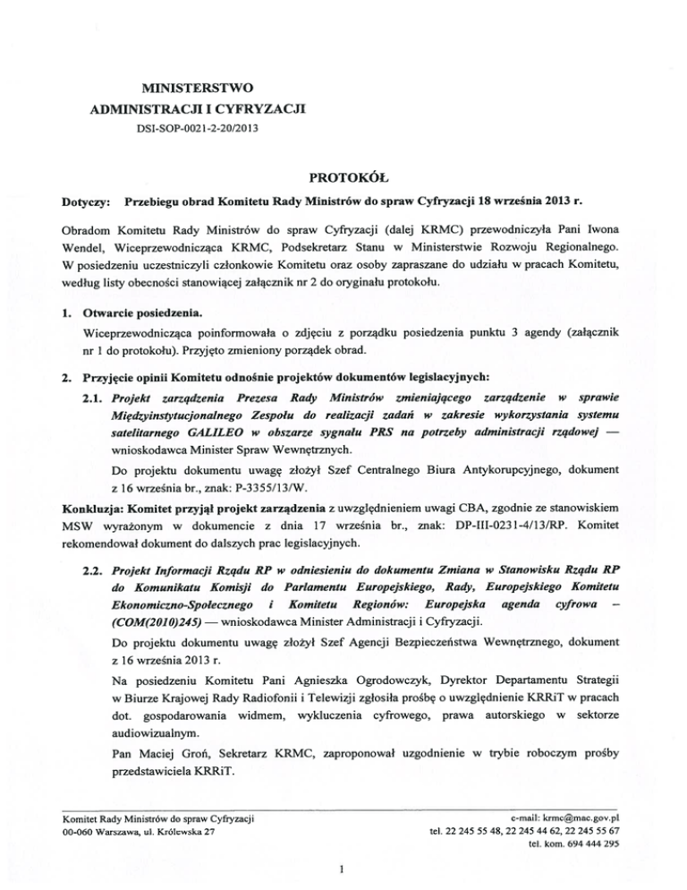 MINISTERSTWO ADMINISTRACJI I CYFRYZACJI DSI-SOP-002 1-2-20/2013 PROTOKÓŁ Dotyczy: Przebiegu obrad Komitetu Rady Ministrów do spraw Cyfryzacji 18 września 2013 r. Obradom Komitetu Rady Ministrów do spraw Cyfryzacji (dalej KRMC) przewodniczyła Pani Iwona Wendel, Wiceprzewodnicząca KRMC, Podsekretarz Stanu w Ministerstwie Rozwoju Regionalnego. W posiedzeniu uczestniczyli członkowie Komitetu oraz osoby zapraszane do udziału w pracach Komitetu, według listy obecności stanowiącej załącznik nr 2 do oryginału protokołu. 1. Otwarcie posiedzenia. Wiceprzewodnicząca poinformowała o zdjęciu z porządku posiedzenia punktu 3 agendy (załącznik nr 1 do protokołu). Przyjęto zmieniony porządek obrad. 2. Przyjęcie opinii Komitetu odnośnie projektów dokumentów legislacyjnych: 2.1. Projekt zarządzenia Prezesa Rady Ministrów zmieniającego zarządzenie w sprawie Międzyinstytucjonalnego Zespołu do realizacji zadań w zakresie wykorzystania systemu satelitarnego GALILEO w obszarze sygnału PRS na potrzeby administracji rządowej — wnioskodawca Minister Spraw Wewnętrznych. Do projektu dokumentu uwagę złożył Szef Centralnego Biura Antykorupcyjnego, dokument z 16 września br., znak: P-3355/13/W. Konkluzja: Komitet przyjął projekt zarządzenia z uwzględnieniem uwagi CBA, zgodnie ze stanowiskiem MSW wyrażonym w dokumencie z dnia 17 września br., znak: DP-łII-023 1-4/13/RP. Komitet rekomendował dokument do dalszych prac legislacyjnych. 2.2. Projekt Informacji Rządu RP w odniesieniu do dokumentu Zmiana w Stanowisku Rządu RP do Komunikatu Komisji do Parlamentu Europejskiego, Rady, Europejskiego Komitetu Ekonomiczno-Społecznego i Komitetu Regionów: Europejska agenda cyfrowa — (COM(2010)245) — wnioskodawca Minister Administracji i Cyfryzacji. Do projektu dokumentu uwagę złożył Szef Agencji Bezpieczeństwa Wewnętrznego, dokument z 16 września 2013 r. Na posiedzeniu Komitetu Pani Agnieszka Ogrodowczyk, Dyrektor Departamentu Strategii w Biurze Krajowej Rady Radiofonii i Telewizji zgłosiła prośbę o uwzględnienie KRRiT w pracach dot. gospodarowania widmem, wykluczenia cyfrowego, prawa autorskiego w sektorze audiowizualnym. Pan Maciej Groń, Sekretarz KRMC, zaproponował uzgodnienie w trybie roboczym prośby przedstawiciela KRRiT. Komitet Rady Ministrów do spraw Cyfryzacji 00.060 Warszawa, ul. Królewska 27 e-mail: krmcmae.goy.pl tel. 22 245 55 48, 22 245 44 62. 22 245 55 67 tel. kom. 694 444 295 Konkluzja: Komitet przyjął projekt dokumentu. Uwagi ABW zostały uzgodnione, zgodnie ze stanowiskiem MAC wyrażonym w dokumencie z 17 września br., znak DSI-WSE-0811-1-6/2013. Komitet rekomendował rozpatrzenie projektu przez Komitet do Spraw Europejskich. 3. Przegląd stanu realizacji projektów w ramach 7. osi priorytetowej PO IG. Punkt został zdjęty z porządku obrad. 4. Sprawy różne. Pan Michał Boni, Przewodniczący KRMC, Minister Administracji i Cyfryzacji zaproponował, aby na kolejnym posiedzeniu 2 października br. zostały omówione: a) tematy, planowane do skierowania, jako polskie propozycje do debaty na najbliższym spotkaniu Rady Europejskiej 24 i 25 października br., poświęconemu m.in. Europejskiej Agendzie Cyfrowej: • projekt ogólnego rozporządzenia o ochronie danych osobowych, • zmniejszenie stawek VAT na e-booki, • zagadnienia dot. europejskiego jednolitego rynku łączności elektronicznej; b) projekt Programu Zintegrowanej Informatyzacji Państwa. 5. Zamknięcie posiedzenia. Wiceprzewodnicząca KRMC podziękowała Uczestnikom za udział i zamknęła posiedzenie. Termin kolejnego posiedzenia wyznaczono na 2 października br. o godz. 13.00. Wiceprzewodnicząca Komitetu Rady Ministrów do spraw Cyfryzacji Iwona Wendel Sekretarz Komitetu Rady Ministrów do spraw Cyfryzacji Maciej Groń // Y, 7 e-mail: krmcmac.goy.pJ 22 245 44 62, 22 245 55 67 tel. 22 245 55 48. tel. kom. 694 444 295 Komitet Rady Ministrów do spraw Cyfryzacji OO-060 Warszawa, ul. Królewska 27 2 Załącznik nr 1 AGENDA POSIEDZENIA KOMITETU RADY MINISTRÓW DO SPRAW CYFRYZACJI 18 września 2013 r., godzina 1100 Ministerstwo Administracji i Cyfryzacji, ni. Królewska 27, Sala 217 1. Otwarcie posiedzenia. 2. Przyjęcie opinii Komitetu odnośnie projektów dokumentów: 2.1. Projekt zarządzenia Prezesa Rady Ministrów zmieniającego zarządzenie w sprawie Międzyinstytucjonainego Zespołu do realizacji zadań w zakresie wykorzystania systemu satelitarnego GALILEO w obszarze sygnału PRS na potrzeby administracji rządowej wnioskodawca Minister Spraw Wewnętrznych. — 2.2. Projekt Informacji Rządu RP w odniesieniu do dokumentu Zmiana w Stanowisku Rządu RP do Komunikatu Komisji do Parlamentu Europejskiego, Rady, Europejskiego Komitetu Ekonomiczno-Społecznego i Komitetu Regionów: Europejska agenda cyfrowa wnioskodawca Minister Administracji i Cyfryzacji. (COM(2010)245) — — 3. Przegląd stanu realizacji projektów w ramach 7. osi priorytetowej PO IG: platforma komunikacyjna obszaru zabezpieczenia spoleczn ego 2.3. Emp®tia Ministerstwo Pracy i Polityki Społecznej. Ministerstwo 2.4. ePUIP 2 Informatycznych. - Administracji i Cyfiyzacji, Rntunkowego Cyfyzacji, Centrum Projektów Informatycznych. Sytcm „—„„ anal,. n1 EJ D,jpdpmjpnja A .P TV Centrum Projektów Ministerstwo Admniistracji i 4. Sprawy różne. 5. Zamknięcie posiedzenia. e-mail: krmcmac.goyp1 tel. 22 245 55 48, 22 245 44 62, 22 245 55 67 tel. kom. 694 444 295 Komitet Rady Ministrów do spraw Cyfryzacj i OO-060 Warszawa, ul. Królewska 27 3
