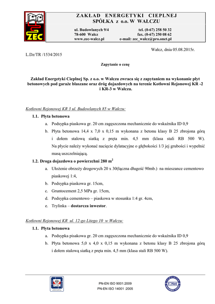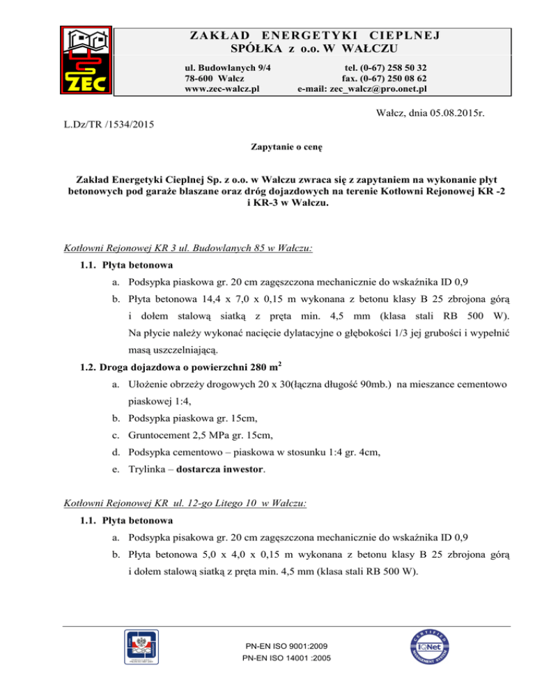 ZAKŁAD ENERGETYKI CIEPLNEJ SPÓŁKA z o.o. W WAŁCZU ul. Budowlanych 9/4 78-600 Wałcz www.zec-walcz.pl tel. (0-67) 258 50 32 fax. (0-67) 250 08 62 e-mail: [email protected] Wałcz, dnia 05.08.2015r. L.Dz/TR /1534/2015 Zapytanie o cenę Zakład Energetyki Cieplnej Sp. z o.o. w Wałczu zwraca się z zapytaniem na wykonanie płyt betonowych pod garaŜe blaszane oraz dróg dojazdowych na terenie Kotłowni Rejonowej KR -2 i KR-3 w Wałczu. Kotłowni Rejonowej KR 3 ul. Budowlanych 85 w Wałczu: 1.1. Płyta betonowa a. Podsypka piaskowa gr. 20 cm zagęszczona mechanicznie do wskaźnika ID 0,9 b. Płyta betonowa 14,4 x 7,0 x 0,15 m wykonana z betonu klasy B 25 zbrojona górą i dołem stalową siatką z pręta min. 4,5 mm (klasa stali RB 500 W). Na płycie naleŜy wykonać nacięcie dylatacyjne o głębokości 1/3 jej grubości i wypełnić masą uszczelniającą. 1.2. Droga dojazdowa o powierzchni 280 m2 a. UłoŜenie obrzeŜy drogowych 20 x 30(łączna długość 90mb.) na mieszance cementowo piaskowej 1:4, b. Podsypka piaskowa gr. 15cm, c. Gruntocement 2,5 MPa gr. 15cm, d. Podsypka cementowo – piaskowa w stosunku 1:4 gr. 4cm, e. Trylinka – dostarcza inwestor. Kotłowni Rejonowej KR ul. 12-go Litego 10 w Wałczu: 1.1. Płyta betonowa a. Podsypka pisakowa gr. 20 cm zagęszczona mechanicznie do wskaźnika ID 0,9 b. Płyta betonowa 5,0 x 4,0 x 0,15 m wykonana z betonu klasy B 25 zbrojona górą i dołem stalową siatką z pręta min. 4,5 mm (klasa stali RB 500 W). PN-EN ISO 9001:2009 PN-EN ISO 14001 :2005 ZAKŁAD ENERGETYKI CIEPLNEJ SPÓŁKA z o.o. W WAŁCZU ul. Budowlanych 9/4 78-600 Wałcz www.zec-walcz.pl tel. (0-67) 258 50 32 fax. (0-67) 250 08 62 e-mail: [email protected] 1.2. Droga dojazdowa o powierzchni 26 m2 a. UłoŜenie obrzeŜy drogowych 20 x 30 (łączna długość 15mb.) na mieszance cementowo piaskowej 1:4, b. Podsypka piaskowa gr. 10 zagęszczona mechanicznie w przypadku gruntów gliniastych podsypkę wykonać o grubości warstwy 15cm, c. Podbudowa z betonu B15 gr. 15cm, d. Podsypka cementowo – piaskowa w stosunku 1:4 gr. 4cm, e. Kostka betonowa gr. 8cm. Na niŜej wymienionych warunkach handlowych: 1) Płyty pod garaŜe naleŜ wykonać do dnia 31.08.2015r. natomiast drogi dojazdowe do 19.09.2015r. 2) Ofertę cenową naleŜy złoŜyć w siedzibie zamawiającego do dnia 12.08.2015r. do godziny 1000 . 3) Ofertę cenową naleŜy przedstawić z podziałem kosztów za wykonanie płyt i dróg dojazdowych na kaŜdą z kotłowni. 4) Inwestor powoła inspektora nadzoru. 5) Zamawiający zastrzega sobie prawo do przeprowadzenia negocjacji cenowych z wybranym przez siebie wykonawcą. 6) Zamawiający zastrzega sobie prawo do przerwania postępowania bez podania przyczyny. 7) Płatność: przelew do 30 dni po otrzymaniu faktury. Podpis na oryginale Osoba uprawniona do kontaktów – Jarosław Piwiński – 785 900 228 PN-EN ISO 9001:2009 PN-EN ISO 14001 :2005