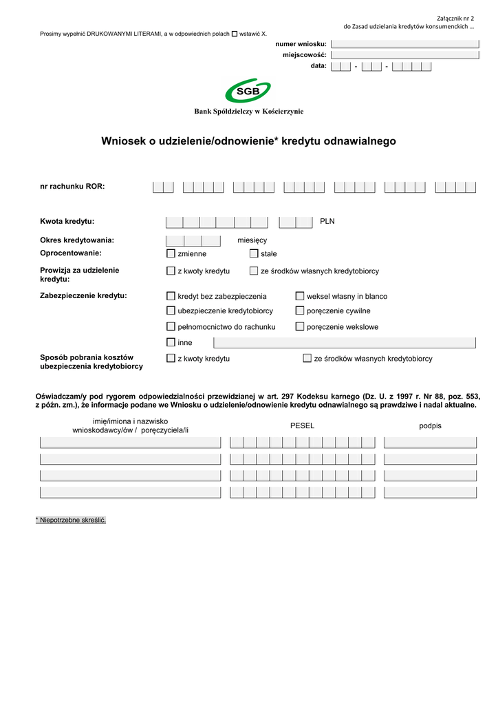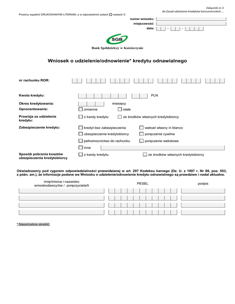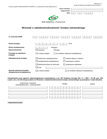 Załącznik nr 2 do Zasad udzielania kredytów konsumenckich … Prosimy wypełnić DRUKOWANYMI LITERAMI, a w odpowiednich polach wstawić X. numer wniosku: miejscowość: data: - - Bank Spółdzielczy w Kościerzynie Wniosek o udzielenie/odnowienie* kredytu odnawialnego nr rachunku ROR: Kwota kredytu: PLN Okres kredytowania: miesięcy Oprocentowanie: zmienne stałe Prowizja za udzielenie kredytu: z kwoty kredytu ze środków własnych kredytobiorcy Zabezpieczenie kredytu: kredyt bez zabezpieczenia weksel własny in blanco ubezpieczenie kredytobiorcy poręczenie cywilne pełnomocnictwo do rachunku poręczenie wekslowe inne Sposób pobrania kosztów ubezpieczenia kredytobiorcy z kwoty kredytu ze środków własnych kredytobiorcy Oświadczam/y pod rygorem odpowiedzialności przewidzianej w art. 297 Kodeksu karnego (Dz. U. z 1997 r. Nr 88, poz. 553, z późn. zm.), że informacje podane we Wniosku o udzielenie/odnowienie kredytu odnawialnego są prawdziwe i nadal aktualne. imię/imiona i nazwisko wnioskodawcy/ów / poręczyciela/li * Niepotrzebne skreślić. PESEL podpis