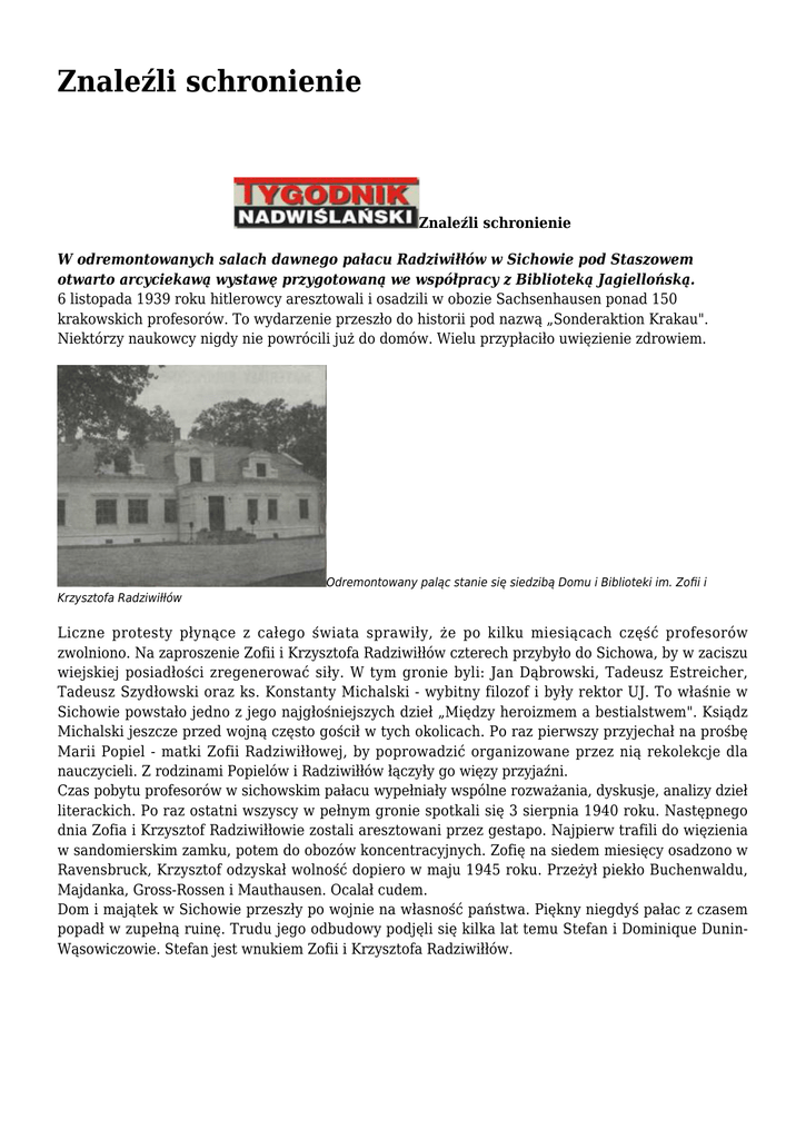 Znaleźli schronienie Znaleźli schronienie W odremontowanych salach dawnego pałacu Radziwiłłów w Sichowie pod Staszowem otwarto arcyciekawą wystawę przygotowaną we współpracy z Biblioteką Jagiellońską. 6 listopada 1939 roku hitlerowcy aresztowali i osadzili w obozie Sachsenhausen ponad 150 krakowskich profesorów. To wydarzenie przeszło do historii pod nazwą „Sonderaktion Krakau". Niektórzy naukowcy nigdy nie powrócili już do domów. Wielu przypłaciło uwięzienie zdrowiem. Odremontowany paląc stanie się siedzibą Domu i Biblioteki im. Zofii i Krzysztofa Radziwiłłów Liczne protesty płynące z całego świata sprawiły, że po kilku miesiącach część profesorów zwolniono. Na zaproszenie Zofii i Krzysztofa Radziwiłłów czterech przybyło do Sichowa, by w zaciszu wiejskiej posiadłości zregenerować siły. W tym gronie byli: Jan Dąbrowski, Tadeusz Estreicher, Tadeusz Szydłowski oraz ks. Konstanty Michalski - wybitny filozof i były rektor UJ. To właśnie w Sichowie powstało jedno z jego najgłośniejszych dzieł „Między heroizmem a bestialstwem". Ksiądz Michalski jeszcze przed wojną często gościł w tych okolicach. Po raz pierwszy przyjechał na prośbę Marii Popiel - matki Zofii Radziwiłłowej, by poprowadzić organizowane przez nią rekolekcje dla nauczycieli. Z rodzinami Popielów i Radziwiłłów łączyły go więzy przyjaźni. Czas pobytu profesorów w sichowskim pałacu wypełniały wspólne rozważania, dyskusje, analizy dzieł literackich. Po raz ostatni wszyscy w pełnym gronie spotkali się 3 sierpnia 1940 roku. Następnego dnia Zofia i Krzysztof Radziwiłłowie zostali aresztowani przez gestapo. Najpierw trafili do więzienia w sandomierskim zamku, potem do obozów koncentracyjnych. Zofię na siedem miesięcy osadzono w Ravensbruck, Krzysztof odzyskał wolność dopiero w maju 1945 roku. Przeżył piekło Buchenwaldu, Majdanka, Gross-Rossen i Mauthausen. Ocalał cudem. Dom i majątek w Sichowie przeszły po wojnie na własność państwa. Piękny niegdyś pałac z czasem popadł w zupełną ruinę. Trudu jego odbudowy podjęli się kilka lat temu Stefan i Dominique DuninWąsowiczowie. Stefan jest wnukiem Zofii i Krzysztofa Radziwiłłów. Otwarcie wystawy poświęconej pobytowi krakowskich profesorów w Sichowie. Przemawia ZOFIA Z RADZIWIŁŁÓW SKÓRZYŃSKA. Z lewej DOMIN1QUE i STEFAN DUNIN WĄSOWICZOWIE. Odrestaurowany pałac mieścił będzie bibliotekę noszącą imię ostatnich przedwojennych właścicieli tego miejsca. Prace remontowe ciągle jeszcze trwają, jednak główne skrzydło dawnej rezydencji już wygląda tak, jak w czasach świetności. To właśnie w jego wnętrzu urządzono wystawę poświęconą dziejom pobytu krakowskich profesorów w Sichowie. Na jej uroczyste otwarcie w minioną sobotę zjechali przedstawiciele władz samorządowych, środowisk naukowych i duchowieństwa. Obecni byli także Zofia z Radziwiłłów Skórzyńska i Stanisław Radziwiłł — dzieci dawnych właścicieli Sichowa. Ordynariusz diecezji sandomierskiej, ks. bp Krzysztof Nitkiewicz, odprawił mszę w intencji rektora Michalskiego i pozostałych naukowców. Ekspozycja przygotowana została wspólnie z Biblioteką Jagiellońską, którą reprezentował na ceremonii otwarcia jej dyrektor prof. Zdzisław Pietrzyk. Źródło: Tygodnik Nadwiślański nr 35 (1529); 02.09.2010r. Rafał Staszewski Gmina Rytwiany - www.rytwiany.com.pl