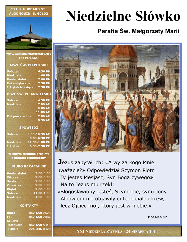 111 S. HUBBARD ST. ALGONQUIN, IL 60102 Niedzielne Słówko Parafia Św. Małgorzaty Marii www.saintmargaretmary.org PO POLSKU MSZE ŚW. PO POLSKU Sobota: Niedziela: Poniedziałek: Dni świąteczne: I Piątek Miesiąca: 6:30 1:00 7:00 7:30 7:30 PM PM PM PM PM MSZE ŚW. PO ANGIELSKU Sobota: Niedziela: Dni powszednie: 4:30 7:00 9:00 11:00 7:00 8:30 PM AM AM AM AM AM SPOWIEDŹ Sobota: Niedziela: I Piątek: 9:00-10:30 AM 6:00-6:30 PM 12:30-1:00 PM 6:30-7:30 PM W innym terminie prosimy o kontakt telefoniczny BIURO PARAFIALNE Poniedziałek: Wtorek: Środa: Czwartek: Piątek: Sobota: Niedziela: 9:00-5:00 9:00-5:00 9:00-5:00 9:00-5:00 9:00-5:00 11:00-1:00 1:00-3:00 KONTAKTY Biuro Fax Szkoły: -Katolicka -Polska 847-658 7625 847-658 7882 847-658 5313 224-436 0320 Jezus zapytał ich: «A wy za kogo Mnie uważacie?» Odpowiedział Szymon Piotr: «Ty jesteś Mesjasz, Syn Boga żywego». Na to Jezus mu rzekł: «Błogosławiony jesteś, Szymonie, synu Jony. Albowiem nie objawiły ci tego ciało i krew, lecz Ojciec mój, który jest w niebie.» Mt.16:15-17 XXI NIEDZIELA ZWYKŁA - 24 SIERPNIA 2014 Niedzielne Słówko Od Proboszcza „A wy za kogo mnie uważacie?” Skrzypek w metrze. To jest tytuł autentycznej historii, która krąży w Internecie od 2008 roku. Był styczniowy zimny poranek, mężczyzna usiadł na stacji metra w Washington DC i zaczął grać na skrzypcach. Zagrał sześć utworów Bacha przez około 45 minut. W tym czasie , ponieważ była to godzina szczytu, obliczono, że Gdy Jezus przyszedł w okolice Cezarei Filipowej, tysiąc ludzi przeszło przez stację, większość z nich pytał swych uczniów: „Za kogo ludzie uważają Syna w drodze do pracy. Człowieczego?”. Trzy minuty upłynęły zanim mężczyzna, w średnim wieku zorientował się, że skrzypek gra. Zwolnił swój krok, A oni odpowiedzieli: „Jedni za Jana Chrzciciela, inni zatrzymał się na kilka sekund, a następnie pospieszył za Eliasza, jeszcze inni za Jeremiasza albo za w swoją stronę. jednego z proroków”. Jezus zapytał ich: „A wy za Minutę później skrzypek otrzymał napiwek od kobiety, kogo Mnie uważacie?”. która nie zatrzymując się wrzuciła pieniążki do pudełka. Kilka minut później, ktoś oparł się o ścianę, aby go Odpowiedział Szymon Piotr: „Ty jesteś Mesjaszem, posłuchać, ale mężczyzna zerknął na zegarek i ruszył dalej Synem Boga żywego”. w drogę. Najwidoczniej był spóźniony do pracy. Jedynym, co najwięcej uwagi poświęcił był 3 letni chłopiec. Na to Jezus mu rzekł: „Błogosławiony jesteś, Matka prowadziła go pośpiesznie, ale dzieciak i tak przystaSzymonie, synu Jony. Albowiem ciało i krew nie nął, aby popatrzeć na skrzypka. W końcu pociągnęła go mocniej i chłopiec zaczął iść dalej, obracając głowę cały objawiły ci tego, lecz Ojciec mój, który jest czas za siebie. Ta scena powtórzyła się kilkakrotnie z inny- w niebie. Otóż i Ja tobie powiadam: Ty jesteś Piotr – mi dziećmi. Wszyscy rodzice, bez wyjątku, zmusili je do Opoka i na tej opoce zbuduję mój Kościół, a bramy pójścia dalej. piekielne go nie przemogą. I tobie dam klucze Skrzypek grał przez 45 minut i tylko 6 osób zatrzymało się, królestwa niebieskiego; cokolwiek zwiążesz na zieaby posłuchać gry przez chwilę. Około 20 dało mu pieniążki mi, będzie związane w niebie, a co rozwiążesz na bez zatrzymania się, podążając swoim krokiem. Zebrał 32 dolary. Kiedy skończył grać i cisza znów zapanowała, nikt ziemi, będzie rozwiązane w niebie”. nie zauważył tego. Nikt nie oklaskiwał, z nikąd nie było też Wtedy przykazał uczniom, aby nikomu nie mówili, uznania. Nikt nie wiedział, że skrzypkiem grającym był Joshua Bell, że On jest Mesjaszem. jeden z najlepszych na świecie muzyków. Grał jeden z najbardziej skomplikowanych utworów, jaki kiedykolwiek napisano, na skrzypcach wartych 3.5 miliona dolarów. Dwa dni wcześniej, w Bostońskim teatrze, bilety na koncert Joshua Bell, zostały wysprzedane; średnia biletu wynosiła 100 dolarów. Jednym z wielu możliwych wniosków z tego doświadczenia może być: Jeżeli nie mamy czasu, aby się zatrzymać i posłuchać jednego z najwybitniejszych światowych muzyków grających najlepszą muzykę jakąkolwiek napisano, ile innych rzeczy nas omija? Słowa Ewangelii wg św. Mateusza 16, 13 - 20 Widzimy, że w dzisiejszej Ewangelii uczniowie z łatwością odpowiadają na pierwsze pytanie postawione im przez Jezusa: „ Za kogo ludzie uważają Syna Człowieczego?” Jednak, kiedy Jezus pyta ich : „A wy za kogo mnie uważacie?”. Wtedy zapada cisza i tylko św. Piotr z pomocą Ducha Świętego odpowiada : „ Ty jesteś Mesjaszem, Synem Boga Żywego”. A co z nami, jaka jest nasz odpowiedź? Na pewno, aby odpowiedzieć szczerze i prawdziwie na to pytanie, musimy się przyjrzeć naszej relacji do Chrystusa. Jeśli chcemy, aby ta odpowiedź była podobna do Piotrowej, wtedy nasza przyjaźń z Chrystusem musi być głęboka i żywa. Historia o skrzypku na stacji metra w godzinie szczytu, pokazuje nam jak bardzo zajęci jesteśmy zwykłymi obowiązkami dnia, że ciężko nam znaleźć czas na inne ważne rzeczy . Również podobnie jest ze znalezieniem czasu na pogłębianie naszej wiary i przyjaźni z Chrystusem. Postarajmy się w nadchodzącym tygodniu poprzez modlitwę i powznoszenie naszej myśli ku Bogu odpowiedzieć sobie na Chrystusowe pytanie. Czy jest On dla mnie Mesjaszem, Synem Boga Żywego? Czy Jezus jest moim Zbawicielem, któremu zawierzam moje życie każdego dnia? Czy inni patrząc na moje życie mogą zauważyć, że jestem przyjacielem Jezusa? Niech Duch Święty prowadzi nas i pomoże nam odpowiedzieć na Chrystusowe pytanie z wiarą i żarliwą miłością dla Jezusa. Fr. Peter Sarnicki, OFM, Conv Niedzielne Słówko Ogłoszenia W poniedziałek 25-go sierpnia zapraszamy na Mszę Św. o 7 wieczorem i nabożeństwo eucharystyczne. W przyszłą niedzielę 31-go sierpnia 