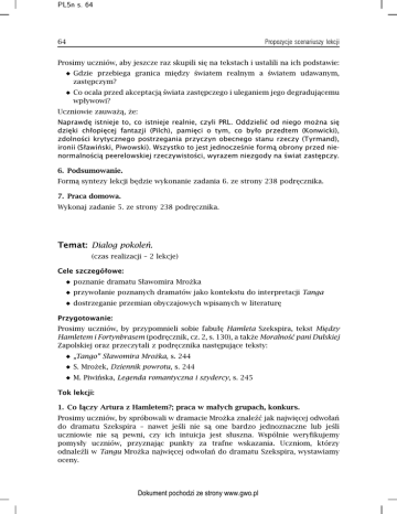 PL5n s. 64 64 Propozycje scenariuszy lekcji Prosimy uczniów, aby jeszcze raz skupili się na tekstach i ustalili na ich podstawie: Gdzie przebiega granica między światem realnym a światem udawanym, zastępczym? Co ocala przed akceptacją świata zastępczego i uleganiem jego degradującemu wpływowi? Uczniowie zauważą, że: Naprawdę istnieje to, co istnieje realnie, czyli PRL. Oddzielić od niego można się dzięki chłopięcej fantazji (Pilch), pamięci o tym, co było przedtem (Konwicki), zdolności krytycznego postrzegania przyczyn obecnego stanu rzeczy (Tyrmand), ironii (Sławiński, Piwowski). Wszystko to jest jednocześnie formą obrony przed nienormalnością peerelowskiej rzeczywistości, wyrazem niezgody na świat zastępczy. 6. Podsumowanie. Formą syntezy lekcji będzie wykonanie zadania 6. ze strony 238 podręcznika. 7. Praca domowa. Wykonaj zadanie 5. ze strony 238 podręcznika. Temat: Dialog pokoleń. (czas realizacji – 2 lekcje) Cele szczegółowe: poznanie dramatu Sławomira Mrożka przywołanie poznanych dramatów jako kontekstu do interpretacji Tanga dostrzeganie przemian obyczajowych wpisanych w literaturę Przygotowanie: Prosimy uczniów, by przypomnieli sobie fabułę Hamleta Szekspira, tekst Między Hamletem i Fortynbrasem (podręcznik, cz. 2, s. 130), a także Moralność pani Dulskiej Zapolskiej oraz przeczytali z podręcznika następujące teksty: „Tango” Sławomira Mrożka, s. 244 S. Mrożek, Dziennik powrotu, s. 244 M. Piwińska, Legenda romantyczna i szydercy, s. 245 Tok lekcji: 1. Co łączy Artura z Hamletem?; praca w małych grupach, konkurs. Prosimy uczniów, by spróbowali w dramacie Mrożka znaleźć jak najwięcej odwołań do dramatu Szekspira – nawet jeśli nie są one bardzo jednoznaczne lub jeśli uczniowie nie są pewni, czy ich intuicja jest słuszna. Wspólnie weryfikujemy pomysły uczniów, przyznając punkty za trafne wskazania. Uczniom, którzy odnaleźli w Tangu Mrożka najwięcej odwołań do dramatu Szekspira, wystawiamy oceny. Dokument pochodzi ze strony www.gwo.pl PL5n s. 65 65 Propozycje scenariuszy lekcji Przykładowe wypowiedzi uczniów: Tango Hamlet dramat o rodzinie matka Artura zdradza męża Ala kocha Artura bez wzajemności Stomil przeprowadza eksperymenty Artur namawia Stomila, by zabił Edka i zmył jego krwią piętno rogacza Edek przejmuje władzę przy użyciu siły dramat o rodzinie Hamlet oskarża matkę o zdradę zmarłego męża z jego zabójcą Hamlet odpycha Ofelię Na dworze występuje trupa aktorska duch ojca żąda od Hamleta zemsty na swoim zabójcy władzę przejmuje Fortynbras, którego imię znaczy „mąż silnej ręki” 2. Co łączy Hamleta, Tango i Moralność pani Dulskiej?; rozmowa pod kierunkiem nauczyciela. Warto pokazać uczniom wybrane fragmenty inscenizacji Hamleta, Moralności pani Dulskiej, Tanga oraz fragment Ferdydurke w reżyserii Wojtyszki w Teatrze Starym w Krakowie. Ważne jest takie dobranie scen, aby dotyczyły podobnych sytuacji, np. rozmowy bohaterów z matką (z inscenizacji Ferdydurke proponuję wybrać fragment rozmowy Młodziaków na temat nowoczesnego macierzyństwa). Zwracamy uwagę uczniów na różnice w sposobie przedstawiania rzeczywistości w każdym z dramatów. (Ferdydurke nie jest wprawdzie dramatem, ale adaptację teatralną tego utworu możemy potraktować jako tekst dramatyczny). Uczniowie zauważą, że: Monumentalny Hamlet jest tragedią rodziny i zarazem całego państwa. Rozumiemy prawa, które panują w świecie Hamleta, rozumiemy porządek wydarzeń i relacje zachodzące między ludźmi itp. Dramat Zapolskiej jest komedią – Dulscy śmieszą, ale też przerażają. Rozumiemy porządek wydarzeń w dramacie i prawa, którymi się rządzą Dulscy, relacje między nimi, chociaż nie akceptujemy ich moralności oraz świata ich wartości. Młodziakowie są absurdalni – nie rozumiemy ich sposobu myślenia. Relacje między nimi są dla nas niejasne. Rzeczywistość Tanga jest bliższa rzeczywistości, w której żyją Młodziakowie. Jest to świat chaosu, w którym porządek został zakłócony. Nie rozumiemy praw, którymi się rządzi rodzina Artura ani ich wzajemnych relacji. 3. Wnioski. Dramat rodzinny może być wskaźnikiem kondycji społeczeństwa i przemian, które w nim zachodzą. Przemiany w rodzinie wskazują na przemiany w świecie. Dokument pochodzi ze strony www.gwo.pl