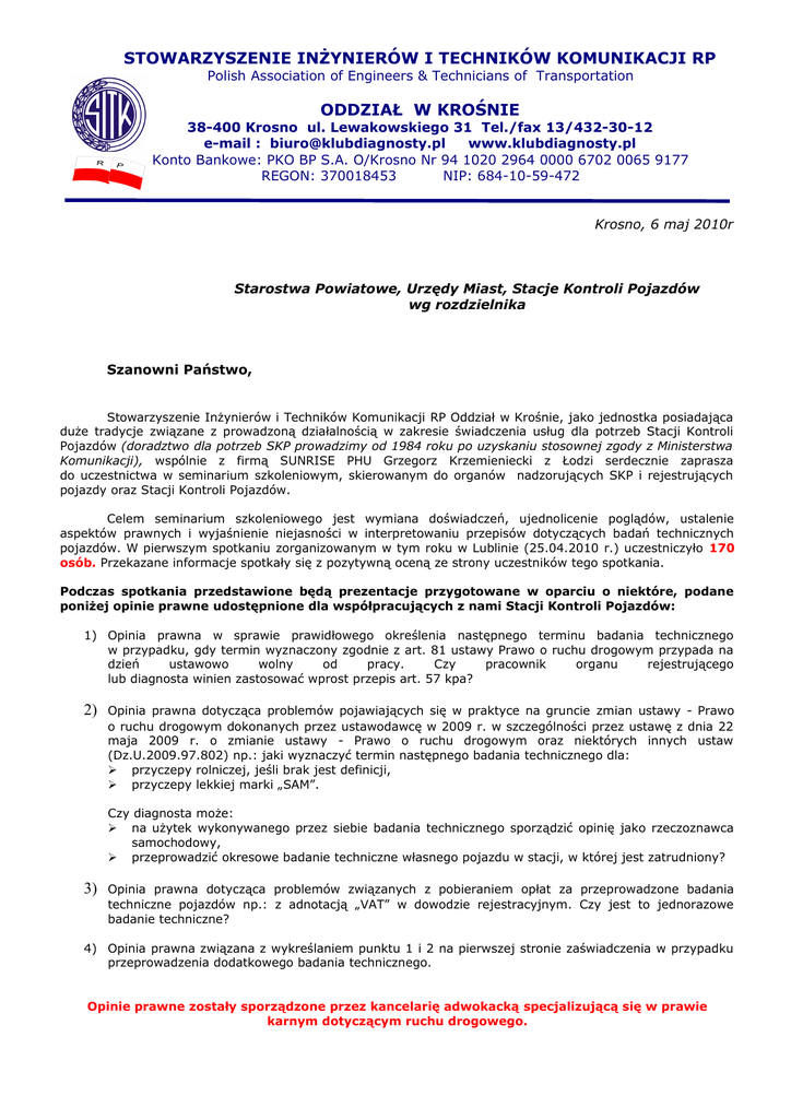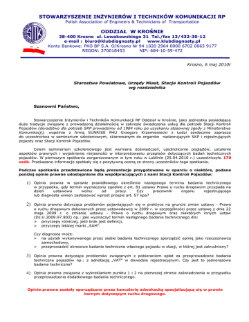 STOWARZYSZENIE INŻYNIERÓW I TECHNIKÓW KOMUNIKACJI RP Polish Association of Engineers & Technicians of Transportation ODDZIAŁ W KROŚNIE 38-400 Krosno ul. Lewakowskiego 31 Tel./fax 13/432-30-12 e-mail : [email protected] www.klubdiagnosty.pl Konto Bankowe: PKO BP S.A. O/Krosno Nr 94 1020 2964 0000 6702 0065 9177 REGON: 370018453 NIP: 684-10-59-472 Krosno, 6 maj 2010r Starostwa Powiatowe, Urzędy Miast, Stacje Kontroli Pojazdów wg rozdzielnika Szanowni Państwo, Stowarzyszenie Inżynierów i Techników Komunikacji RP Oddział w Krośnie, jako jednostka posiadająca duże tradycje związane z prowadzoną działalnością w zakresie świadczenia usług dla potrzeb Stacji Kontroli Pojazdów (doradztwo dla potrzeb SKP prowadzimy od 1984 roku po uzyskaniu stosownej zgody z Ministerstwa Komunikacji), wspólnie z firmą SUNRISE PHU Grzegorz Krzemieniecki z Łodzi serdecznie zaprasza do uczestnictwa w seminarium szkoleniowym, skierowanym do organów nadzorujących SKP i rejestrujących pojazdy oraz Stacji Kontroli Pojazdów. Celem seminarium szkoleniowego jest wymiana doświadczeń, ujednolicenie poglądów, ustalenie aspektów prawnych i wyjaśnienie niejasności w interpretowaniu przepisów dotyczących badań technicznych pojazdów. W pierwszym spotkaniu zorganizowanym w tym roku w Lublinie (25.04.2010 r.) uczestniczyło 170 osób. Przekazane informacje spotkały się z pozytywną oceną ze strony uczestników tego spotkania. Podczas spotkania przedstawione będą prezentacje przygotowane w oparciu o niektóre, podane poniżej opinie prawne udostępnione dla współpracujących z nami Stacji Kontroli Pojazdów: 1) Opinia prawna w sprawie prawidłowego określenia następnego terminu badania technicznego w przypadku, gdy termin wyznaczony zgodnie z art. 81 ustawy Prawo o ruchu drogowym przypada na dzień ustawowo wolny od pracy. Czy pracownik organu rejestrującego lub diagnosta winien zastosować wprost przepis art. 57 kpa? 2) Opinia prawna dotycząca problemów pojawiających się w praktyce na gruncie zmian ustawy - Prawo o ruchu drogowym dokonanych przez ustawodawcę w 2009 r. w szczególności przez ustawę z dnia 22 maja 2009 r. o zmianie ustawy - Prawo o ruchu drogowym oraz niektórych innych ustaw (Dz.U.2009.97.802) np.: jaki wyznaczyć termin następnego badania technicznego dla: przyczepy rolniczej, jeśli brak jest definicji, przyczepy lekkiej marki „SAM”. Czy diagnosta może: na użytek wykonywanego przez siebie badania technicznego sporządzić opinię jako rzeczoznawca samochodowy, przeprowadzić okresowe badanie techniczne własnego pojazdu w stacji, w której jest zatrudniony? 3) Opinia prawna dotycząca problemów związanych z pobieraniem opłat za przeprowadzone badania techniczne pojazdów np.: z adnotacją „VAT” w dowodzie rejestracyjnym. Czy jest to jednorazowe badanie techniczne? 4) Opinia prawna związana z wykreślaniem punktu 1 i 2 na pierwszej stronie zaświadczenia w przypadku przeprowadzenia dodatkowego badania technicznego. Opinie prawne zostały sporządzone przez kancelarię adwokacką specjalizującą się w prawie karnym dotyczącym ruchu drogowego. Uczestnicy spotkania zostaną również zapoznani z następującymi tematami: 1) 2) 3) 4) 5) 6) 7) 8) Omówienie współpracy SITK RP z Krosna ze stacjami kontroli pojazdów w zakresie: a) świadczenia dodatkowych usług związanych z prawidłowym ich funkcjonowaniem w oparciu o obowiązujące akty prawne, b) działalności lobbingowej i doradczej. Kompetencje oraz proces otrzymania tytułu Rzeczoznawcy: a) Rzeczoznawca Stowarzyszenia Inżynierów i Techników Komunikacji Rzeczpospolitej Polskiej, b) Rzeczoznawca posiadający wpis na listę Ministra Infrastruktury. Zmiana rodzaju pojazdu ciężarowego kategorii: a) N1 na M1 osobowy, b) N2 na autobus kat M2 i M3. Program SKP PRO i czytnik kodów kreskowych dwuwymiarowych wraz z oprogramowaniem, w zakresie jego możliwości odczytania danych zawartych w dowodach rejestracyjnych. Omówienie najważniejszych problemów po zmianie przepisów w sprawie: a) określania terminu następnego badania technicznego, dla poszczególnych rodzajów pojazdów, b) zakresu i sposobu przeprowadzania badań technicznych pojazdów oraz wzorów dokumentów stosowanych przy tych badaniach (m. innymi zmiana atrybutów pojazdów: „TAXI”, nauki jazdy, pojazd zasilany gazem, pojazd uprzywilejowany itp.) c) wysokości opłat związanych z przeprowadzaniem badań technicznych pojazdów (m. innymi pojazd „TAXI”, pojazd nauki jazdy, pojazd uprzywilejowany itp.) Wyrok Sądu Administracyjnego dotyczącego osoby, która ukończyła szkolenie dla diagnostów przed 2004 rokiem starającej się o uprawnienia diagnosty. Czy jest konieczne ponowne szkolenie i zdawanie egzaminu? Reguły postępowania ewidencjonowania okresowego badania technicznego zakończonego wynikiem negatywnym. Omówienie procedury uruchomienia w Stacji Kontroli Pojazdów środowiska do przekazywania danych o wykonanych badaniach technicznych pojazdów z SKP do Centralnej Ewidencji Pojazdów i Kierowców w trybie bezpośredniej teletransmisji. Każda osoba uczestnicząca w spotkaniu otrzyma wniosek o wygenerowanie certyfikatu dostępowego wraz ze wzorem jak należy wypełnić ten dokument. Świadczone przez nas usługi prowadzone są w oparciu o zatwierdzony regulamin, który został pozytywnie zaopiniowany przez Kancelarię Radców Prawnych. Stacje Kontroli Pojazdów, które z nami współpracują mają dostęp do wielu istotnych informacji związanych z działalnością SKP, o czym poinformujemy podczas spotkania. Udział w seminarium szkoleniowym jest płatny i wynosi 100 zł. Opłata, w przypadku spotkania w Sosnowcu obejmuje również wstęp na Targi Motoryzacyjne AUTO MOTO SHOW 2010 dla jednej osoby oraz miejsce parkingowe dla pojazdu. Podczas Targów Motoryzacyjnych AUTO MOTO SHOW 2010 po raz pierwszy w Polsce będzie można zobaczyć między innymi Volvo S 60, Alfa Giulietta, VW Touareg (nowy model), VW R8 
