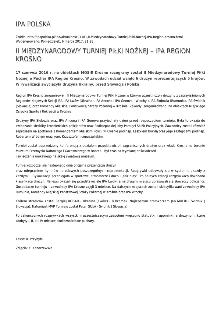 IPA POLSKA Źródło: http://ipapolska.pl/ipa/aktualnosci/1181,II-Miedzynarodowy-Turniej-Pilki-Noznej-IPA-Region-Krosno.html Wygenerowano: Poniedziałek, 6 marca 2017, 21:28 II MIĘDZYNARODOWY TURNIEJ PIŁKI NOŻNEJ – IPA REGION KROSNO 17 czerwca 2016 r. na obiektach MOSiR Krosno rozegrany został II Międzynarodowy Turniej Piłki Nożnej o Puchar IPA Region Krosno. W zawodach udział wzięło 6 drużyn reprezentujących 5 krajów. W rywalizacji zwyciężyła drużyna Ukrainy, przed Słowacją i Polską. Region IPA Krosno zorganizował II Międzynarodowy Turniej Piłki Nożnej w którym uczestniczyły drużyny z zaprzyjaźnionych Regionów Krajowych Sekcji IPA: IPA Lwów (Ukraina), IPA Ancona i IPA Genova (Włochy ), IPA Slobozia (Rumunia), IPA Swidnik (Słowacja) oraz Komendy Miejskiej Państwowej Straży Pożarnej w Krośnie. Zawody zorganizowano na obiektach Miejskiego Ośrodka Sportu i Rekreacji w Krośnie. Drużyny IPA Slobozia oraz IPA Ancona i IPA Genova przyjechały dzień przed rozpoczęciem turnieju. Była to okazja do zwiedzania siedziby krośnieńskich policjantów oraz Podkarpackiej Izby Pamięci Służb Policyjnych. Zawodnicy zostali również zaproszeni na spotkanie z Komendantem Miejskim Policji w Krośnie podinsp. Leszkiem Buryłą oraz jego zastępcami podinsp. Robertem Wróblem oraz kom. Krzysztofem Łopuszańskim. Turniej został poprzedzony konferencją z udziałem przedstawicieli zagranicznych drużyn oraz władz Krosna na terenie Muzeum Przemysłu Naftowego i Gazowniczego w Bóbrce. Był czas na wymianę doświadczeń i zwiedzania unikalnego na skalę światową muzeum. Turniej rozpoczął się następnego dnia oficjalną prezentacją drużyn oraz odegraniem hymnów narodowych poszczególnych reprezentacji. Rozgrywki odbywały się w systemie „każdy z każdym”. Rywalizacja przebiegała w sportowej atmosferze i duchu „fair play”. Po pełnych emocji rozgrywkach dokonano klasyfikacji drużyn. Najlepsi okazali się przedstawiciele IPA Lwów, a na drugim miejscu uplasowali się słowaccy policjanci. Gospodarze turnieju – zawodnicy IPA Krosno zajęli 3 miejsce. Na dalszych miejscach zostali sklasyfikowani zawodnicy IPA Rumunia, Komendy Miejskiej Państwowej Straży Pożarnej w Krośnie oraz IPA Włochy. Królem strzelców został Sergiej KOSAR - Ukraina (Lwów) - 8 bramek. Najlepszym bramkarzem Jan MULIK - Svidnik ( Słowacja). Natomiast MVP Turnieju został Peter GULA - Svidnik ( Słowacja). Po zakończonych rozgrywkach wszystkim uczestniczącym zespołom wręczono statuetki i upominki, a drużynom, które zdobyły I, II, III i IV miejsce okolicznościowe puchary. Tekst: R. Przybyła Zdjęcia: K. Konarzewska Ocena: 0/5 (0) Tweetnij