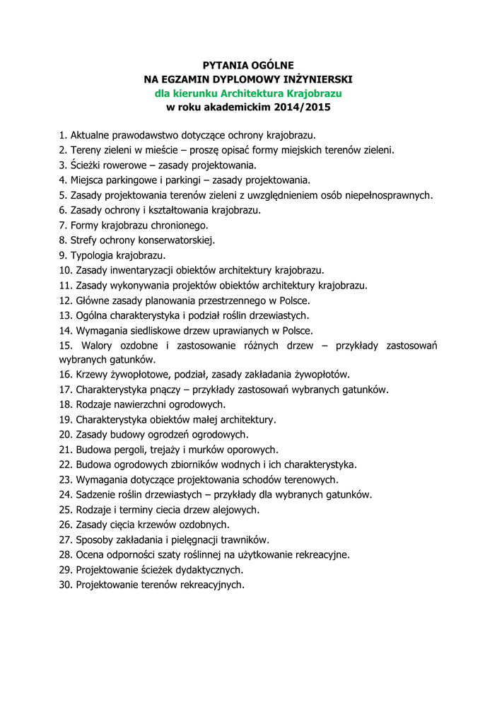 PYTANIA OGÓLNE NA EGZAMIN DYPLOMOWY INŻYNIERSKI dla kierunku Architektura Krajobrazu w roku akademickim 2014/2015 1. Aktualne prawodawstwo dotyczące ochrony krajobrazu. 2. Tereny zieleni w mieście – proszę opisać formy miejskich terenów zieleni. 3. Ścieżki rowerowe – zasady projektowania. 4. 5. 6. 7. 8. Miejsca parkingowe i parkingi – zasady projektowania. Zasady projektowania terenów zieleni z uwzględnieniem osób niepełnosprawnych. Zasady ochrony i kształtowania krajobrazu. Formy krajobrazu chronionego. Strefy ochrony konserwatorskiej. 9. Typologia krajobrazu. 10. Zasady inwentaryzacji obiektów architektury krajobrazu. 11. Zasady wykonywania projektów obiektów architektury krajobrazu. 12. Główne zasady planowania przestrzennego w Polsce. 13. Ogólna charakterystyka i podział roślin drzewiastych. 14. Wymagania siedliskowe drzew uprawianych w Polsce. 15. Walory ozdobne i zastosowanie różnych drzew – przykłady zastosowań wybranych gatunków. 16. Krzewy żywopłotowe, podział, zasady zakładania żywopłotów. 17. Charakterystyka pnączy – przykłady zastosowań wybranych gatunków. 18. 19. 20. 21. 22. Rodzaje nawierzchni ogrodowych. Charakterystyka obiektów małej architektury. Zasady budowy ogrodzeń ogrodowych. Budowa pergoli, trejaży i murków oporowych. Budowa ogrodowych zbiorników wodnych i ich charakterystyka. 23. 24. 25. 26. 27. Wymagania dotyczące projektowania schodów terenowych. Sadzenie roślin drzewiastych – przykłady dla wybranych gatunków. Rodzaje i terminy ciecia drzew alejowych. Zasady cięcia krzewów ozdobnych. Sposoby zakładania i pielęgnacji trawników. 28. Ocena odporności szaty roślinnej na użytkowanie rekreacyjne. 29. Projektowanie ścieżek dydaktycznych. 30. Projektowanie terenów rekreacyjnych.