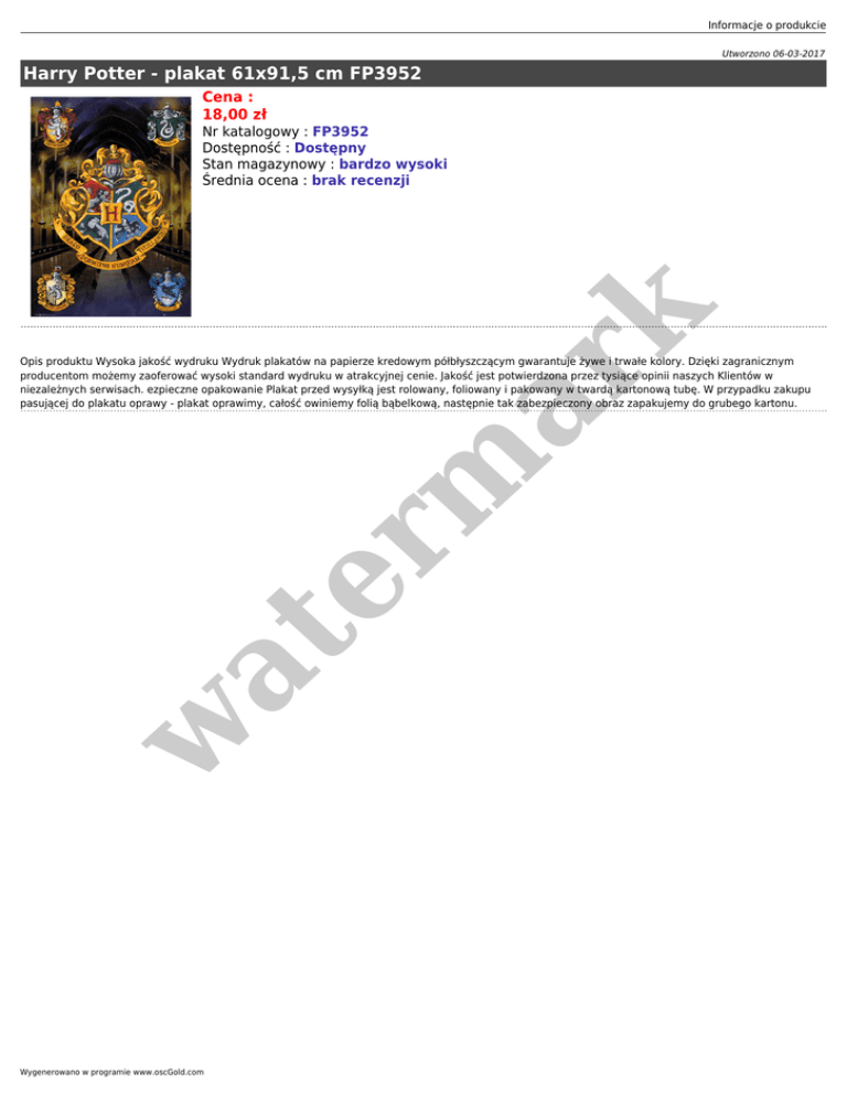 Informacje o produkcie Utworzono 06-03-2017 Harry Potter - plakat 61x91,5 cm FP3952 Cena : 18,00 zł er m ar k Nr katalogowy : FP3952 Dostępność : Dostępny Stan magazynowy : bardzo wysoki Średnia ocena : brak recenzji w at Opis produktu Wysoka jakość wydruku Wydruk plakatów na papierze kredowym półbłyszczącym gwarantuje żywe i trwałe kolory. Dzięki zagranicznym producentom możemy zaoferować wysoki standard wydruku w atrakcyjnej cenie. Jakość jest potwierdzona przez tysiące opinii naszych Klientów w niezależnych serwisach. ezpieczne opakowanie Plakat przed wysyłką jest rolowany, foliowany i pakowany w twardą kartonową tubę. W przypadku zakupu pasującej do plakatu oprawy - plakat oprawimy, całość owiniemy folią bąbelkową, następnie tak zabezpieczony obraz zapakujemy do grubego kartonu. Wygenerowano w programie www.oscGold.com