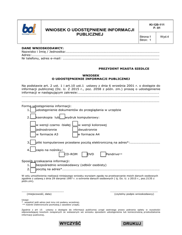 WNIOSEK O UDOSTĘPNIENIE INFORMACJI PUBLICZNEJ KI-120-111 F- 01 Strona:1 Stron: 1 DANE WNIOSKODAWCY: Nazwisko i Imię / Jednostka:.................................................................................... Adres:................................................................................................................... Nr telefonu, adres e-mail: ....................................................................................... PREZYDENT MIASTA SIEDLCE WNIOSEK O UDOSTĘPNIENIE INFORMACJI PUBLICZNEJ Na podstawie art. 2 ust. 1 i art.10 ust.1 ustawy z dnia 6 września 2001 r. o dostępie do informacji publicznej (Dz. U. Z 2015 r., poz. 2058 z późn. zm.) proszę o udostępnienie informacji w następującym zakresie:……………………………………………………………………………………. ............................................................................................................................ ............................................................................................................................ Forma udostępnienia informacji: udostępnienie dokumentów do przeglądania w urzędzie 1. 2. kserokopia lub wydruk komputerowy: w wersji czarno -białej w wersji kolorowej jednostronnie dwustronnie w formacie A3 w formacie A4 3. pliki komputerowe przesłane pocztą elektroniczną na adres*:........................... 4. zapis na nośniku: CD-ROM DVD Pendrive** Sposób przekazania informacji: bezpośrednio wnioskodawcy (odbiór osobisty) 1. pocztą na adres*……………………………………………………………………………………………………… 2. W celu umożliwienia realizacji niniejszego wniosku wyrażam zgodę na przetwarzanie moich danych osobowych zgodnie z ustawą z dnia 29 sierpnia 1997 r. o ochronie danych osobowych ( tj. Dz. U. z 2015 r., poz.2135 z późn.zm). ...................................... (miejscowość, data) ………………………………………………… (czytelny podpis wnioskodawcy) Uwagi: * wypełnić jeśli adres jest inny niż podany wcześniej. ** nośniki elektroniczne pochodzą z zasobów urzędu. Zgodnie z art 15 ustawy o dostępie do informacji publicznej urząd zastrzega prawo pobrania opłaty w wysokości odpowiadającej kosztom związanych ze wskazanym we wniosku sposobem udostępnienia lub koniecznością przekształcenia informacji publicznej. WYCZYŚĆ DRUKUJ Wyd.4