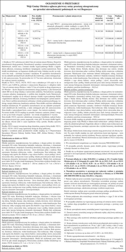 OGŁOSZENIE O PRZETARGU Wójt Gminy Oleśnica ogłasza pierwszy ustny przetarg nieograniczony na sprzedaż nieruchomości położonych we wsi Boguszyce Lp. Miejscowość 1 Boguszyce Nr działki 192/1 Pow. działki (bez udziału w dz. 192/14) 2,92 ha 2 192/11 + 1/10 udziału w dz. 192/14 0,2573 ha 3 192/12 + 1/10 udziału w dz. 192/14 0,3442 ha 4 192/18 + 1/10 udziału w dz. 192/14 0,2354 ha 5 192/21 + 1/10 udziału w dz. 192/14 12,08 ha Przeznaczenie w planie miejscowym W części WS/11 – przeznaczenie podstawowe – tereny wód otwartych, płynących i cieków wodnych, w części ZL/16 – przeznaczenie podstawowe - tereny lasów i zadrzewień Cena Wadium wywoław(zł) cza (zł) 62.042,00 80.000,00 8.000,00 76.367,00 90.000,00 9.000,00 98.832,00 110.000,00 11.000,00 49.485,00 60.000,00 ZLt/1 – tereny lasów z dopuszczeniem funkcji rekreacyjno-turystycznej ZLt/1 – tereny lasów z dopuszczeniem funkcji rekreacyjno-turystycznej, w części KS/2 – tereny parkingów 1. Działka nr 192/1 położona jest około 8 km od centrum miasta Oleśnica. Dojazd do nieruchomości drogą gruntową. Nieruchomość sąsiaduje z terenem kompleksu Lasów Państwowych, stawem oraz z terenem ośrodka wypoczynkowego Relaks z kąpieliskiem odkrytym, restauracją, hotelikiem i kempingiem z polem namiotowym. Teren działki niezabudowany; na fragmencie działka pod wodą z lokalnej rzeczki; na większości bez wody – zarośnięty trzcinami i tatarakiem. W sąsiedztwie nieruchomości nie ma zakładów przemysłowych szkodliwych dla środowiska, a także emitujących pyły lub zanieczyszczenia. Na powierzchni ok. 0,17 ha teren zadrzewiony: drzewostan bez większej wartości użytkowej. Działki nr 192/11, 192/12, 192/18, 192/21 wraz z udziałem po 1/10 części w dz. nr 192/14 o pow. 0,4696 ha, położone w miejscowości Boguszyce, w odległości około 7 km od centrum miasta Oleśnica i około 5,5 km od wjazdu na drogę ekspresową nr S-8 Wrocław – Syców. Dojazd do nieruchomości drogą gruntową i z płyt betonowych (około 800 m) do drogi lokalnej o nawierzchni asfaltowej. Nieruchomości sąsiadują z terenem zabudowy kempingowej, w pobliżu duży kompleks Lasów Państwowych. Nieruchomość znajduje się na obszarze dawnego ośrodka wypoczynkowego Relaks z kąpieliskiem odkrytym, restauracją, hotelikiem oraz kempingiem z polem namiotowym. Teren w pobliżu nieruchomości uzbrojony, w drodze gruntowej przebiegają: wodociąg, energia elektryczna, kanalizacja sanitarna. Teren działki częściowo zabudowany domkami letniskowymi. W sąsiedztwie nieruchomości nie ma zakładów przemysłowych szkodliwych dla środowiska, a także emitujących pyły lub zanieczyszczenia. Teren działki z samosiejkami brzóz, sosen i innymi – bez wartości użytkowej. Na terenie działki 192/18 znajdują się ponadto: kontenery sanitarne, jednak z uwagi, że nie są one trwale związane z gruntem – nie zostały uwzględnione w wycenie. Teren działki 192/21 częściowo zabudowany restauracją i hotelikiem, małymi budynkami pomocniczymi typu: garaże, magazynki, wiaty, grill. Na terenie działki kąpielisko odkryte, obecnie tylko w części napełnione wodą z potoku. Działka częściowo pokryta lasem. Działka 192/14 stanowi wewnętrzną drogę dojazdową, poprzez którą działki 192/11, 192/12, 192/18 i 192/21 mają zapewniony dostęp do drogi publicznej. Zgodnie z rysunkiem planu przedmiotowe działki znajdują się w Proponowanym Specjalnym Obszarze Ochrony Siedlisk Natura 2000 „Dolina Oleśnicy i Potoku Boguszyckiego”. Zabudowania na działce nr 192/11: Budynki letniskowe Obiekty parterowe, niepodpiwniczone, bez poddasza; z drugiej połowy lat siedemdziesiątych XX wieku. Konstrukcja budynków tradycyjna, drewniana, z elementami drewnopochodnymi, stropodach o konstrukcji drewnianej, kryty papą. Stolarka okienna - okna drewniane, stolarka drzwiowa - drzwi drewniane pełne i oszklone. Brak ogrzewania. Instalacje elektryczna, wodno – kanalizacyjna. Stan techniczny: słaby, występują wady typowe dla obiektów z tego okresu budowy: zużyte podłogi i drzwi, nieszczelne okna, zawilgocenie ścian i podłóg, lokalne przecieki przez dach, korozja biologiczna elementów drewnianych i drewnopochodnych. Obiekty były użytkowane przez około 30-35 lat jako domki kempingowe. Powierzchnia użytkowa domków letniskowych na działce 192/11: - domek nr 1 - 28,0 m2, domki nr 2-8: 7 szt. x 29,0 m2 = 203,0 m2. Razem: 231,0 m2. Zabudowania na działce nr 192/12: Budynek letniskowy nr: 9-15 Obiekty parterowe, niepodpiwniczone, bez poddasza; z drugiej połowy lat siedemdziesiątych XX wieku. Konstrukcja budynków tradycyjna, drewniana, z elementami drewnopochodnymi, stropodach o konstrukcji drewnianej, kryty papą. Stolarka okienna - okna drewniane, stolarka drzwiowa - drzwi drewniane pełne i oszklone. Brak ogrzewania. Instalacje: elektryczna, wodno-kanalizacyjna. Stan techniczny: słaby, występują wady typowe dla obiektów z tego okresu budowy: zużyte podłogi i drzwi, nieszczelne okna, zawilgocenie ścian i podłóg, lokalne przecieki przez dach, korozja biologiczna elementów drewnianych i drewnopochodnych. Budynek letniskowy nr: 16-18 Obiekty parterowe niepodpiwniczone, bez poddasza; z drugiej połowy lat siedemdziesiątych XX wieku. Konstrukcja budynków tradycyjna, drewniana, z obiciem ścian z blachy falistej ocynkowanej, dach dwuspadowy o konstrukcji drewnianej, kryty blachą falistą. Stolarka okienna: okna drewniane, stolarka drzwiowa: drzwi drewniane pełne i oszklone. Brak ogrzewania. Instalacje: elektryczna, wodno-kanalizacyjna. Stan techniczny: słaby, występują wady typowe dla obiektów z tego okresu budowy: zużyte podłogi i drzwi, nieszczelne okna, zawilgocenie ścian i podłóg, lokalne przecieki przez dach, korozja biologiczna elementów drewnianych. Obiekty były użytkowane przez około 30-35 lat jako domki kempingowe. Powierzchnia użytkowa domków letniskowych na działce 192/12: domki nr 9-18: 