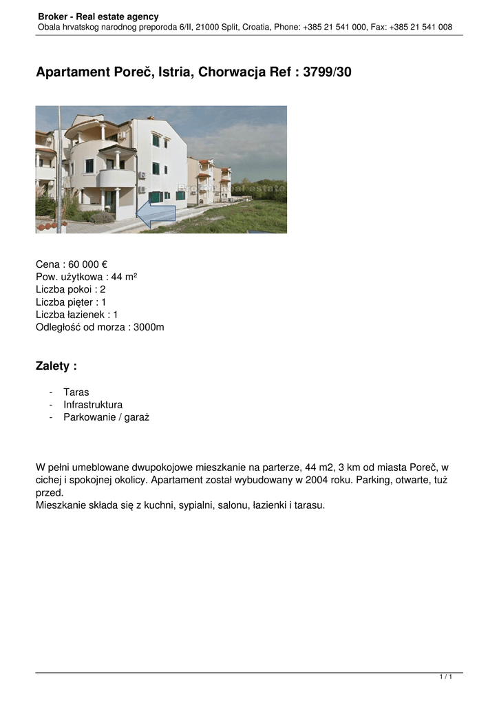 Broker - Real estate agency Obala hrvatskog narodnog preporoda 6/II, 21000 Split, Croatia, Phone: +385 21 541 000, Fax: +385 21 541 008 Apartament Poreč, Istria, Chorwacja Ref : 3799/30 Cena : 60 000 € Pow. użytkowa : 44 m² Liczba pokoi : 2 Liczba pięter : 1 Liczba łazienek : 1 Odległość od morza : 3000m Zalety : - Taras Infrastruktura Parkowanie / garaż W pełni umeblowane dwupokojowe mieszkanie na parterze, 44 m2, 3 km od miasta Poreč, w cichej i spokojnej okolicy. Apartament został wybudowany w 2004 roku. Parking, otwarte, tuż przed. Mieszkanie składa się z kuchni, sypialni, salonu, łazienki i tarasu. 1/1