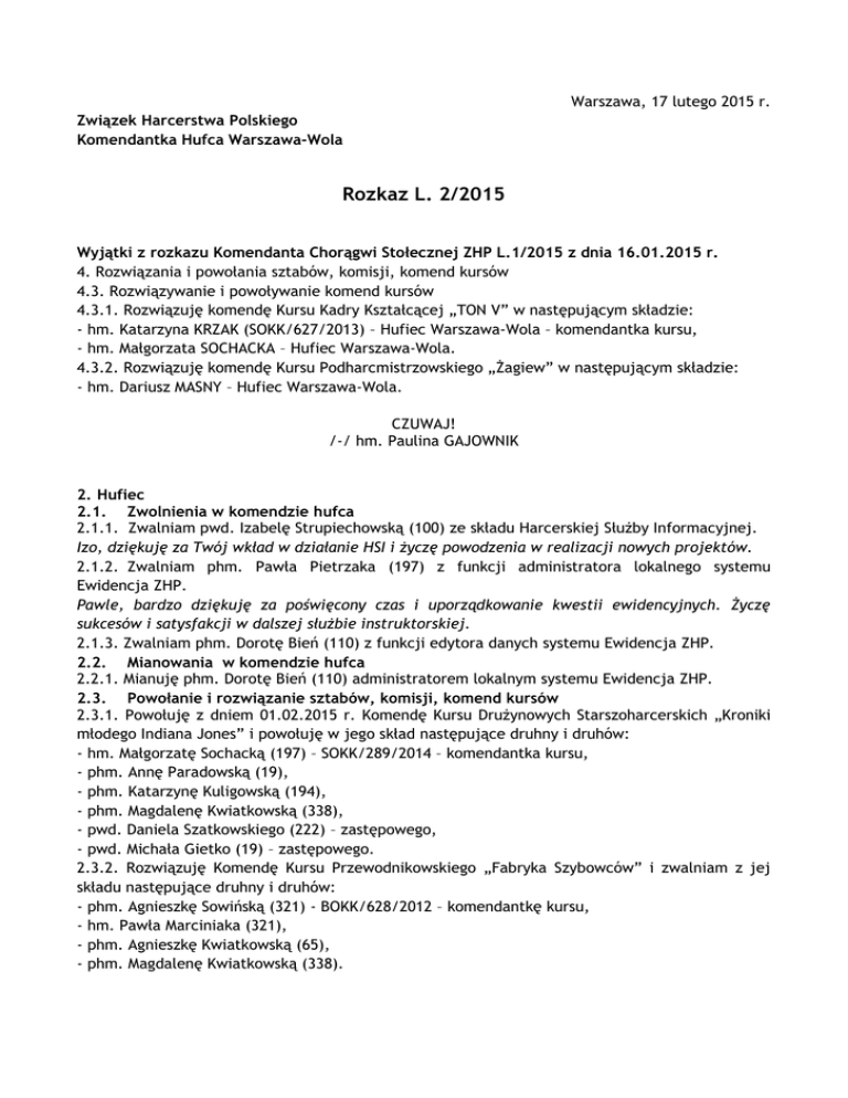 Rozkaz L. 2/2015 - Strona Hufca ZHP Warszawa-Wola