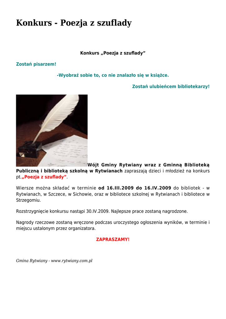 Konkurs - Poezja z szuflady Konkurs „Poezja z szuflady” Zostań pisarzem! -Wyobraź sobie to, co nie znalazło się w książce. Zostań ulubieńcem bibliotekarzy! Wójt Gminy Rytwiany wraz z Gminną Biblioteką Publiczną i biblioteką szkolną w Rytwianach zapraszają dzieci i młodzież na konkurs pt.„Poezja z szuflady”. Wiersze można składać w terminie od 16.III.2009 do 16.IV.2009 do bibliotek - w Rytwianach, w Szczece, w Sichowie, oraz w bibliotece szkolnej w Rytwianach i bibliotece w Strzegomiu. Rozstrzygnięcie konkursu nastąpi 30.IV.2009. Najlepsze prace zostaną nagrodzone. Nagrody rzeczowe zostaną wręczone podczas uroczystego ogłoszenia wyników, w terminie i miejscu ustalonym przez organizatora. ZAPRASZAMY! Gmina Rytwiany - www.rytwiany.com.pl