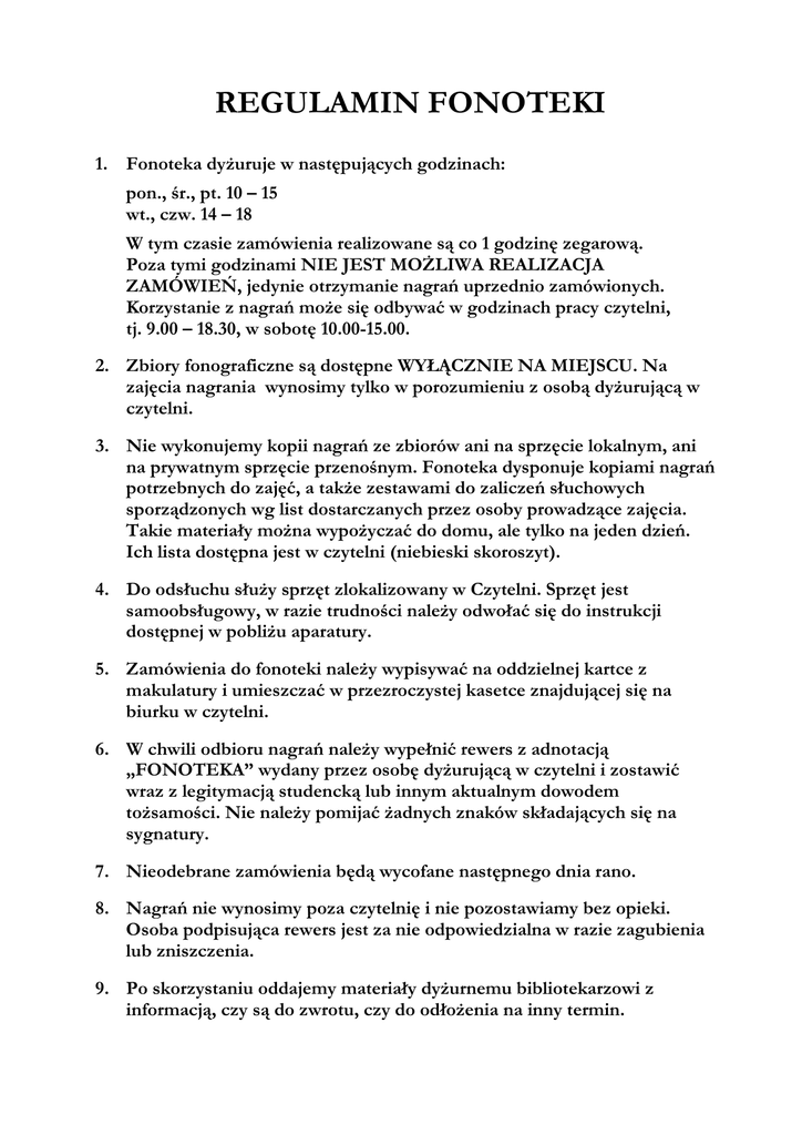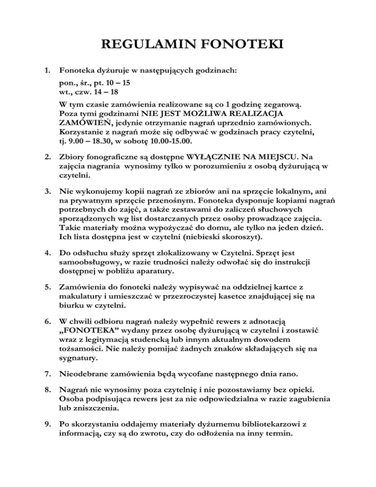 REGULAMIN FONOTEKI 1. Fonoteka dyŜuruje w następujących godzinach: pon., śr., pt. 10 – 15 wt., czw. 14 – 18 W tym czasie zamówienia realizowane są co 1 godzinę zegarową. Poza tymi godzinami NIE JEST MOśLIWA REALIZACJA ZAMÓWIEŃ, jedynie otrzymanie nagrań uprzednio zamówionych. Korzystanie z nagrań moŜe się odbywać w godzinach pracy czytelni, tj. 9.00 – 18.30, w sobotę 10.00-15.00. 2. Zbiory fonograficzne są dostępne WYŁĄCZNIE NA MIEJSCU. Na zajęcia nagrania wynosimy tylko w porozumieniu z osobą dyŜurującą w czytelni. 3. Nie wykonujemy kopii nagrań ze zbiorów ani na sprzęcie lokalnym, ani na prywatnym sprzęcie przenośnym. Fonoteka dysponuje kopiami nagrań potrzebnych do zajęć, a takŜe zestawami do zaliczeń słuchowych sporządzonych wg list dostarczanych przez osoby prowadzące zajęcia. Takie materiały moŜna wypoŜyczać do domu, ale tylko na jeden dzień. Ich lista dostępna jest w czytelni (niebieski skoroszyt). 4. Do odsłuchu słuŜy sprzęt zlokalizowany w Czytelni. Sprzęt jest samoobsługowy, w razie trudności naleŜy odwołać się do instrukcji dostępnej w pobliŜu aparatury. 5. Zamówienia do fonoteki naleŜy wypisywać na oddzielnej kartce z makulatury i umieszczać w przezroczystej kasetce znajdującej się na biurku w czytelni. 6. W chwili odbioru nagrań naleŜy wypełnić rewers z adnotacją „FONOTEKA” wydany przez osobę dyŜurującą w czytelni i zostawić wraz z legitymacją studencką lub innym aktualnym dowodem toŜsamości. Nie naleŜy pomijać Ŝadnych znaków składających się na sygnatury. 7. Nieodebrane zamówienia będą wycofane następnego dnia rano. 8. Nagrań nie wynosimy poza czytelnię i nie pozostawiamy bez opieki. Osoba podpisująca rewers jest za nie odpowiedzialna w razie zagubienia lub zniszczenia. 9. Po skorzystaniu oddajemy materiały dyŜurnemu bibliotekarzowi z informacją, czy są do zwrotu, czy do odłoŜenia na inny termin.