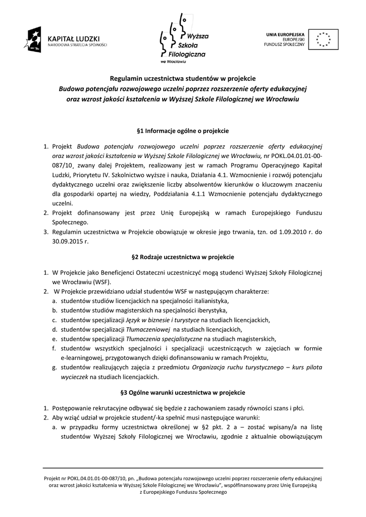 Regulamin uczestnictwa studentów w projekcie Budowa potencjału rozwojowego uczelni poprzez rozszerzenie oferty edukacyjnej oraz wzrost jakości kształcenia w Wyższej Szkole Filologicznej we Wrocławiu §1 Informacje ogólne o projekcie 1. Projekt Budowa potencjału rozwojowego uczelni poprzez rozszerzenie oferty edukacyjnej oraz wzrost jakości kształcenia w Wyższej Szkole Filologicznej we Wrocławiu, nr POKL.04.01.01-00087/10¸ zwany dalej Projektem, realizowany jest w ramach Programu Operacyjnego Kapitał Ludzki, Priorytetu IV. Szkolnictwo wyższe i nauka, Działania 4.1. Wzmocnienie i rozwój potencjału dydaktycznego uczelni oraz zwiększenie liczby absolwentów kierunków o kluczowym znaczeniu dla gospodarki opartej na wiedzy, Poddziałania 4.1.1 Wzmocnienie potencjału dydaktycznego uczelni. 2. Projekt dofinansowany jest przez Unię Europejską w ramach Europejskiego Funduszu Społecznego. 3. Regulamin uczestnictwa w Projekcie obowiązuje w okresie jego trwania, tzn. od 1.09.2010 r. do 30.09.2015 r. §2 Rodzaje uczestnictwa w projekcie 1. W Projekcie jako Beneficjenci Ostateczni uczestniczyć mogą studenci Wyższej Szkoły Filologicznej we Wrocławiu (WSF). 2. W Projekcie przewidziano udział studentów WSF w następującym charakterze: a. studentów studiów licencjackich na specjalności italianistyka, b. studentów studiów magisterskich na specjalności iberystyka, c. studentów specjalizacji Język w biznesie i turystyce na studiach licencjackich, d. studentów specjalizacji Tłumaczeniowej na studiach licencjackich, e. studentów specjalizacji Tłumaczenia specjalistyczne na studiach magisterskich, f. studentów wszystkich specjalności i specjalizacji uczestniczących w zajęciach w formie e-learningowej, przygotowanych dzięki dofinansowaniu w ramach Projektu, g. studentów realizujących zajęcia z przedmiotu Organizacja ruchu turystycznego – kurs pilota wycieczek na studiach licencjackich. §3 Ogólne warunki uczestnictwa w projekcie 1. Postępowanie rekrutacyjne odbywać się będzie z zachowaniem zasady równości szans i płci. 2. Aby wziąć udział w projekcie student/-ka spełnić musi następujące warunki: a. w przypadku formy uczestnictwa określonej w §2 pkt. 2 a – zostać wpisany/a na listę studentów Wyższej Szkoły Filologicznej we Wrocławiu, zgodnie z aktualnie obowiązującym Projekt nr POKL.04.01.01-00-087/10, pn. „Budowa potencjału rozwojowego uczelni poprzez rozszerzenie oferty edukacyjnej oraz wzrost jakości kształcenia w Wyższej Szkole Filologicznej we Wrocławiu”, współfinansowany przez Unię Europejską z Europejskiego Funduszu Społecznego b. c. d. e. regulaminem rekrutacji na pierwszy rok studiów pierwszego stopnia (licencjackich) w Wyższej Szkole Filologicznej we Wrocławiu; w przypadku formy uczestnictwa określonej w §2 pkt. 2 b – zostać wpisany/a na listę studentów Wyższej Szkoły Filologicznej we Wrocławiu zgodnie z aktualnie obowiązującym regulaminem rekrutacji na pierwszy rok studiów drugiego stopnia (magisterskich) w Wyższej Szkole Filologicznej we Wrocławiu; w przypadku formy uczestnictwa określonej w §2 pkt. 2 c-e – w podaniu o przyjęciu na studia wybrać odpowiednią specjalizację; w przypadku formy uczestnictwa określonej w §2 pkt. 2 f – kwalifikować się zgodnie z planem zajęć aktualnie obowiązującym w WSF lub wybrać formę realizacji danego przedmiotu w postaci kursu e-learningowego jako preferowaną; w przypadku formy uczestnictwa określonej w §2 pkt. 2 g – realizacja w ramach specjalizacji lub jako przedmiot dodatkowy. §4 Procedura przyjmowania zgłoszeń 1. Rekrutacja prowadzona będzie cyklicznie, nie rzadziej niż raz na rok. 2. Rekrutacja poprzedzona będzie odpowiednimi działaniami informacyjnymi – informacje zamieszczane będą w prasie, informacje przekazywane będą ponadto podczas targów edukacyjnych, na bieżąco aktualizowane będą na stronie internetowej uczelni oraz w edziekanacie (wewnętrznym, dostępnym on-line systemie informacyjnym uczelni). 3. Rekrutacja przebiegać będzie zgodnie z regulaminami określonymi w §3 pkt. 2 a-b, określającymi m.in. szczegółowe kryteria, warunki przyjęcia na poszczególne kierunki studiów i specjalizacje oraz komplet wymaganych dokumentów. Podanie o przyjęcie na studia (oraz wybór specjalizacji) składać można w formie elektronicznej. Wymagane podpisane dokumenty składać można osobiście w siedzibie uczelni lub przesłać pocztą. 4. Decyzje o przyjęciu na studia/ specjalizacje podejmuje Komisja Rekrutacyjna WSF. 5. W przypadku uczestnictwa w ramach projektu w kursach prowadzonych w ramach specjalizacji, o których mowa w §2 pkt. 2 ust. c-e, kursach w formie e-learningowej, o których mowa w §2 pkt. 2 ust. f oraz zajęciach o których mowa w §2 pkt. 2 ust. g, zapisy prowadzone będą poprzez e-dziekanat. Co do zasady uczestnikiem ww. kursów może być każdy student WSF, o ile uczestnictwo w zajęciach zgodne jest z aktualnie obowiązującymi planami i programami studiów dla danej specjalności i specjalizacji. W przypadku większej liczby zgłoszeń, niż dostępna liczba miejsc na poszczególne kursy, uczelnia zastrzega sobie prawo przyjęcia dodatkowych kryteriów rekrutacyjnych. §5 Realizacja 1. Każdy uczestnik projektu zobowiązany jest podpisać: a. deklarację uczestnictwa w projekcie, b. wypełniony formularz danych osobowych, c. oświadczenie o wyrażeniu zgody na przetwarzanie danych osobowych. 2. Podpisanie dokumentów wymienionych w pkt. 2 a-c nie jest obowiązkowe, niepodpisanie ich oznacza jednak rezygnację z uczestnictwa w projekcie. 3. Każdy/-a student/-ka w okresie trwania Projektu może uczestniczyć we wszystkich formach wsparcia, określonych w §2 pkt. a-e, o ile każdorazowo spełnia kryteria określone w §3. 2 4. Uczestnictwo w projekcie odbywać się będzie zgodnie z aktualnie obowiązującymi w WSF planami i programami studiów. 5. Wyższa Szkoła Filologiczna we Wroc