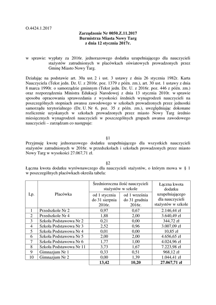 O.4424.1.2017 Zarządzenie Nr 0050.Z.11.2017 Burmistrza Miasta Nowy Targ z dnia 12 stycznia 2017r. w sprawie: wypłaty za 2016r. jednorazowego dodatku uzupełniającego dla nauczycieli stażystów zatrudnionych w placówkach oświatowych prowadzonych przez Gminę Miasto Nowy Targ. Działając na podstawie art. 30a ust. 2 i ust. 3 ustawy z dnia 26 stycznia 1982r. Karta Nauczyciela (Tekst jedn. Dz. U. z 2016r. poz. 1379 z późn. zm.), art. 30 ust. 1 ustawy z dnia 8 marca 1990r. o samorządzie gminnym (Tekst jedn. Dz. U. z 2016r. poz. 446 z późn. zm.) oraz rozporządzenia Ministra Edukacji Narodowej z dnia 13 stycznia 2010r. w sprawie sposobu opracowania sprawozdania z wysokości średnich wynagrodzeń nauczycieli na poszczególnych stopniach awansu zawodowego w szkołach prowadzonych przez jednostki samorządu terytorialnego (Dz. U. Nr 6, poz. 35 z późn. zm.), uwzględniając dokonane rozliczenie uzyskanych w szkołach prowadzonych przez miasto Nowy Targ średnio miesięcznych wynagrodzeń nauczycieli w poszczególnych grupach awansu zawodowego nauczycieli – zarządzam co następuje: §1 Przyjmuję kwotę jednorazowego dodatku uzupełniającego dla wszystkich nauczycieli stażystów zatrudnionych w 2016r. w przedszkolach i szkołach prowadzonych przez miasto Nowy Targ w wysokości 27.067,71 zł. §2 Łączna kwota dodatku wyrównawczego dla nauczycieli stażystów, o którym mowa w § 1 w poszczególnych placówkach określa tabela: Lp. Placówka 1 2 3 4 5 6 7 8 9 10 Przedszkole Nr 2 Przedszkole Nr 4 Szkoła Podstawowa Nr 2 Szkoła Podstawowa Nr 3 Szkoła Podstawowa Nr 4 Szkoła Podstawowa Nr 5 Szkoła Podstawowa Nr 6 Szkoła Podstawowa Nr 11 Gimnazjum Nr 1 Gimnazjum Nr 2 Średnioroczna ilość nauczycieli stażystów w szkole od 1 stycznia od 1 września do 31 sierpnia do 31 grudnia 2016r. 2016r. 0,97 0,67 1,88 2,00 0,21 0,00 2,52 0,96 0,01 0,00 2,00 2,00 1,77 1,00 3,73 1,67 0,33 0,51 0,00 1,39 13,42 10,20 Łączna kwota dodatku uzupełniającego dla nauczycieli stażystów w szkole 2.146,44 zł 3.640,49 zł 344,72 zł 3.007,09 zł 10,85 zł 4.656,65 zł 4.024,96 zł 7.223,98 zł 968,12 zł 1.044,41 zł 27.067,71 zł §3 Zobowiązuje się dyrektorów poszczególnych szkół do określenia kwoty jednorazowego dodatku uzupełniającego (DJ) dla poszczególnych nauczycieli stażystów zatrudnionych w 2016r. w danej placówce przy uwzględnieniu następującej zasady: DJ = WS x SJ gdzie znaczenie poszczególnych symboli jest następujące: WS – iloraz różnicy, o której mowa w art. 30a ust. 2 ustawy Karta Nauczyciela, ustalona dla danego stopnia awansu zawodowego i sumy osobistych stawek wynagrodzenia zasadniczego nauczycieli na danym stopniu awansu zawodowego, ustalonych proporcjonalnie do okresu ich zatrudnienia – wskaźnik obliczany przez organ prowadzący. SJ – osobista stawka wynagrodzenia zasadniczego ustalona proporcjonalnie do okresu zatrudnienia danego nauczyciela. §4 Wskaźnik WS o którym mowa w § 3 zarządzenia dla nauczycieli stażystów zatrudnionych w nowotarskich placówkach oświatowych w 2016r. wynosi – 1,093623 §5 Wypłata jednorazowego dodatku wyrównawczego dla nauczycieli stażystów winna nastąpić do dnia 31 stycznia 2017r. §6 Wykonanie zarządzania zleca się Dyrektorowi Przedszkola Nr 2 w Nowym Targu, Dyrektorowi Przedszkola Nr 4 w Nowym Targu, Dyrektorowi Szkoły Podstawowej Nr 2 im. Mikołaja Kopernika w Nowym Targu, Dyrektorowi Szkoły Podstawowej Nr 3 im. Jana Pawła II w Nowym Targu, Dyrektorowi Szkoły Podstawowej Nr 4 w Nowym Targu, Dyrektorowi Szkoły Podstawowej Nr 5 im. Konfederacji Tatrzańskiej w Nowym Targu, Dyrektorowi Szkoły Podstawowej Nr 6 im. Józefa Rajskiego Burmistrza Nowego Targu w Nowym Targu, Dyrektorowi Szkoły Podstawowej Nr 11 im. Żołnierzy Armii Krajowej w Nowym Targu, Dyrektorowi Gimnazjum Nr 1 im. Tadeusza Kościuszki w Nowym Targu, Dyrektorowi Gimnazjum Nr 2 im. Kardynała Stefana Wyszyńskiego w Nowym Targu, Dyrektorowi Miejskiego Centrum Usług Wspólnych w Nowym Targu, oraz Naczelnikowi Wydziału Oświaty Urzędu Miasta Nowy Targ. §7 Zarządzenie wchodzi w życie z dniem podjęcia.