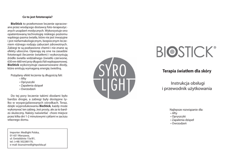 Co to jest fototerapia? BioStick to przełomowe leczenie opracowane przez wiodącego dostawcę foto-terapeutycznych urządzeń medycznych. Wykorzystuje ono opatentowaną technologię niskiego poziomu wąskiego pasma światła, które nie jest inwazyjne i jest niefarmakologicznym, bezpiecznym leczeniem różnego rodzaju zaburzeń zdrowotnych. Zabiegi te są pozbawione chemii i nie znane są efekty uboczne. Opierają się one na zasadzie fototerapii (leczenie światłem) i wykorzystują źródło światła widzialnego (światło czerwone, 630 nm-660 nm) przy długości fali wąskopasmowej. BioStick wykorzystuje zaawansowane diody, które emitują wymaganą energię świetlną. Pożądany efekt leczenia tą długością fali: • Afty • Opryszczki • Zapalenia dziąseł • Owrzodzeń Do tej pory leczenie takimi diodami było bardzo drogie, a zabiegi były dostępne tylko w wyspecjalizowanych ośrodkach. Teraz, dzięki wyprodukowaniu BioStick, każdy może wykonywać ten zabieg. Jest prosty, ale za to bardzo skuteczny. Należy naświetlać chore miejsce przez kilka dni 1-2 minutowymi cyklami w zaciszu własnego domu. Importer: Medlight Polska, 01-651 Warszawa, ul. Gwiaździsta 15a/81, tel. (+48) 502280170, e-mail: [email protected] Terapia światłem dla skóry Instrukcja obsługi i przewodnik użytkowania Najlepsze rozwiązanie dla: • Afty • Opryszczki • Zapalenia dziąseł • Owrzodzeń Sposób użycia: 1. Usuń BioStick z opakowania. 2. Zdejmij nasadkę u dołu urządzenia i włóż 2 baterie AA w prawidłowej pozycji (baterie nie są dołączone do zestawu). 3. Załóż nasadkę. 4. Aby włączyć urządzenie, należy nacisnąć włącznik ON w górę w kierunku znaku ‘’I’’ 5. Po włączeniu urządzenie zaczyna świecić czerwonym światłem LED. Skutki uboczne, interakcje z lekami, zagrożenia bezpieczeństwa: Czerwone światło emitowane przez BioStick jest całkowicie nieszkodliwe. Nie są znane żadne skutki uboczne korzystania z BioStick trzy razy dziennie. UWAGA: • Nie należy patrzeć bezpośrednio na źródło światła. • Wymagana jest kontrola rodziców w przypadku użytkowania przez dzieci. Czerwone światło nie pali się w pozycji ON/BioStick nie działa ZIELONE światło (wskazuje potrzebę zmiany baterii) OFF/ON przełącznik Zielone światło włącza się Możliwa przyczyna Rozwiązanie 1. Baterie są stare/nie są naładowane 1. Zmień bateria – użyj nowych baterii 2. Baterie są źle włożone 2. Włóż baterie w kolejności jak na rysunku poniżej 3. Przełącznik jest w pozycji OFF 3. Przesuń przełącznik w stronę znaku ‘’I’’ 4. Usterka urządzenia 4. Jeśli wszystkie problemy/rozwiązania nie usuną usterki skontaktuj się ze sprzedawcą 1. Baterie są słabe 1. Baterie musisz wymienić na świeże/nowe Gwarancja 100% satysfakcji Z powodu dystrybucji BioStick do różnych krajów, występują różne gwarancje. W twoim interesie jest skontaktować się ze sprzedawca w celu uzyskania szczegółów gwarancji. Włóż 2AA nowe baterie Leczenie: 1. Włączony BioStick umieść bezpośrednio w miejscu naświetlania i upewnij się że oświetla chore miejsce. 2. Chore miejsce naświetlaj przez1-2 minuty. Jest to jeden cykl leczniczy. 3. Aby rezultat leczenia był najlepszy zaleca się wykonywanie 3 cykli dziennie. 4. Gdy zauważysz pierwsze efekty leczenia, możesz zmniejszyć ilość cykli do 2 dziennie. 5. Po każdym użyciu należy oczyścić końcówkę z diodami łagodnym mydłem i myjką. 6. Nie należy umieszczać urządzenia bezpośrednio pod bieżącą wodą lub zanurzać w wodzie z mydłem, samym mydle lub innej cieczy. 7. Nie udostępniaj BioStick innym osobom. BioStick jest urządzeniem medycznym do indywidualnego stosowania. Problem/Usterka CZERWONE światło NASADKA Użyte światło Wąskie pasmo światła 630nm-660nm Moc światła 18mW (typowy) Uruchamianie Obróć nasadkę zgodnie ze wskazówkami zegara Źródło zasilania Baterie alkaliczne 2AA (nie są dołączone) Pobór prądu 90 mA Żywotność baterii Około 1000 cykli po 1 minucie Sygnalizacja wyczerpania baterii Zielone światło zapala się gdy baterie są słabe Waga urządzenia 75g z bateriami, 28 g bez baterii Rozmiar urządzenia długość 200mm, średnica 19 mm Autoryzowany przedstawiciel w Europie: MEDES LIMITED, 9 Beaumont Gate, Shenley Hill, Rodlett, Herts, WD7 7AR, England, tel./faks: (+ 44) 19 23859810 Certified for: ISO 9001 (2000), MDD93/42 (1993), ISO 13485 (2003) Cert. No. 499/499CE CE 0473 Made by SyroLight Ltd 9 Hadror ST. Jaffa-Tel-Aviv, Israel tel.: 972-3-5332274 faks: 972-3-5332275 www.thebiostick.com