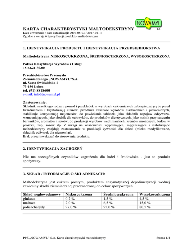KARTA CHARAKTERYSTYKI MALTODEKSTRYNY Data utworzenia / data aktualizacji: 2007-08-03 / 2017-01-13 Zgodne z wersją 6 Specyfikacji produktu- maltodekstryna 1. IDENTYFIKACJA PRODUKTU I IDENTYFIKACJA PRZEDSIĘBIORSTWA Maltodekstryna NISKOSCUKRZONA, ŚREDNIOSCUKRZONA, WYSOKOSCUKRZONA Polska Klasyfikacja Wyrobów i Usług: 15.62.21-30.00 Przedsiębiorstwo Przemysłu Ziemniaczanego „NOWAMYL”S.A. ul. Szosa Świdwińska 1 73-150 Łobez tel. (91) 8818600 e-mail: [email protected] Zastosowanie: Składnik wszelkiego rodzaju pomad i przekładek w wyrobach cukierniczych zabezpieczający je przed twardnieniem i krystalizacją cukrów, przedłuża świeżość wyrobów ciastkarskich i piekarniczych, stabilizuje konsystencję majonezów, do powlekania tabletek, jako składnik napojów odżywczowzmacniających, jako słodzik dla cukrzyków, do produktów dietetycznych, jako nośnik przy suszeniu barwników, aromatów i soków, do produkcji wyrobów wędliniarskich, kremów mrożonych, lodów w proszku, zup, sosów itp. Z uwagi na właściwości wypełniające, zagęszczające i stabilizujące maltodekstryny znajdują zastosowanie w produkcji żywności dla dzieci (mleko modyfikowane, składnik odżywek dla niemowląt). Brak przeciwwskazań do stosowania produktu. 2. IDENTYFIKACJA ZAGROŻEŃ Nie ma szczególnych czynników zagrożenia dla ludzi i środowiska - jest to produkt spożywczy. 3. SKŁAD / INFORMACJE O SKŁADNIKACH: Maltodekstryna jest cukrem prostym, produktem enzymatycznej depolimeryzacji wodnej zawiesiny skrobi ziemniaczanej przeznaczonej do celów spożywczych. Skład węglowodanowy glukoza maltoza polisacharydy Niskoscukrzona 0,7 % 2,0 % 97,0 % Średnioscukrzona 1,5 % 6,5 % 92,0 % PPZ „NOWAMYL” S.A. Karta charakterystyki maltodekstryny Wysokoscukrzona 4,5 % 15,0 % 80,5 % Strona 1/4 4. ŚRODKI PIERWSZEJ POMOCY Postępowanie podczas: - kontaktu z oczami: przemyć oczy letnią wodą, - wdychania: zaleca się wypicie dużej ilości płynów. Produkt spożywczy nie zagraża zdrowiu 5. POSTĘPOWANIE W PRZYPADKU POŻARU: Odpowiednie media gaśnicze to: dwutlenek węgla, proszek, piana, gaśnica wodna (mgła). Nie ma specjalnych wymogów odnośnie samej substancji, jej produktów po zapaleniu lub innych gazów. Standardowe postępowanie jak podczas pożaru środków chemicznych. 6. POSTĘPOWANIE W PRZYPADKU NIEZAMIERZONEGO UWOLNIENIA DO ŚRODOWISKA Nie ma szczególnych czynników zagrożenia dla ludzi i środowiska - jest to produkt spożywczy. 7. POSTĘPOWANIE Z PRODUKTEM I JEGO MAGAZYNOWANIE: Postępować zgodnie z zasadami dobrej praktyki higienicznej. Nie dopuszczać do nadmiernego pylenia podczas wysypywania produktu z opakowań. W suchym, przewiewnym pomieszczeniu wg PN-88/A-74705. Zalecana wilgotność względnej powietrza do 75%, temperatura do 20oC. Okres przechowywania wynosi 24 miesiące od daty produkcji. 8. KONTROLA NARAŻENIA / ŚRODKI OCHRONY INDYWIDUALNEJ: Zaleca się stosowanie maski (okularów) przeciwpyłowej podczas wysypywania zawartości worków. ----------------------------------------------------------------------------------------------------------------9. WŁAŚCIWOŚCI FIZYKOCHEMICZNE: Badane parametry Wilgotność Wymagania Śr Max.10% Wartość pH 5,0-7,0 N DE (cukry redukujące) 6-11 PPZ „NOWAMYL” S.A. Karta charakterystyki maltodekstryny 11-20 W 20-30 Strona 2/4 Zawartość popiołu Zawartość substancji mineralnych nierozpuszczalnych w 10% HCl Zanieczyszczenia mechaniczne max.0,4% max.0,1% niedopuszczalne WŁAŚCIWOŚCI ORGANOLEPTYCZNE: Barwa Wygląd i konsystencja Zapach Smak Rozpuszczalność -biała do lekko kremowej -sypki proszek, bez zlepów i spieków -bez zapachu i bez zapachów obcych -lekko słodki, bez obcych posmaków -całkowita PARAMETRY MIKROBIOLOGICZNE: Ogólna liczba drobnoustrojów w 1g - mniej niż 10 - 1000 jtk Ogólna liczba drożdży i pleśni w 1 g - nie więcej niż 50 jtk Liczba Bacillus cereus w 1 g- nie więcej niż 10 jtk Bakterie z grupy coli w 1 g - nie więcej niż 10 jtk Obecność Escherichia coli w 1g - nieobecne Gronkowce chorobotwórcze koagulazododatnie w 1 g – nieobecne Salmonella w 25 g – nieobecne Obecność beztlenowych bakterii przetrwalnikujących redukujących siarczyny w 1 g – nieobecne Obecność beztlenowych bakterii przetrwalnikujących Clostridium w 1 g - nieobecne Liczba bakterii z rodziny Enterobacteriaceae w 1 g - nie więcej niż 10 jtk 10. STABILNOŚĆ I REAKTYWNOŚĆ: Warunki, których należy unikać: chronić przed wilgocią ( produkt higroskopijny). 11. INFORMACJE TOKSYKOLOGICZNE: Wyrób nie jest klasyfikowany jako substancja toksyczna. 12. INFORMACJE EKOLOGICZNE: Nie ma szczególnych czynników zagrożenia dla ludzi i środowiska - jest to produkt spożywczy. 13. POSTĘPOWANIE Z ODPADAMI: Nie dotyczy. PPZ „NOWAMYL” S.A. Karta charakterystyki maltodekstryny Strona 3/4 14. INFORMACJE DOTYCZĄCE TRANSPORTU: Przewozić suchymi i czystymi środkami transportu, które jednocześnie powinny zabezpieczać opakowania przed uszkodzeniem. 15. INFORMACJE DOTYCZĄCE PRZEPISÓW PRAWNYCH: Ustawa z dnia 25 sierpnia 2006r. o bezpieczeństwie żywności i żywienia (tekst jednolity Dz.U. 2015, poz.594) Rozporządzenie Ministra Zdrowia z dnia 22 listopada 2010r. w sprawie dozwolonych substancji dodatkowych (Dz.U. 2010, nr 232, poz. 1525) Rozporządzenie Ministra Rolnictwa i Rozwoju Wsi z dnia 23 grudnia 2014r. w sprawie znakowania poszczególnych rodzajów środków spożywczych (Dz.U. 2015, poz.29) 16. INNE INFORMACJE: Niniejsza karta stanowi własność PPZ „Nowamyl” S.A. i charakteryzuje wyłącznie produkty oznakowane na etykiecie znakiem i nazwą firmy. Użytkowanie karty z produktami innych firm jest niezgodne z prawem. PPZ „NOWAMYL” S.A. Karta charakterystyki maltodekstryny Strona 4/4