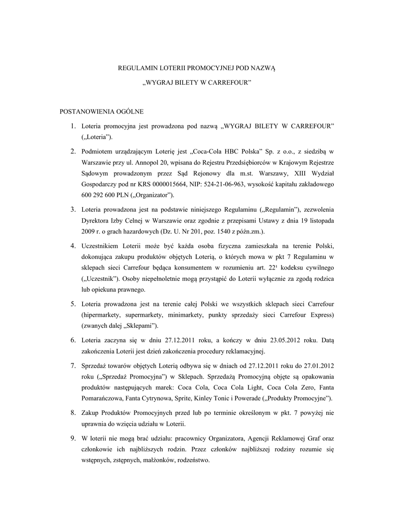 REGULAMIN LOTERII PROMOCYJNEJ POD NAZWĄ „WYGRAJ BILETY W CARREFOUR” POSTANOWIENIA OGÓLNE 1. Loteria promocyjna jest prowadzona pod nazwą „WYGRAJ BILETY W CARREFOUR” („Loteria”). 2. Podmiotem urządzającym Loterię jest „Coca-Cola HBC Polska” Sp. z o.o., z siedzibą w Warszawie przy ul. Annopol 20, wpisana do Rejestru Przedsiębiorców w Krajowym Rejestrze Sądowym prowadzonym przez Sąd Rejonowy dla m.st. Warszawy, XIII Wydział Gospodarczy pod nr KRS 0000015664, NIP: 524-21-06-963, wysokość kapitału zakładowego 600 292 600 PLN („Organizator”). 3. Loteria prowadzona jest na podstawie niniejszego Regulaminu („Regulamin”), zezwolenia Dyrektora Izby Celnej w Warszawie oraz zgodnie z przepisami Ustawy z dnia 19 listopada 2009 r. o grach hazardowych (Dz. U. Nr 201, poz. 1540 z późn.zm.). 4. Uczestnikiem Loterii może być każda osoba fizyczna zamieszkała na terenie Polski, dokonująca zakupu produktów objętych Loterią, o których mowa w pkt 7 Regulaminu w sklepach sieci Carrefour będąca konsumentem w rozumieniu art. 22¹ kodeksu cywilnego („Uczestnik”). Osoby niepełnoletnie mogą przystąpić do Loterii wyłącznie za zgodą rodzica lub opiekuna prawnego. 5. Loteria prowadzona jest na terenie całej Polski we wszystkich sklepach sieci Carrefour (hipermarkety, supermarkety, minimarkety, punkty sprzedaży sieci Carrefour Express) (zwanych dalej „Sklepami”). 6. Loteria zaczyna się w dniu 27.12.2011 roku, a kończy w dniu 23.05.2012 roku. Datą zakończenia Loterii jest dzień zakończenia procedury reklamacyjnej. 7. Sprzedaż towarów objętych Loterią odbywa się w dniach od 27.12.2011 roku do 27.01.2012 roku („Sprzedaż Promocyjna”) w Sklepach. Sprzedażą Promocyjną objęte są opakowania produktów następujących marek: Coca Cola, Coca Cola Light, Coca Cola Zero, Fanta Pomarańczowa, Fanta Cytrynowa, Sprite, Kinley Tonic i Powerade („Produkty Promocyjne”). 8. Zakup Produktów Promocyjnych przed lub po terminie określonym w pkt. 7 powyżej nie uprawnia do wzięcia udziału w Loterii. 9. W loterii nie mogą brać udziału: pracownicy Organizatora, Agencji Reklamowej Graf oraz członkowie ich najbliższych rodzin. Przez członków najbliższej rodziny rozumie się wstępnych, zstępnych, małżonków, rodzeństwo. 10. Dane osobowe Uczestników Loterii są pobierane i przetwarzane zgodnie z ustawą z dnia 29 sierpnia 1997 roku o ochronie danych osobowych (tekst jednolity Dz.U. z 2002, Nr 101, poz. 926 z późn.zm.) w celu przeprowadzenia Loterii. Administratorem danych osobowych zebranych podczas Loterii jest - w rozumieniu wspomnianej wyżej ustawy - Organizator. Uczestnicy mają prawo dostępu do swoich danych osobowych, jak również żądania ich poprawiania lub usunięcia. Podanie danych osobowych jest dobrowolne, choć niezbędne dla prawidłowego przeprowadzenia Loterii i wydania nagród. Podane dane będą przechowywane nie dłużej niż to będzie to niezbędne z uwagi na obowiązujące przepisy prawa. Po upływie tego okresu zostaną one zniszczone. ZASADY PROWADZENIA LOTERII 11. Aby zostać Uczestnikiem Loterii należy w okresie Sprzedaży Promocyjnej spełnić łącznie następujące warunki: a. dokonać jednorazowego zakupu (na jednym dowodzie zakupu) przynajmniej 4 litrów dowolnych Produktów Promocyjnych („Zakup promocyjny”), b. dokonać prawidłowego zgłoszenia w Loterii („Zgłoszenie”) w sposób określony w pkt 13 Regulaminu, nie wcześniej niż po dokonaniu zakupu Produktu Promocyjnego. 12. Uczestnik jest zobowiązany zachować dowód Zakupu promocyjnego (faktura VAT lub paragon fiskalny) w celu potwierdzenia uprawnień do ewentualnej nagrody, z zastrzeżeniem, iż: a. data na dowodzie Zakupu promocyjnego nie może być późniejsza niż dzień dokonania zgłoszenia lub b. godzina na dowodzie Zakupu promocyjnego nie może być późniejsza niż godzina dokonania zgłoszenia (w przypadku, gdy zgłoszenie zostało wysłane w dniu dokonania zakupu). 13. Prawidłowe Zgłoszenie udziału w Loterii, dla swej ważności i skuteczności, wymaga przesłania wiadomości tekstowej SMS na numer 7043 o treści BILETY (pisane małymi lub wielkimi literami). Jeden SMS to jedno Zgłoszenie w Loterii. Przesłane Zgłoszenie zostanie potwierdzone SMS-em zwrotnym na numer telefonu, z którego zostało wysłane zgłoszenie bezpośrednio po dokonaniu Zgłoszenia w terminie Sprzedaży Promocyjnej. Koszt SMS-a zwrotnego dla Uczestnika wynosi 0,00 zł brutto. W treści SMS-a zwrotnego podana jest nazwa Organizatora. 14. Koszt przesłania SMS wynosi 0,50 zł netto plus podatek VAT (0,62 zł brutto z VAT) niezależnie od operatora. Opłata w wysokości 0,62 zł brutto zostanie pobrana niezależnie od tego czy Zgłoszenie udziału w Loterii będzie prawidłowe. 15. Uczestnik może dokonać dowolną liczbę Zgłoszeń. Aby przesłać kolejne zgłoszenie należy dokonać Zakupu promocyjnego. Zakup min. 4 litrów Produktów Promocyjnych uprawnia Uczestnika do wysyłki jednego Zgłoszenia. W przypadku, gdy Uczestnik dokona jednorazowego zakupu (na jednym dowodzie zakupu) wielokrotności 4 litrów Produktów Promocyjnych, wówczas przysługuje mu prawo do wysyłki odpowiedniej liczby Zgłoszeń, według zasady, że każde zakupione pełne 4 litry Produktów Promocyjnych upoważnia do wysyłki jednego Zgłoszenia. 16. W Loterii nie są uwzględniane Zgłoszenia SMS niespełniające warunków określonych w pkt.13 oraz wysłane inaczej niż z telefonu komórkowego. 17. W Loterii ważne są jedynie Zgłoszenia: a. wysyłane wiadomością SMS z telefonu komórkowego działającego w sieci jednego z działających na polskim rynku operatorów telefonii komórkowej. W szczególności nie są uwzględniane Zgłoszenia SMS-y wysyłane za pomocą Internetu, stacjonarnych aparatów telefonicznych, w tym aparatów telefonicznych przeznaczonych do użytku publicznego, b. spełniające inne warunki Regulaminu. NAGRODY 18. Do rozlosowania w Loterii p