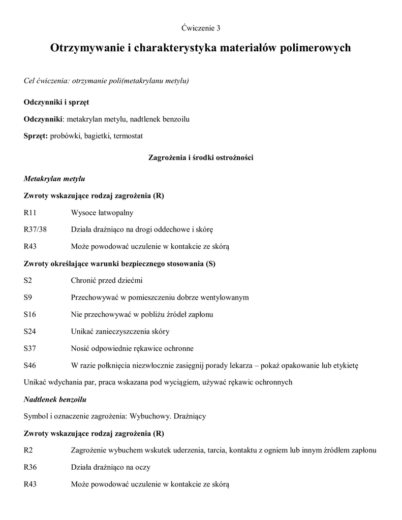 Ćwiczenie 3 Otrzymywanie i charakterystyka materiałów polimerowych Cel ćwiczenia: otrzymanie poli(metakrylanu metylu) Odczynniki i sprzęt Odczynniki: metakrylan metylu, nadtlenek benzoilu Sprzęt: probówki, bagietki, termostat Zagrożenia i środki ostrożności Metakrylan metylu Zwroty wskazujące rodzaj zagrożenia (R) R11 Wysoce łatwopalny R37/38 Działa drażniąco na drogi oddechowe i skórę R43 Może powodować uczulenie w kontakcie ze skórą Zwroty określające warunki bezpiecznego stosowania (S) S2 Chronić przed dziećmi S9 Przechowywać w pomieszczeniu dobrze wentylowanym S16 Nie przechowywać w pobliżu źródeł zapłonu S24 Unikać zanieczyszczenia skóry S37 Nosić odpowiednie rękawice ochronne S46 W razie połknięcia niezwłocznie zasięgnij porady lekarza – pokaż opakowanie lub etykietę Unikać wdychania par, praca wskazana pod wyciągiem, używać rękawic ochronnych Nadtlenek benzoilu Symbol i oznaczenie zagrożenia: Wybuchowy. Drażniący Zwroty wskazujące rodzaj zagrożenia (R) R2 Zagrożenie wybuchem wskutek uderzenia, tarcia, kontaktu z ogniem lub innym źródłem zapłonu R36 Działa drażniąco na oczy R43 Może powodować uczulenie w kontakcie ze skórą Zwroty określające warunki bezpiecznego stosowania (S) S3/7 Przechowywać pojemnik szczelnie zamknięty w chłodnym miejscu S14 Nie przechowywać razem z palnymi związkami organicznymi S36/37/39 Nosić odpowiednią odzież ochronną, odpowiednie rękawice ochronne i okulary lub ochronę twarzy Wykonanie ćwiczenia 1. Do probówki zawierającej 2cm3 metakrylanu metylu dodać 20 mg nadtlenku benzoilu i dokładnie wymieszać. 2. Probówkę ogrzewać w termostacie o temperaturze 90°C. 3. Po 25 – 30 minutach ogrzewania ciecz powinna przybrać konsystencję ciągliwej masy, a następnie zestalić się, przechodząc w twardy, bezbarwny i przezroczysty produkt. Sprawozdanie z wykonania ćwiczenia Dokonać krótkiego opisu właściwości fizykochemicznych oraz możliwości wykorzystania w praktyce poli(metakrylanu metylu). Zagadnienia teoretyczne do kolokwium: 1. Pojęcia: mer, monomer, oligomer, polimer, stopień polimeryzacji. 2. Podział polimerów. 3. Rodzaje polimeryzacji. 4. Metody prowadzenia polimeryzacji: w bloku, w rozpuszczalniku, w zawiesinie, w emulsji w fazie gazowej. 5. Wybrane polimery - otrzymywanie, właściwości i ich zastosowania oraz wzory strukturalne (polietylen, polipropylen, policzterofluoroetylen, polistyren, polichlorek winylu, polimetakrylan metylu). Literatura: 1. Jan Pielichowski, Andrzej Puszyński, „Technologia Tworzyw Sztucznych”, WNT 2006 2. T. Broniewski, J. Kapko, W. Płaczek, J. Thomalla, „Metody badań i ocena właściwości tworzyw sztucznych”, WNT 2000 3. Praca zbiorowa Z. Florjańczyk, S. Penczek, „Chemia polimerów” t. 1-3, Oficyna Wydawnicza Politechniki Warszawskiej 2001/2002 4. Jan F. Rabek, „Współczesna wiedza o polimerach. Wybrane zagadnienia”, PWN 2013