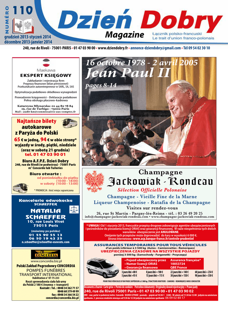 110 grudzień 2013-styczeń 2014 décembre 2013-janvier 2014 Magazine 240, rue de Rivoli - 75001-PARIS • 01 47 03 90 00 • www.dziendobry.fr • [email protected] • Tél 09 54 02 30 10 16 octobre 1978 - 2 avril 2005 EKSPERT KSIĘGOWY Zakładanie i rejestracja firm Prognozy finansowe (bilan prévisionnel) Przekształcanie autoentrepreneur w SARL, SA, SAS Jean Paul II pages 8-14 Optymalizacja podatkowo-składkowa wynagrodzeń Prowadzenie księgowości - Deklaracje podatkowe Pełna obsługa płacowo-kadrowa Katarzyna Młynarska: 01 44 82 78 84 19, rue de Turbigo - 75002 Paris Mail : [email protected] Najtańsze bilety autokarowe z Paryża do Polski 65 € w jedną, 94 € w obie strony* wyjazdy w środy, piątki, niedziele (oraz w sobotę 21 grudnia) tel. 01 47 03 90 01 Biuro A.F.P.E. Dzień Dobry 240, rue de Rivoli (w podwórzu) - 75001 Paris m° Concorde lub Tuileries Biuro otwarte : od poniedziałku do piątku (10:00 - 18:00) w soboty (10:00 - 13:00) * PROMOCJA : ilość miejsc ograniczona Kancelaria adwokacka SCHAEFFER NATALIA SCHAEFFER 10, rue Louis Vicat 75015 Paris (mówimy po polsku) 01 55 90 55 13 06 50 19 43 25 [email protected] Champagne Jackowiak - Rondeau Sélection Officielle Polonaise Champagne - Vieille Fine de la Marne Liqueur Champenoise - Ratafia de la Champagne Visites sur rendez-vous 26, rue St Martin - Pargny-lès-Reims - tél. : 03 26 49 20 25 [email protected] • www.champagne-jackowiak-rondeau.com agentów ubezpieczeniowych * UWAGA ! Od 1 stycznia 2013, francuskie przepisy drogowe zobowiązuje i pośredników do posiadania licencji ORIAS oraz gwarancji finansowej. W razie niespełnienia tych dwóch warunków ubezpieczenie jest ANULOWANE. Omijanie tych przepisów może doprowadzić do kary w wysokości 6 000 €. Strona internetowa : www.acp.banque-france.fr/controle-prudentiel ASSURANCES TEMPORAIRES POUR TOUS VÉHICULES d’un poids inférieur à 3 500 kg (Autos - Camionnettes - Remorques) UBEZPIECZENIA CZASOWE NA WSZYSTKIE POJAZDY poniżej 3 500 kg (Samochody - Furgonetki - Przyczepy) www.concordia.biz.pl Polski Zakład Pogrzebowy CONCORDIA POMPES FUNÈBRES TRANSPORT INTERNATIONAL Habilitation n° 07-75-233 Koszt sprowadzenia ciała lub urny do Polski 2 180 € (trumna + transport) Kontakt : Tel. : 0048 34 362 71 57 0048 60 379 49 99 fax : 0048 34 366 54 22 [email protected] • Pojazd ubezpieczony przez Assurance française* • Numer licencji ORIAS 10053724 • Gwarancja finansowa QBE France 3 jours/dni =80 € 5 jours/dni =93 € 8 jours/dni = 100 € 15 jours/dni = 115 € 22 jours/dni = 140 € 30 jours/dni = 158 € 60 jours/dni = 254 € 90 jours/dni = 350 € POUR TOUS VÉHICULES D’UN POIDS SUPÉRIEUR à 3 500 kg (TRACTEURS ROUTIERS - CAMIONS - REMORQUES) NOUS CONSULTER Documents à fournir : Carte grise + Permis de conduire - Potrzebne dokumenty : Oryginalny dowod rejestracyjny + Prawo jazdy 240, rue de Rivoli 75001 Paris • 01 47 03 90 00 • 01 47 03 90 02 (RDC - cour, parter w podwórzu) métro : Concorde - BIURO CZYNNE : poniedz. - piątek od 10:30-1 8:00) - W soboty od 11:30 do 12:00 jedynie na umówione spotkanie. 2 pierwsze niedziele miesiąca od 9:30 do 12:30 jedynie na umówione spotkanie 06 09 02 84 17 Polska, Polska... cała Polska ! Dzięki A.F.P.E. Dzień Dobry - najlepsze linie lotnicze biorą Was pod swoje skrzydła ! RZESZOW-BEAUVAIS 6 BEAUVAIS-RZESZOW 6 RZESZOW-BEAUVAIS2 BEAUVAIS-RZESZOW2 08.OO 11.05 11.35 14.30 09.15 12.20 12.45 15.40 WARSZAWA-BEAUVAIS 3-717.10-19.35 BEAUVAIS-WARSZAWA 3-714.25-16.40 POZNAN-BEAUVAIS 3-711.55-13.55 BEAUVAIS-POZNAN 3-720.05-22.00 GDANSK-BEAUVAIS 3-713.55-16.15 BEAUVAIS-GDANSK 3-716.45-18.50 WROCLAW BEAUVAIS 4-7 12.00-14.00 BEAUVAIS-WROCLAW 4-714.30-16.20 KATOWICE-BEAUVAIS 212.15-14.30 BEAUVAIS-KATOWICE 2 15.00-17.05 KATOWICE-BEAUVAIS 617.40-19.55 BEAUVAIS-KATOWICE 6 20.25-22.30 BEAUVAIS-WARSZAWA 1-3-509.30-11.50 WARSZAWA-BEAUVAIS 1-3-512.15-14.25 WROCLAW-BEAUVAIS 2- 4-6 13.20-15.25 BEAUVAIS-WROCLAW 2-4-615.50-18.00 KRAKOW-BEAUVAIS 2- 6 10.15-12.30 BEAUVAIS-KRAKOW 2- 6 12.55-15.10 KRAKOW-BEAUVAIS 415.25-17.40 BEAUVAIS-KRAKOW 418.05-20.15 PARIS-CDG-KRAKOW 1-5-6-707.45-10.05 KRAKOW-PARIS CDG 1-5-6-7 10.35-13.00 PARIS-CDG-KRAKOW 411.05-13.25 KRAKOW-PARIS CDG 4 13.55-16.15 PLUSIEURS VOLS JOURS PARIS ORLY BERLIN TOUS LES JOURS PLUSIEURS VOLS JOURS BERLIN-PARIS ORLY (1) lundi (pon.) • (2) mardi (wtorek) • (3) mercredi (środa) • (4) jeudi (czwartek) (5) vendredi (piątek) • (6) samedi (sobota) • (7) dimanche (niedziela) PARIS - WARSZAWA tél. : 01 47 03 90 02 WARSZAWA - PARIS tél. : 01 47 03 90 02 PARIS - WARSZAWA tél. : 01 47 03 90 00 WARSZAWA - PARIS tél. : 01 47 03 90 00 HORAIRESFRÉQUENCES GODZINY DNI LOTÓW 07:15 - 09:35 11:00 - 13:20 16:30 - 18:50 19:30 - 21:50 07:40 - 10:10 13:00 - 15:30 16:15 - 18:40 19:55 - 22:20 09:45 - 12:00 12:45 - 15:10 15:45 - 18:10 18:30 - 20:55 06:50 - 09:15 12:45 - 15:10 15:45 - 18:10 18:30 - 20:55 1,2,4,5,6 tous les jours 1,2,3,4,5 tous les jours tous les jours 1,2,3,4,5,7 tous les jours tous les jours tous les jours tous les jours 1,2,3,4,5,7 tous les jours tous les jours tous les jours tous les jours 1,2,3,4,5,7 Czytaj Artykuł Redakcji strona 5 Polska na wyciągnięcie ręki ! Tanie przeloty do Polski w Biurze A.F.P.E. - 240, rue de Rivoli - 75001 Paris Tel. : 09 54 02 30 10 Biuro czynne codziennie od 10:30 do 18:00 (w soboty od 10:30 do 13:00) Kupując bilet wcześniej oszczędzasz ! PŁACĄC KARTĄ KREDYTOWĄ OTRZYMASZ BILET TEGO SAMEGO DNIA za pośrednictwem e-mail, faksu lub pocztą nazajutrz. Tel. : 09 54 02 30 10 2 Dzień Dobry dziendobry.fr Vos loisirs et diVertissements ertissements à prix légers grâce aux réductions 25% et 50% ! Disneyland Walt Hélias Disney plus connu sous le nom de Walt Disney naquit le 5 décembre 1901 à Chicago. Il était le quatrième enfant d’une famille d’origine irlandaise. A 16 ans il quitte l’école et veut s’engager ( en 1917 ) dans l’armée américaine. Bien que faisant plus vieux que son âge, il ne pe