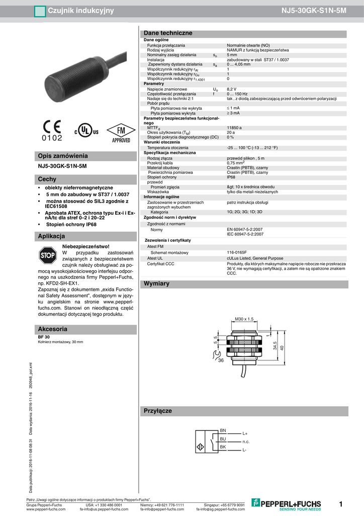 Czujnik indukcyjny NJ5-30GK-S1N-5M Dane techniczne 0102 Opis zamówienia NJ5-30GK-S1N-5M Cechy • • • • • obiekty nieferromagnetyczne 5 mm do zabudowy w ST37 / 1.0037 można stosować do SIL3 zgodnie z IEC61508 Aprobata ATEX, ochrona typu Ex-i i ExnA/tc dla stref 0–2 i 20–22 Stopień ochrony IP68 Aplikacja Niebezpieczeństwo! W przypadku zastosowań związanych z bezpieczeństwem czujnik należy obsługiwać za pomocą wysokojakościowego interfejsu odpornego na uszkodzenia firmy Pepperl+Fuchs, np. KFD2-SH-EX1. Zapoznaj się z dokumentem „exida Functional Safety Assessment”, dostępnym w języku angielskim na stronie www.pepperlfuchs.com. Stanowi on nieodłączną część dokumentacji dotyczącej tego produktu. Dane ogólne Funkcja przełączania Rodzaj wyjścia Nominalny zasięg działania sn Instalacja Zapewniony dystans działania sa Współczynnik redukcyjny rAl Współczynnik redukcyjny rCu Współczynnik redukcyjny r1.4301 Parametry Napięcie znamionowe Uo Częstotliwość przełączania f Nadaje się do techniki 2:1 Pobór prądu Płyta pomiarowa nie wykryta Płyta pomiarowa wykryta Parametry bezpieczeństwa funkcjonalnego MTTFd Okres użytkowania (TM) Stopień pokrycia diagnostycznego (DC) Warunki otoczenia Temperatura otoczenia Specyfikacja mechaniczna Rodzaj złącza Przekrój kabla Materiał obudowy Powierzchnia pomiarowa Stopień ochrony przewód Promień zgięcia Wskazówka Informacje ogólne Zastosowanie w przestrzeniach zagrożonych wybuchem Kategoria Zgodność norm i dyrektyw Normalnie otwarte (NO) NAMUR z funkcją bezpieczeństwa 5 mm zabudowany w stali ST37 / 1.0037 0 ... 4,05 mm 1 1 0 8,2 V 0 ... 150 Hz tak , z diodą zabezpieczającą przed odwróceniem polaryzacji ≤ 1 mA ≥ 3 mA 11850 a 20 a 0% -25 ... 100 °C (-13 ... 212 °F) przewód silikon , 5 m 0,75 mm2 Crastin (PBTB), czarny Crastin (PBTB), czarny IP68 > 10 x średnica obwodu tylko dla metali nieżelaznych patrz instrukcja obsługi 1G; 2G; 3G; 1D; 3D Zgodność z normami Normy EN 60947-5-2:2007 IEC 60947-5-2:2007 Zezwolenia i certyfikaty Atest FM Schemat montażowy Atest UL Certyfikat CCC 116-0165F cULus Listed, General Purpose Produkty, dla których maksymalne napięcie robocze nie przekracza 36 V, nie wymagają certyfikacji, a zatem nie są opatrzone znakiem CCC. Wymiary M30 x 1.5 250948_pol.xml 36 Przyłącze Data publikacji: 2016-11-08 08:31 Data wydania: 2016-11-16 40 Kołnierz montażowy, 30 mm 34.5 5 5 BF 30 1 Akcesoria Patrz „Uwagi ogólne dotyczące informacji o produktach firmy Pepperl+Fuchs”. USA: +1 330 486 0001 Grupa Pepperl+Fuchs Niemcy: +49 621 776-1111 www.pepperl-fuchs.com [email protected] [email protected] BN BU BK L+ n.c. L- Singapur: +65 6779 9091 [email protected] 1 Czujnik indukcyjny NJ5-30GK-S1N-5M Ochrona sprzętu — poziom Ga Instrukcja Urządzenia elektryczne dla przestrzeni zagrożonych wybuchem Urządzenie kategorii 1G do użytku w przestrzeniach zagrożonych wybuchem gazu, oparów i mgły. Certyfikat badania typu EC PTB 00 ATEX 2049 X Oznakowanie CE 0102 Oznaczenie ATEX ¬ II 1G Ex ia IIC T6…T1 Ga Oznaczenie związane z Ex może być również nadrukowane na załączonej etykiecie. Normy EN 60079-0:2012+A11:2013 EN 60079-11:2012 Zabezpieczenie przed zapłonem - wykonanie iskrobezpieczne ograniczenie przez następujące warunki Odpowiedni typ NJ 5-30GK-S1N... Skuteczna indukcyjność wewnętrzna Ci ≤ 100 nF ; Uwzględniona długość kabla 10 m. Informacje ogólne Urządzenie należy używać zgodnie z danymi katalogowymi oraz danymi zawartymi w tej instrukcji obsługi. Należy przestrzegać wymagań certyfikatu badania typu UE. Należy przestrzegać warunków szczególnych! Dyrektywa ATEX oraz certyfikat badania typu UE dotyczą jedynie użytkowania urządzeń elektrycznych w warunkach atmosferycznych. Urządzenie zostało sprawdzone pod względem funkcjonalności w temperaturze otoczenia > 60°C przez odpowiedni urząd certyfikacji. Temperatura powierzchni urządzenia pozostaje w dopuszczalnej normie. W przypadku używania urządzenia w warunkach innych niż atmosferyczne, należy wziąć pod uwagę redukcję minimalnej dopuszczalnej energii zapłonu. Temperatura otoczenia Szczegóły korelacji między typem podłączonego obwodu, maksymalną dopuszczalną temperaturą otoczenia, temperaturą powierzchni i efektywnymi wartościami reaktancji wewnętrznej można znaleźć w certyfikacie badania typu WE. Uwaga: używać tabeli temperatur dla kategorii 1 !!! Zgodnie z normą EN 1127-1 w tabeli temperatur dla kategorii 1 została zastosowana 20% redukcja. Montaż, uruchomienie Należy przestrzegać przepisów prawnych i/lub rozporządzeń i norm regulujących użycie lub też użycia zgodnego z przeznaczeniem. Iskrobezpieczność urządzeń jest gwarantowana jedynie w przypadku podłączenia z urządzeniem przynależnym, które posiada zaświadczenie o wykonaniu iskrobezpiecznym. Przynależne urządzenie musi spełniać wymagania kategorii "ia". Ze względu na niebezpieczeństwo zapłonu, do którego może dojść wskutek błędów oraz/lub prądów fazowych w systemie wyrównania potencjałów, należy odizolować galwanicznie obwód prądu zasilającego od obwodu prądu sygnałowego. Zastosowanie przynależnego urządzenia bez izolacji galwanicznej dozwolone jest tylko wtedy, gdy spełnione są odpowiednie wymagania normy IEC 60079-14. Jeśli oznaczenia związane z kategorią Ex są nadrukowane wyłącznie na dostarczonej etykiecie, należy ją przymocować jak najbliżej czujnika. Powierzchnia przylepna etykiety musi być wolna od brudu i tłuszczu. Przyklejona etykieta musi czytelna i odporna na ścieranie, nawet w przypadku możliwej korozji chemicznej. Obsługa Nie wolno dokonywać żadnych zmian przy urządzeniach przeznaczonych do pracy w przestrzeniach zagrożonych wybuchem. Wykonywanie napraw tych urządzeń nie jest możliwe. Skuteczna induktancja wewnętrzna Li ≤ 200 µH ; Uwzględniona długość kabla 10 m. Warunki specjalne W przypadku 