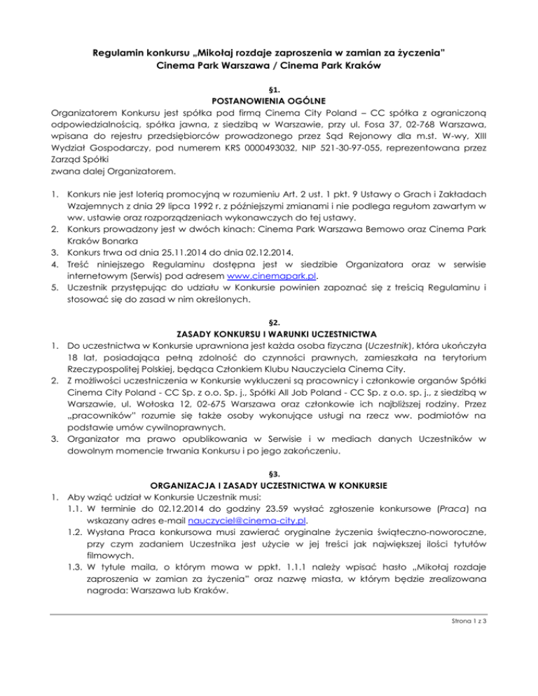 Regulamin konkursu „Mikołaj rozdaje zaproszenia w zamian za życzenia” Cinema Park Warszawa / Cinema Park Kraków §1. POSTANOWIENIA OGÓLNE Organizatorem Konkursu jest spółka pod firmą Cinema City Poland – CC spółka z ograniczoną odpowiedzialnością, spółka jawna, z siedzibą w Warszawie, przy ul. Fosa 37, 02-768 Warszawa, wpisana do rejestru przedsiębiorców prowadzonego przez Sąd Rejonowy dla m.st. W-wy, XIII Wydział Gospodarczy, pod numerem KRS 0000493032, NIP 521-30-97-055, reprezentowana przez Zarząd Spółki zwana dalej Organizatorem. 1. Konkurs nie jest loterią promocyjną w rozumieniu Art. 2 ust. 1 pkt. 9 Ustawy o Grach i Zakładach Wzajemnych z dnia 29 lipca 1992 r. z późniejszymi zmianami i nie podlega regułom zawartym w ww. ustawie oraz rozporządzeniach wykonawczych do tej ustawy. 2. Konkurs prowadzony jest w dwóch kinach: Cinema Park Warszawa Bemowo oraz Cinema Park Kraków Bonarka 3. Konkurs trwa od dnia 25.11.2014 do dnia 02.12.2014. 4. Treść niniejszego Regulaminu dostępna jest w siedzibie Organizatora oraz w serwisie internetowym (Serwis) pod adresem www.cinemapark.pl. 5. Uczestnik przystępując do udziału w Konkursie powinien zapoznać się z treścią Regulaminu i stosować się do zasad w nim określonych. §2. ZASADY KONKURSU I WARUNKI UCZESTNICTWA 1. Do uczestnictwa w Konkursie uprawniona jest każda osoba fizyczna (Uczestnik), która ukończyła 18 lat, posiadająca pełną zdolność do czynności prawnych, zamieszkała na terytorium Rzeczypospolitej Polskiej, będąca Członkiem Klubu Nauczyciela Cinema City. 2. Z możliwości uczestniczenia w Konkursie wykluczeni są pracownicy i członkowie organów Spółki Cinema City Poland - CC Sp. z o.o. Sp. j., Spółki All Job Poland - CC Sp. z o.o. sp. j., z siedzibą w Warszawie, ul. Wołoska 12, 02-675 Warszawa oraz członkowie ich najbliższej rodziny. Przez „pracowników” rozumie się także osoby wykonujące usługi na rzecz ww. podmiotów na podstawie umów cywilnoprawnych. 3. Organizator ma prawo opublikowania w Serwisie i w mediach danych Uczestników w dowolnym momencie trwania Konkursu i po jego zakończeniu. §3. ORGANIZACJA I ZASADY UCZESTNICTWA W KONKURSIE 1. Aby wziąć udział w Konkursie Uczestnik musi: 1.1. W terminie do 02.12.2014 do godziny 23.59 wysłać zgłoszenie konkursowe (Praca) na wskazany adres e-mail [email protected]. 1.2. Wysłana Praca konkursowa musi zawierać oryginalne życzenia świąteczno-noworoczne, przy czym zadaniem Uczestnika jest użycie w jej treści jak największej ilości tytułów filmowych. 1.3. W tytule maila, o którym mowa w ppkt. 1.1.1 należy wpisać hasło „Mikołaj rozdaje zaproszenia w zamian za życzenia” oraz nazwę miasta, w którym będzie zrealizowana nagroda: Warszawa lub Kraków. Strona 1 z 3 1.4. Nagrodzonych zostanie 15 osób w każdym z dwóch miast, w których znajdują się kina Cinema Park. 1.5. Pod uwagę będą brane tylko te Prace konkursowe, które spełniają wymogi regulaminowe, dotrą we wskazanym terminie oraz na wskazany w punkcie 1.1.1 adres mailowy. 2. Uczestnik może dokonać tylko jednego zgłoszenia w Konkursie, które jest równe szansie na jedną nagrodę przewidzianą w Konkursie. 3. Zgłoszenie Pracy do konkursu jest równoznaczne z akceptacją regulaminu oraz nieodpłatnym przekazaniem praw autorskich do niej na rzecz Organizatora, o których mowa w art. 50 ustawy z dnia 4 lutego 1994 r. o prawach autorskich i prawach pokrewnych ( Dz. U. z 1994r., Nr 24, poz. 83) oraz do publikacji w wydawnictwach wszelkiego typu, wydawanych przez Organizatora, także w Internecie oraz w kontekście informacji o konkursie i jego Laureatach. 1. 2. 3. 4. 5. 6. 7. 1. 2. 3. 4. 5. 6. §4. KRYTERIA OCEN I ZASADY PRZYZNAWANIA NAGRÓD Prace będą oceniane przez trzyosobową komisję składającą się z przedstawiciela lokalnego kina Cinema City (Warszawa, Kraków), koordynatora Klubu Nauczyciela oraz przedstawiciela interaktywnego kina Cinema Park, która wytypuje laureatów najlepszych Prac. Nagrodzonych zostanie trzydzieści Prac (po 15 z każdego miasta). Prace będą oceniane pod względem: 1.1 Ilości użytych tytułów filmowych w treści życzeń (30% oceny), 1.2 zabawności (30% oceny), 1.3 oryginalności (30% oceny), 1.4 kolejności zgłoszeń (10% oceny) Wyniki konkursu zostaną ogłoszone w dniu 4 grudnia 2014 w Serwisie www.cinemapark.pl. Prace niespełniające warunków regulaminowych nie będą klasyfikowane przez Komisję a decyzje Komisji będą ostateczne i nieodwołalne. Prace przesłane po terminie nie będą oceniane. Laureaci konkursu zostaną poinformowani o przyznaniu nagród telefonicznie lub/oraz drogą mailową w dniu 4 grudnia 2014 do 23:59. §5. NAGRODY Do celów Konkursu Organizator ufundował 30 czteroosobowych, rodzinnych zaproszeń, po 15 w każdym z dwóch miast: Warszawa i Kraków, na pokaz interaktywnego programu ”Królestwo Zwierząt”. Pokaz odbędzie się w dniu 6 grudnia 2014, o godzinie 11:00, w Cinema Park Bemowo w Warszawie oraz Cinema Park Bonarka w Krakowie. Lista zwycięzców konkursu zostanie ogłoszona w dniu 4 grudnia 2014 w serwisie www.cinemapark.pl. Nagrody nie podlegają wymianie na inne lub na ekwiwalent pieniężny. Laureaci nie mają prawa zastrzeżenia szczególnych właściwości nagród. O dalszym przeznaczeniu nagród nieprzyznanych i / lub nieodebranych decyduje Organizator. Organizator może ufundować dodatkowe nagrody. §6. PRZYZNAWANIE I WYDAWANIE NAGRÓD 1. O przyznaniu Nagrody Laureat zostanie powiadomiony wiadomością wysłaną na podany w zgłoszeniu adres e-mail, najpóźniej do dnia 04.12.2014 do godziny 23.59. Najpóźniej w tym terminie lista Laureatów zawierająca imiona oraz pierwsze litery nazwisk zostanie również Strona 2 z 3 2. 3. 4. 5. opublikowana na stronie organizatora www.cinemapark.pl Miejscem wydawania nagród, jest wskazane przez Organizatora kino Cinema Park, w mieście które podane zostało w tytule zgłoszenia. Nagrodę na
