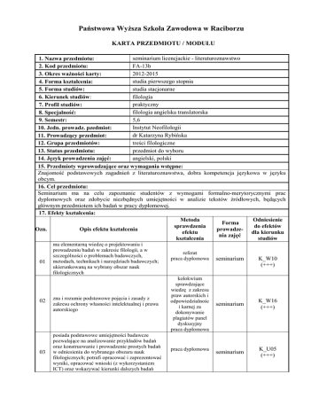 Państwowa Wyższa Szkoła Zawodowa w Raciborzu KARTA PRZEDMIOTU / MODUŁU seminarium licencjackie - literaturoznawstwo 1. Nazwa przedmiotu: FA-13b 2. Kod przedmiotu: 2012-2015 3. Okres ważności karty: studia pierwszego stopnia 4. Forma kształcenia: studia stacjonarne 5. Forma studiów: 6. Kierunek studiów: filologia praktyczny 7. Profil studiów: filologia angielska translatorska 8. Specjalność: 5,6 9. Semestr: Instytut Neofilologii 10. Jedn. prowadz. pzedmiot: dr Katarzyna Rybińska 11. Prowadzący przedmiot: treści filologiczne 12. Grupa przedmiotów: 13. Status przedmiotu: przedmiot do wyboru 14. Język prowadzenia zajęć: angielski, polski 15. Przedmioty wprowadzające oraz wymagania wstępne: Znajomość podstawowych zagadnień z literaturoznawstwa, dobra kompetencja językowa w języku obcym. 16. Cel przedmiotu: Seminarium ma na celu zapoznanie studentów z wymogami formalno-merytorycznymi prac dyplomowych oraz zdobycie niezbędnych umiejętności w analizie tekstów źródłowych, będących głównym przedmiotem ich badań w pracy dyplomowej. 17. Efekty kształcenia: Metoda Odniesienie Forma sprawdzenia do efektów Ozn. Opis efektu kształcenia prowadzeefektu dla kierunku nia zajęć kształcenia studiów 01 02 03 ma elementarną wiedzę o projektowaniu i prowadzeniu badań w zakresie filologii, a w szczególności o problemach badawczych, metodach, technikach i narzędziach badawczych; ukierunkowaną na wybrany obszar nauk filologicznych zna i rozumie podstawowe pojęcia i zasady z zakresu ochrony własności intelektualnej i prawa autorskiego posiada podstawowe umiejętności badawcze pozwalające na analizowanie przykładów badań oraz konstruowanie i prowadzenie prostych badań w odniesieniu do wybranego obszaru nauk filologicznych; potrafi opracować i zaprezentować wyniki, opracować wnioski (z wykorzystaniem ICT) oraz wskazywać kierunki dalszych badań referat praca dyplomowa kolokwium sprawdzające wiedzę z zakresu praw autorskich i odpowiedzialnośc i karnej za dokonywanie plagiatów panel dyskusyjny praca dyplomowa praca dyplomowa seminarium K_W10 (+++) seminarium K_W16 (+++) seminarium K_U05 (+++) 04 05 potrafi w podstawowym zakresie stosować przepisy prawa odnoszącego się do instytucji związanych z wybraną sferą działalności filologa, w szczególności prawa autorskiego i związane z zarządzaniem własnością intelektualną ma świadomość poziomu swojej wiedzy i umiejętności, rozumie potrzebę ciągłego dokształcania się zawodowego i rozwoju osobistego, dokonuje samooceny własnych kompetencji i doskonali umiejętności, wyznacza kierunki własnego rozwoju i kształcenia 18. Formy i wymiar zajęć: 19. Treści kształcenia: panel dyskusyjny praca dyplomowa referat praca dyplomowa seminarium seminarium K_U08 (+++) K_K01 K. (15h+15h) Treści programowe obejmują porady praktyczne dotyczące pisania prac licencjackich: najważniejsze wskazówki merytoryczne i metodologiczne. W ramach kursu studenci będą doskonalić swój warsztat filologiczny oraz zapoznawać się z ujęciami teoretycznymi modernizmu w prozie i poezji dwudziestego wieku. Każdy seminarzysta zostanie poinformowany o obowiązku przestrzegania zasad etyki związanej z własną i cudzą pracą twórczą. Wśród poruszanych na seminarium zagadnień znajdą się m.in. nowe techniki narracyjne i filmowe w powieści, awangardowe środki wyrazu, poetyka symbolizmu i ekspresjonizmu europejskiego oraz eksperymentalne sposoby zapisu strumienia świadomości. 20. Egzamin: nie (z/o) 21. Literatura podstawowa: Mahaffey Vicki, Modernist literature : challenging fictions, Malden, MA : Blackwell Publishing, 2007. Modernism, edited by Michael H. Whitworth. - Malden [etc.] : Blackwell, 2007. The Cambridge companion to feminist literary theory, edited by Ellen Rooney, Cambridge, UK : Cambridge University Press, 2006. 21. Literatura uzupełniająca: Eco Umberto, Sześć przechadzek po lesie fikcji, przeł. Jerzy Jarniewicz. - Wyd. 2 popr. Kraków : Społeczny Instytut Wydawniczy Znak, 2007. Eco Umberto, Interpretacja i nadinterpretacja [oraz] Richard Rorty, Jonathan Culler, Christine Brooke-Rose ; red. Stefan Collini ; przeł. Tomasz Bieroń. - Wyd. 2. - Kraków : Społeczny Instytut Wydawniczy Znak, 2008. Eco Umberto, Dzieło otwarte : forma i nieokreśloność w poetykach współczesnych, przeł. Lesław Eustachiewicz [et al.]. - Wyd. 3 popr. i uzup. - Warszawa : Wydawnictwo W.A.B., 2008. 23. Nakład pracy studenta potrzebny do osiągnięcia efektów kształcenia: Liczba godzin Lp Forma zajęć kontaktowych / pracy studenta 1. Wykład 2. Konwersatorium 30 3. Laboratorium 4. Projekt 5. Seminarium - udział w konsultacjach – 5, - czytanie opracowań naukowych, materiału źródłowego, kwerenda bibliograficzna – 250, - praca nad rozdziałami, wstępem i wnioskami 6. Inne końcowymi – 200, - opracowanie zagadnień literaturoznawczych – 45, - przygotowanie planu pracy, redakcja pracy dyplomowej - 30 Suma godzin 24. Suma wszystkich godzin: 26. Liczba punktów ECTS uzyskanych na zajęciach z bezpośrednim udziałem nauczyciela akademickiego: 28. Uwagi: 660 1 660 25. Liczba punktów ECTS: 27. Liczna punktów ECTS uzyskanych w wyniku pracy samodzielnej studenta: Zatwierdzono: ……………………………. (data i podpis prowadzącego) ………………………………………………… (data i podpis) 22 21