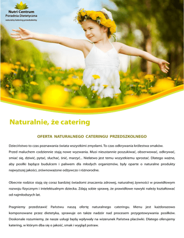 Naturalnie, że catering OFERTA NATURALNEGO CATERINGU PRZEDSZKOLNEGO Dzieciństwo to czas poznawania świata wszystkimi zmysłami. To czas odkrywania królestwa smaków. Przed maluchem codziennie stają nowe wyzwania. Musi nieustannie poszukiwać, obserwować, odkrywać, smiać się, dziwić, pytać, słuchać, śnić, marzyć... Niełatwo jest temu wszystkiemu sprostać. Dlatego ważne, aby posiłki będące budulcem i paliwem dla młodych organizmów, były oparte o naturalne produkty najwyższej jakości, zrównoważone odżywczo i różnorodne. Obecnie rodzice stają się coraz bardziej świadomi znaczenia zdrowej, naturalnej żywności w prawidłowym rozwoju fizycznym i intelektualnym dziecka. Zdają sobie sprawę, że prawidłowe nawyki należy kształtować od najmłodszych lat. Pragniemy przedstawić Państwu naszą ofertę naturalnego cateringu. Menu jest każdorazowo komponowane przez dietetyka, sprawuje on także nadzór nad procesem przygotowywania posiłków. Doskonale rozumiemy, że nasze usługi będą wpływały na wizerunek Państwa placówki. Dlatego oferujemy katering, w którym dba się o jakość, smak i wygląd potraw. Każdy zyskuje Przedszkole zyskuje nową, wysoką jakość posiłków komponowanych przez dietetyka i przygotowywanych pod jego okiem. Możemy być spokojni, że będą to posiłki pełne najlepszych wartości. • I lub II śniadanie • obiad • podwieczorek *Istnieje także możliwość zamawiania samych obiadów. Dodatkowo Wzrost prestiżu placówki w oczach rodziców obecnych i przyszłych przedszkolaków. Brak konieczności zatrudniania dodatkowego personelu i dostosowania się do wymagań sanepidu. Pomoc w organizacji imprez i spotkań, zarówno od strony cateringowej jak i edukacji zdrowotnej. Dzieciaki pokochają, pyszne, pełnowarościowe posiłki. Dania podane w atrakcyjny sposób i dostosowane do ich gustów. Otrzymają bogaty pakiet zajęć mających na celu zapoznanie maluchów z nowymi być może smakami i produktami. Wierzymy, że jedną z najlepszych metod wychowawczych jest zaangażowenie. Dlatego w każdym przedskolu znajdzie się kiełkownica wraz z nasionkami na start, tak aby dzieci mogły same włączyć się w produkcję zdrowej żywności, obserwować wzrost roślinek i dodawać je później do posiłków. Rodzice zyskują pewność, że ich dziecko jest pod właściwą opieką, a dieta ich pociech jest przygotowywana przez specjalistę z wykorzystaniem produktów wyłącznie najwyższej jakości. W ramach umowy rodzice otrzymują pakiet warsztatów kulinarnych, tak aby zdrowe żywienie mogli wprowadzić także w domu. Przygotowywane przez nas potrawy ...są zawsze z kawałeczkiem naszego serca, pełne ciepła. Wszystko przygotowujemy sami, z myślą o naszych małych wymagających klientach. • Wiedząc jak ważny jest wygląd potraw, staramy się zaciekawić fakturą, teksturą, kształtem. • Uważamy, że dzieci powinny jeść produkty najlepszej jakości, służące ich prawidłowemu rozwojowi. • Dlatego jeśli to tylko możliwe wykorzystujemy produkty ekologiczne. Poza nimi używamy produktów lokalnych, pochodzących z małych gospodarstw rolnych, tak aby droga z pola na stół była jak najkrótsza. • Dbamy, aby jak najczęściej pojawiała się świeża rybka. • Chętnie wykorzystujemy różnorodność, pyszność i wartosciowość nasion roślin strączkowych. • Używamy wyłącznie naturalnego nabiału i jaj od szczęśliwych kurek. • Szczególną uwagę zwracamy na skład używanych produktów. • Z ogromną uwagą dobieramy je tak, aby nie zawierają żadnych zbędnych dodatków. • Pochodzenie i skład używanych produktów są zawsze do wglądu dyrekcji przedszkola oraz rodziców. • Produkty zbożowe są w nieoczyszczonej postaci. Proponujemy pieczywo razowe na zakwasie, potrawy z pełnoziarnistej mąki oraz całe ziarna rozmaitych zbóż (kasza gryczana, jaglana, pęczak, owies, orkisz, brązowy ryż, amarantus, komosa ryżowa i inne). • Doceniamy dary Matki Natury i korzystamy z nich w zgodzie z porami roku. • Nie zapominamy również o słodkiej stronie dzieciństwa. Maluchy mogą zajadać się zdrowymi smakołykami przygotowywanymi wyłącznie przez nas. Słodzone są miodem (z własnej kaszubskiej pasieki!), bakaliami i owocami. *Istnieje również możliwość zamawiania posiłków dostosowanych do diety wegetariańskiej, bezglutenowej, bez fenyloalaniny, eliminującą pewne składniki (np. orzechy, ryby, kakao) oraz inne. W naszej kuchni nie używamy wysoko przetworzonych produktów spożywczych, czyli takich, które w swoim składzie mają więcej niż 3 składniki i dużo w swoim życiu przeszły. Produktów, które w swoim składzie miałyby jakikolwiek konserwant, polepszacz smaku, barwnik, spulchniacz. Wysoko oczyszczonych węglowodanów takich jak cukier, biała mąka, biały makaron czy biały ryż. Wytworów przemysłu mięsnego takich jak parówki, pasztety, wędliny. Margaryny i oleju rafinowanego.. Gotowych słodkich przekąsek. Mikrofalówki. Przykładowe menu Dzień tygodnia Śniadanie Poniedziałek Granola z jogurtem domowym Wtorek Kanapeczki z humusem i ogórkiem kiszonym Środa Czwartek Piątek Obiad Podwieczorek Słoneczna zupa z soczewicy Razowy tort naleśnikowy ze szpinakiem Sałatka owocowa Krupnik z kaszy jęczmiennej Kawałeczki kurczaka w orzechowej panierce, ziemniaki z pieca, surówka z marchewki Batoniki owsianobakaliowe Pulpeciki rybne w sosie jogurtowokoperkowym, kasza gryczana, kapustka kiszona Mufinki razowe z bakaliami Zielona zupa Kasza jaglana z brokułowa z jabłkiem i grzankami z chleba orzechami włoskimi razowego Jajka na miękko, kiełki z dziecięcej hodowli, grahamka Zupa z pieczonej papryki z makaronem Babeczki z kaszy jaglanej i soczewicy, surówka z buraczków pieczonych Gofry owsiane z owocami Kanapeczki z pastą z kiełków pszenicy Zupa z fasolki szparagowej z ziemniaczkami Kotleciki z łososia z ryżem brązowym, surówka z białej kapus