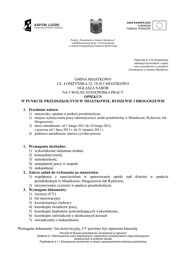 Projekt ,,Przedszkola w Gminie Miastkowo" współfinansowany przez Unię Europejską w ramach Europejskiego Funduszu Społecznego Załącznik nr 5 do Regulaminu rekrutacji uczestników i kadry oraz uczestnictwa w projekcie „Przedszkola w Gminie Miastkowo GMINA MIASTKOWO UL. ŁOMŻYŃSKA 32, 18-413 MIASTKOWO OGŁASZA NABÓR NA 3 WOLNE STANOWISKA PRACY OPIEKUN W PUNKCIE PRZEDSZKOLNYM W MIASTKOWIE, RYDZEWIE I DROGOSZEWIE 1. Przedmiot naboru 1) stanowisko: opiekun w punkcie przedszkolnym; 2) miejsce wykonywania pracy (alternatywnie): punkt przedszkolny w Miastkowie, Rydzewie, lub Drogoszewie; 3) okres zatrudnienia: od 1 lutego 2011 do 10 lutego 2012, z przerwą od 1 lipca 2011 r. do 31 sierpnia 2011 r. 4) podstawa zatrudnienia: umowa cywilno-prawna. 1. Wymagania niezbędne: 1) wykształcenie minimum średnie, 2) komunikatywność, 3) samodzielność, 4) umiejętność pracy w zespole, 5) niekaralność. 2. Zakres zadań do wykonania na stanowisku: 1) współpraca z nauczycielem w sprawowaniu opieki nad dziećmi w punkcie przedszkolnym w Miastkowie, Drogoszewie lub Rydzewie, 2) utrzymywanie czystości w punkcie przedszkolnym. 3. Wymagane dokumenty: 1) życiorys (CV) 2) list motywacyjny 3) kwestionariusz osobowy 4) kserokopie świadectw pracy, 5) kserokopie dyplomów potwierdzających wykształcenie, 6) kserokopie zaświadczeń o ukończonych kursach 7) oświadczenie o niekaralności. Wymagane dokumenty: list motywacyjny, CV powinny być opatrzone klauzulą: Priorytet IX Rozwój wykształcenia i kompetencji w regionach Działanie 9.1 Wyrównywanie szans edukacyjnych i zapewnienie wysokiej jakości usług edukacyjnych świadczonych w systemie oświaty Poddziałanie 9.1.1 Zmniejszanie nierówności w stopniu upowszechniania edukacji przedszkolnej Projekt ,,Przedszkola w Gminie Miastkowo" współfinansowany przez Unię Europejską w ramach Europejskiego Funduszu Społecznego „Wyrażam zgodę na przetwarzanie moich danych osobowych zawartych w ofercie pracy dla potrzeb niezbędnych do realizacji procesu rekrutacji zgodnie z Ustawą z dnia 29 sierpnia 1997 r. o ochronie danych osobowych (Dz. U. z 2002 r. Nr 101, poz.926 z późn. zm.) oraz ustawą z dnia 21 listopada 2008 r. o pracownikach samorządowych (Dz. U. z 2008 r. Nr 223, poz. 1458)”. Zgłoszenie następuje poprzez dostarczenie dokumentów osobiście lub pocztą do Biura Projektu znajdującego się w siedzibie Urzędu Gminy Miastkowo ul. Łomżyńska 32 pok. nr 17 w zamkniętej kopercie z dopiskiem: Oferta na stanowisko pracy: opiekun w punkcie przedszkolnym w ………………….” Zgłoszenie należy składać do dnia 21 stycznia 2011 roku do godz. 1500. Priorytet IX Rozwój wykształcenia i kompetencji w regionach Działanie 9.1 Wyrównywanie szans edukacyjnych i zapewnienie wysokiej jakości usług edukacyjnych świadczonych w systemie oświaty Poddziałanie 9.1.1 Zmniejszanie nierówności w stopniu upowszechniania edukacji przedszkolnej
