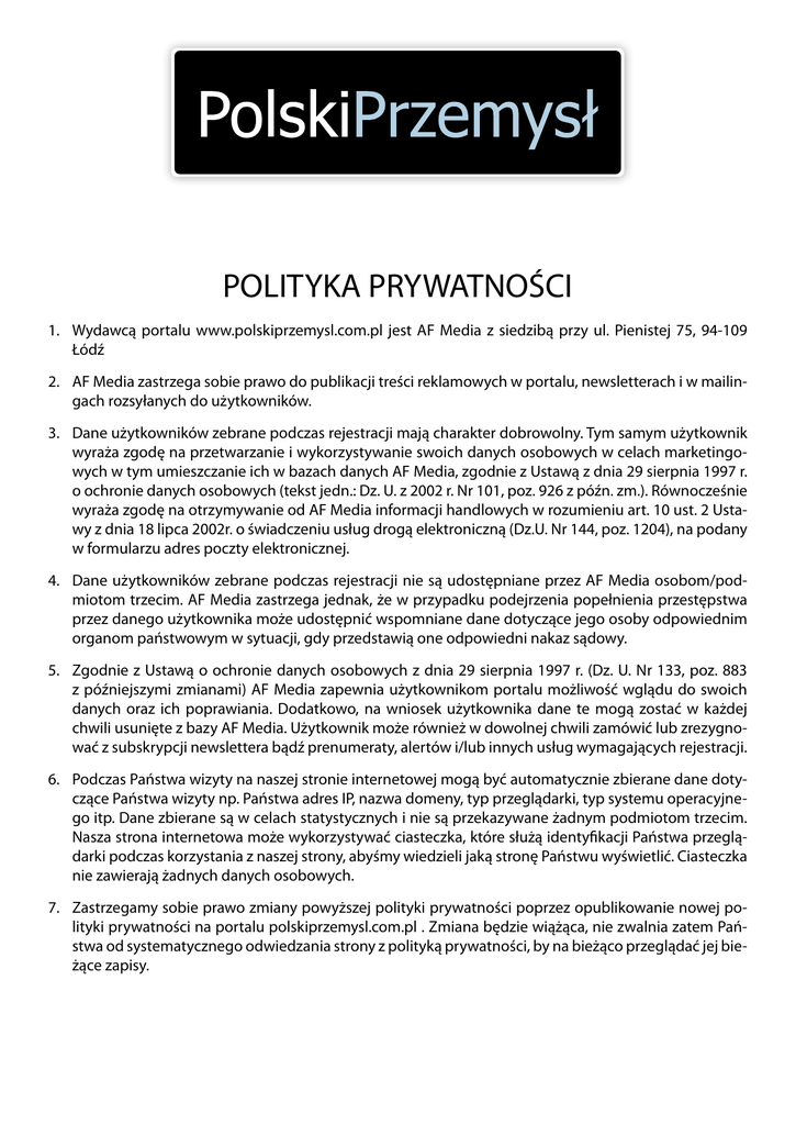 POLITYKA PRYWATNOŚCI 1. Wydawcą portalu www.polskiprzemysl.com.pl jest AF Media z siedzibą przy ul. Pienistej 75, 94-109 Łódź 2. AF Media zastrzega sobie prawo do publikacji treści reklamowych w portalu, newsletterach i w mailingach rozsyłanych do użytkowników. 3. Dane użytkowników zebrane podczas rejestracji mają charakter dobrowolny. Tym samym użytkownik wyraża zgodę na przetwarzanie i wykorzystywanie swoich danych osobowych w celach marketingowych w tym umieszczanie ich w bazach danych AF Media, zgodnie z Ustawą z dnia 29 sierpnia 1997 r. o ochronie danych osobowych (tekst jedn.: Dz. U. z 2002 r. Nr 101, poz. 926 z późn. zm.). Równocześnie wyraża zgodę na otrzymywanie od AF Media informacji handlowych w rozumieniu art. 10 ust. 2 Ustawy z dnia 18 lipca 2002r. o świadczeniu usług drogą elektroniczną (Dz.U. Nr 144, poz. 1204), na podany w formularzu adres poczty elektronicznej. 4. Dane użytkowników zebrane podczas rejestracji nie są udostępniane przez AF Media osobom/podmiotom trzecim. AF Media zastrzega jednak, że w przypadku podejrzenia popełnienia przestępstwa przez danego użytkownika może udostępnić wspomniane dane dotyczące jego osoby odpowiednim organom państwowym w sytuacji, gdy przedstawią one odpowiedni nakaz sądowy. 5. Zgodnie z Ustawą o ochronie danych osobowych z dnia 29 sierpnia 1997 r. (Dz. U. Nr 133, poz. 883 z późniejszymi zmianami) AF Media zapewnia użytkownikom portalu możliwość wglądu do swoich danych oraz ich poprawiania. Dodatkowo, na wniosek użytkownika dane te mogą zostać w każdej chwili usunięte z bazy AF Media. Użytkownik może również w dowolnej chwili zamówić lub zrezygnować z subskrypcji newslettera bądź prenumeraty, alertów i/lub innych usług wymagających rejestracji. 6. Podczas Państwa wizyty na naszej stronie internetowej mogą być automatycznie zbierane dane dotyczące Państwa wizyty np. Państwa adres IP, nazwa domeny, typ przeglądarki, typ systemu operacyjnego itp. Dane zbierane są w celach statystycznych i nie są przekazywane żadnym podmiotom trzecim. Nasza strona internetowa może wykorzystywać ciasteczka, które służą identyfikacji Państwa przeglądarki podczas korzystania z naszej strony, abyśmy wiedzieli jaką stronę Państwu wyświetlić. Ciasteczka nie zawierają żadnych danych osobowych. 7. Zastrzegamy sobie prawo zmiany powyższej polityki prywatności poprzez opublikowanie nowej polityki prywatności na portalu polskiprzemysl.com.pl . Zmiana będzie wiążąca, nie zwalnia zatem Państwa od systematycznego odwiedzania strony z polityką prywatności, by na bieżąco przeglądać jej bieżące zapisy.