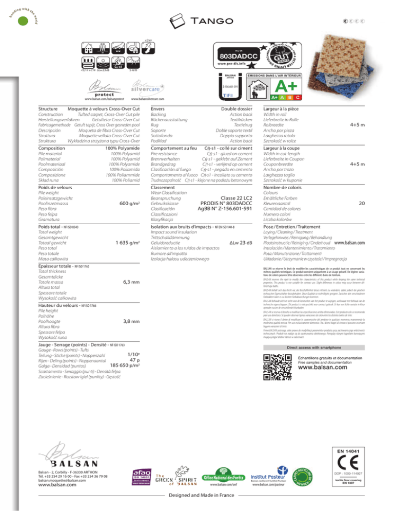 Tango ≤2 kV BlfL esTp <0,17 m2C°/W ΔLw 23 dB 803DADCC 5-6/8 BALSAN ÉMISSIONS DANS L’AIR INTÉRIEUR ARTHON Z-156.601-591 www.balsan.com/balsanprotect Structure Moquette à velours Cross-Over Cut Construction Tufted carpet, Cross-Over Cut pile Herstellungsverfahren Getufteter Cross-Over Cut Fabricagemethode Getuft tapijt, Cross Over gesneden pool Descripción Moqueta de fibra Cross-Over Cut Struttura Moquette velluto Cross-Over Cut Struktura Wykładzina strzyżona typu Cross-Over Envers Backing Rückenausstattung Rug Soporte Sottofondo Podkład Composition Pile material Polmaterial Poolmateriaal Composición Composizione Skład runa 100% Polyamide 100% Polyamid 100% Polyamid 100% Polyamide 100% Poliamida 100% Poliammide 100% Poliamid Poids de velours Pile weight Poleinsatzgewicht Poolinzetmassa Peso fibra Peso felpa Gramatura Poids total - NF ISO 8543 Total weight Gesamtgewicht Totaal gewicht Peso total Peso totale Masa całkowita 600 g/m2 1 635 g/m2 Epaisseur totale - NF ISO 1765 Total thickness Gesamtdicke Totale massa Altura total Spessore totale Wysokość całkowita 6,3 mm Hauteur du velours - NF ISO 1766 Pile height Polhöhe Poolhoogte Altura fibra Spessore felpa Wysokość runa 3,8 mm A+ A+ A B C www.balsansilvercare.com Double dossier Action back Textilrücken Textielrug Doble soporte textil Doppio supporto Action back Largeur à la pièce Width in roll Lieferbreite in Rolle Rolbreedte Ancho por pieza Larghezza rotolo Szerokość w rolce 4+5 m Comportement au feu Cfl-s1 - collé sur ciment Fire resistance Cfl-s1 - glued on cement Brennverhalten Cfl-s1 - geklebt auf Zement Brandgedrag Cfl-s1 - verlijmd op cement Clasificación al fuego Cfl-s1 - pegado en cemento Comportamento al fuoco Cfl-s1 - incollato su cemento Trudnozapalność Cfl-s1 - klejone na podłożu betonowym Classement Wear Classification Beanspruchung Classe 22 LC2 Gebruiksklasse PRODIS N° 803DADCC Clasificación AgBB N° Z-156.601-591 Classificazioni Klasyfikacja Largeur à la coupe Width in cut-length Lieferbreite in Coupon Couponbreedte Ancho por trozo Larghezza taglio Szerokość w kuponie 4+5 m Isolation aux bruits d’impacts - NF EN ISO 140-8 Impact sound insulation Trittschalldämmung Geluidsreductie ΔLw 23 dB Aislamiento a los ruidos de impactos Rumore all’impatto Izolacja hałasu uderzeniowego Pose / Entretien / Traitement Laying / Cleaning / Treatment Verlegehinweis / Reinigung / Behandlung Plaatsinstructie / Reiniging / Onderhoud www.balsan.com Instalación / Mantenimiento / Tratamiento Posa / Manutenzione / Trattamenti Układanie / Utrzymanie w czystości / Impregnacja Nombre de coloris Colours Erhältliche Farben Kleurenaantal Cantidad de colores Numero colori Liczba kolorów 20 BALSAN se réserve le droit de modifier les caractéristiques de ce produit tout en conservant les mêmes qualités techniques. Ce produit convient uniquement à un usage privatif. De légères variations de coloris peuvent être observées entre les différents bains de teinture. BALSAN reserves the right to modify the characteristics of this product while keeping the same technical properties. This product is not suitable for contract use. Slight differences in colour may occur between different dye baths. BALSAN behält sich das Recht vor, die Beschaffenheit dieses Artikels zu verändern, dabei jedoch die gleichen technischen Eigenschaften beizubehalten. Diese Qualität ist nicht Objekt geeignet. Zwischen den verschiedenen Farbbädern kann es zu leichten Farbabweichungen kommen. BALSAN behoudt zich het recht voor de kenmerken van het product te wijzigen, weliswaar met behoud van de technische eigenschappen. Dit product is niet geschikt voor contract gebruik. Er kan een lichte variatie in kleur optreden tussen de verschillende kleurbaden. BALSAN se reserva el derecho a modificar las especificaciones arriba referenciadas. Este producto solo se recomienda para uso doméstico. Se pueden observar ligeras variaciones de color entre los distintos baños de tinte. BALSAN si riseva il diritto di modificare le caratteristiche del prodotto in qualsiasi momento, mantenendo la medesima qualità tecnica. Per uso esclusivamente domestico. Tra i diversi bagni di tintura si possono osservare leggere variazioni di tinta. Firma BALSAN zastrzega sobie prawo do modyfikacji parametrów produktu przy zachowaniu jego właściwości technicznych. Produkt nie nadaje się do zastosowania obiektowego. Pomiędzy różnymi kąpielami barwiącymi mogą wystąpić drobne różnice w odcieniach. Jauge - Serrage (points) - Densité - NF ISO 1763 Gauge - Rows (points) - Tufts 1/10e Teilung - Stiche (points) - Noppenzahl 47 p Rijen - Deling (points) - Noppenaantal 185 650 p/m2 Galga - Densidad (puntos) Scartamento - Serraggio (punti) - Densità felpa Zacieśnienie - Rozstaw igiel (punkty) - Gęstość Direct access with smartphone Échantillons gratuits et documentation Free samples and documentation www.balsan.com EN 14041 Balsan - 2, Corbilly - F-36330 ARTHON Tél. +33 254 29 16 00 - Fax +33 254 36 79 08 [email protected] www.balsan.com DOP : 1009-114927 textile floor covering www.balsan.com/onf Designed and Made in France www.balsan.com/pasteur EN 1307 Tango Agit naturellement contre les bactéries et les acariens. Naturally fights bacteria and dust mites. Jade 230 4+5 m Nuage 910 4+5 m Dune 610 4+5 m Sable 320 4+5 m Corail 430 4+5 m Aqua 150 4+5 m Orage 940 4+5 m Cuir 630 4+5 m Beige 620 4+5 m Terra 470 4+5 m Azur 160 4+5 m Roc 950 4+5 m Bois 740 4+5 m Or 340 4+5 m Vermeil 570 4+5 m Marine 180 4+5 m Anthracite 990 4+5 m Chocolat 780 4+5 m Ambre 450 4+5 m Cardinal 580 4+5 m PAGES / SEITEN 58 - 59