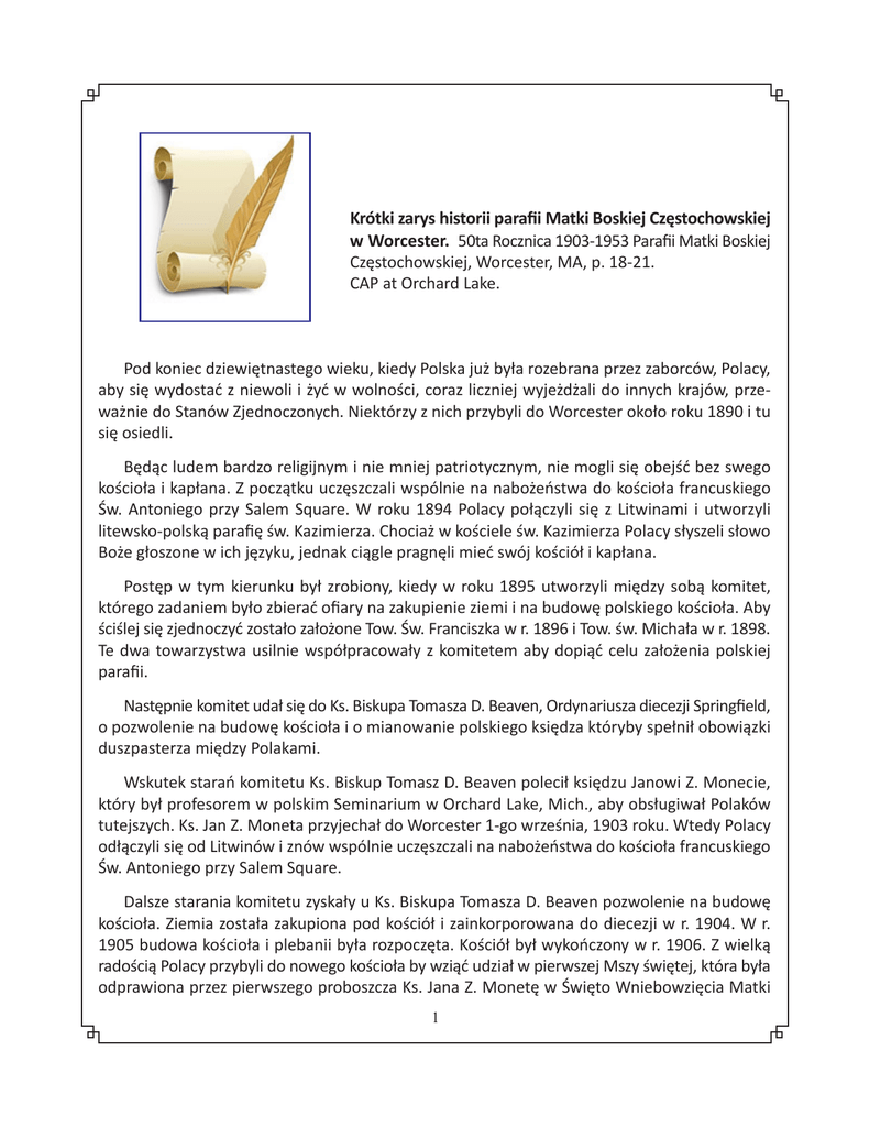 Krótki zarys historii parafii Matki Boskiej Częstochowskiej w Worcester. 50ta Rocznica 1903-1953 Parafii Matki Boskiej Częstochowskiej, Worcester, MA, p. 18-21. CAP at Orchard Lake. Pod koniec dziewiętnastego wieku, kiedy Polska już była rozebrana przez zaborców, Polacy, aby się wydostać z niewoli i żyć w wolności, coraz liczniej wyjeżdżali do innych krajów, przeważnie do Stanów Zjednoczonych. Niektórzy z nich przybyli do Worcester około roku 1890 i tu się osiedli. Będąc ludem bardzo religijnym i nie mniej patriotycznym, nie mogli się obejść bez swego kościoła i kapłana. Z początku uczęszczali wspólnie na nabożeństwa do kościoła francuskiego Św. Antoniego przy Salem Square. W roku 1894 Polacy połączyli się z Litwinami i utworzyli litewsko-polską parafię św. Kazimierza. Chociaż w kościele św. Kazimierza Polacy słyszeli słowo Boże głoszone w ich języku, jednak ciągle pragnęli mieć swój kościół i kapłana. Postęp w tym kierunku był zrobiony, kiedy w roku 1895 utworzyli między sobą komitet, którego zadaniem było zbierać ofiary na zakupienie ziemi i na budowę polskiego kościoła. Aby ściślej się zjednoczyć zostało założone Tow. Św. Franciszka w r. 1896 i Tow. św. Michała w r. 1898. Te dwa towarzystwa usilnie współpracowały z komitetem aby dopiąć celu założenia polskiej parafii. Następnie komitet udał się do Ks. Biskupa Tomasza D. Beaven, Ordynariusza diecezji Springfield, o pozwolenie na budowę kościoła i o mianowanie polskiego księdza któryby spełnił obowiązki duszpasterza między Polakami. Wskutek starań komitetu Ks. Biskup Tomasz D. Beaven polecił księdzu Janowi Z. Monecie, który był profesorem w polskim Seminarium w Orchard Lake, Mich., aby obsługiwał Polaków tutejszych. Ks. Jan Z. Moneta przyjechał do Worcester 1-go września, 1903 roku. Wtedy Polacy odłączyli się od Litwinów i znów wspólnie uczęszczali na nabożeństwa do kościoła francuskiego Św. Antoniego przy Salem Square. Dalsze starania komitetu zyskały u Ks. Biskupa Tomasza D. Beaven pozwolenie na budowę kościoła. Ziemia została zakupiona pod kościół i zainkorporowana do diecezji w r. 1904. W r. 1905 budowa kościoła i plebanii była rozpoczęta. Kościół był wykończony w r. 1906. Z wielką radością Polacy przybyli do nowego kościoła by wziąć udział w pierwszej Mszy świętej, która była odprawiona przez pierwszego proboszcza Ks. Jana Z. Monetę w Święto Wniebowzięcia Matki 1 Boskiej 15-go sierpnia, 1906 roku. Kościół został poświęcony 29-go listopada, 1906 roku przez Ks. Biskupa Tomasza D. Beaven. Ks. Jan Z. Moneta, pierwszy proboszcz parafii, pomimo wątłego zdrowia, służył Bogu i parafii nad siły swoje. Za jego staraniem założone były następujące towarzystwa: Tow. Różańca św. dla niewiast 14-go października, 1906 roku. Bractwo Dzieci Marii w r. 1907. Chór pod wezwaniem św. Cecylii już był założony w r. 1903. Występował na różnych programach między polonią, a gdy parafia została założona, został przyjęty, jako chór parafialny upiększając swoim śpiewem nabożeństwa w kościele. Założył tu także grupę 75 8 Związku N. P. Nie długo trwała energiczna praca Ks. Jana Z. Monety bo umarł m posterunku dusz¬pasterskim 15-go lipca, 1907 roku. Po nim objął parafię Ks. Piotr C. Reding. Pracował on poprzednio przy kościele Panny Marii w Washington, D. C., i w Annondale, Md., a od roku 1904 w Northampton, Mass. W tutejszej parafii pracował z całą energią. Zorganizował Bractwo Apostolstwa Modlitwy w r. 1910. Później to Bractwo przyjęło imię Tow. Najświętszego Serca Jezusa. Troszcząc się o zachowanie wiary i polskości w dzieciach, zabrał się energicznie do budowy szkoły parafialnej. Otrzymał ziemię pod szkołę w okolicy Crompton Parku od rodziny Crompton. Z powodu braku funduszów nie mógł jeszcze rozpocząć budowy szkoły. Starał się o ile mógł, aby ten cel osiągnąć. Nie doczekał się jednak tego, czego tak bardzo pragnął, bo umarł 5-go listopada 1911 roku. Następnym proboszczem został mianowany Ks. Józef Tomikowski. Nie długo pozostał w służbie tej parafii, bo 3-go maja 1913 roku był przeniesiony, jako proboszcz do parafii Niepokalanego Poczęcia Najśw. Marii Panny w Indian Orchard, Mass. Obecnie jest jeszcze proboszczem tejże parafii. Na miejsce Ks. Józefa Tomikowskiego został przysłany 3-go maja 1913 roku, Ks. Bolesław A. Bojanowski. Ks. Bojanowski przyjechał do Stanów Zjednoczonych z Polski w r. 1907. Został mianowany proboszczem parafii w Watervliet, NY. w r. 1908 gdzie pobudował nowy kościół. Stamtąd przyjechał do diecezji Springfield w której był naznaczony na proboszcza w parafii w Pittsfield, Mass. Stąd, po zaledwie kilku miesiącach duszpasterzowania, przysłany był do parafii M. Boskiej Częstochowskiej w Worcester, Mass. Młody i energiczny proboszcz zabrał się z całym zapałem do pracy. Paraf- janie dzielnie mu pomagali we wszystkich przedsięwzięciach, zwłaszcza przy budowie szkoły parafialnej, Audytorium, Sali Gimnastycznej i klasztoru dla Sióstr Nauczycielek. Sprzedał ziemię już otrzymaną pod szkołę przez Ks. Piotra C. Redinga i zakupił ziemię w lepszym położeniu przy Richland ulicy. Rozpoczął budowę szkoły 11-go maja, 1914 roku. Szkoła została oficjalnie otworzona 5-go września 1915 roku. Pierwsza graduacja odbyła się 16-go czerwca 1918 roku. Było 9 graduantów. Sprowadzono na nauczycielki Siostry Nazaretanki. Zawsze wesołe, gotowe i chętnie do poświęcenia się dla sprawy dobrej, podjęły się swej pracy kształcenia dziatwy w szkole parafialnej z wielkim poświęceniem i zaparciem się siebie. Cześć Wam i dzięki Siostry Nauczycielki w szkole naszej! Dorosła już młodzież miłą i wdzięczną zachowuje o was pamięć. 2 Liczba dzieci w parafii z każdym rokiem licznie wzrastała. Dlatego 19-go maja 1919 r. więcej ziemi zakupiono na powi
