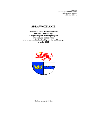 Załącznik do uchwały nr XXIII/173/2013 Rady Powiatu w Gryfinie z dnia 25.04.2013 r. SPRAWOZDANIE z realizacji Programu współpracy Powiatu Gryfińskiego z organizacjami pozarządowymi oraz innymi podmiotami prowadzącymi działalność pożytku publicznego w roku 2012 Gryfino, kwiecień 2013 r. I. WPROWADZENIE Organizacje pozarządowe są ważnym partnerem Powiatu Gryfińskiego w realizacji jego zadań statutowych. Samorząd powiatu współpracuje z sektorem pozarządowym wspierając realizację zadań publicznych z przekonaniem, że organizacje pozarządowe znając potrzeby lokalne mogą realizować je skuteczniej i efektywniej. Oprócz wspierania realizacji priorytetowych zadań publicznych Samorząd powiatu podejmuje również działania na rzecz wspierania rozwoju społeczeństwa obywatelskiego oraz wzmacniania dialogu międzysektorowego w powiecie gryfińskim. Wszelkie działania podejmowane w zakresie współpracy z organizacjami pozarządowymi opisywane są corocznie w Rocznym programie współpracy samorządu powiatu gryfińskiego z organizacjami pozarządowymi. Organizacje pozarządowe zgodnie z zasadą partnerstwa biorą udział we współtworzeniu rocznego programu współpracy, uczestnicząc w lepszym identyfikowaniu i definiowaniu problemów społecznych oraz zgłaszając swoje propozycje. Cel nadrzędny współpracy organów Samorządu powiatu z organizacjami pozarządowymi i innymi podmiotami prowadzącymi działalność pożytku publicznego, określony w rocznym programie współpracy na rok 2012, to lepsze zaspokajanie potrzeb społecznych oraz podnoszenie poziomu życia mieszkańców powiatu. Dla realizacji celu nadrzędnego wyznaczone zostały cele szczegółowe, a wśród nich: 1) poprawa jakości poprzez pełniejsze zaspokajanie potrzeb mieszkańców powiatu gryfińskiego, 2) racjonalne wykorzystanie publicznych środków finansowych, 3) otwarcie na innowacyjność i konkurencyjność w wykonywaniu zadań publicznych, 4) integracja organizacji lokalnych obejmujących zakresem działania sferę zadań publicznych, 5) wzmocnienie potencjału organizacji oraz rozwój wolontariatu, 6) promowanie i wzmacnianie postaw obywatelskich. Zadania statutowe wykonywane przez organizacje obejmowały wiele dziedzin życia powiatu, ze szczególnym uwzględnieniem sfer, w których występują największe potrzeby społeczności lokalnych tj. pomoc społeczna, przeciwdziałanie wykluczeniu społecznemu, aktywność fizyczna dzieci i młodzieży, kultura. Szczegółowy zakres współpracy Samorządu Powiatu Gryfińskiego z organizacjami pozarządowymi i innymi podmiotami prowadzącymi działalność pożytku publicznego został opisany w dalszej części sprawozdania. II. REALIZACJA PROGRAMU WSPÓŁPRACY Współpraca powiatu z organizacjami dotyczyła realizacji zadań publicznych określonych w art. 4 ustawy o działalności pożytku publicznego i o wolontariacie w zakresie odpowiadającym zadaniom powiatu, głównie poprzez udzielanie dotacji na dofinansowanie realizacji zadań w ramach otwartego konkursu ofert, na wniosek organizacji (bez konkursu) oraz w trybie ustawy o finansach publicznych. Z organizacjami współpracowały głownie: 1) wydziały merytoryczne Starostwa Powiatowego: − Wydział Edukacji, Kultury, Sportu i Turystyki – monitorowanie realizacji programu współpracy, bieżąca współpraca z organizacjami przy realizacji zadań z zakresu promocji, kultury i sportu, zdrowia oraz kultury, sztuki i dziedzictwa narodowego, obsługa otwartego konkursu ofert na wsparcie realizacji zadań publicznych Powiatu w powyższym zakresie, administrowanie internetowej zakładki dla organizacji pozarządowych; 2 − Wydział Ochrony Środowiska, Rolnictwa i Leśnictwa. 2) Powiatowe Centrum Pomocy Rodzinie – zlecanie organizacjom realizacji zadań dotyczących rehabilitacji społecznej ze środków Państwowego Funduszu Rehabilitacji Osób Niepełnosprawnych. 3) Powiatowa Społeczna Rada ds. Osób Niepełnosprawnych – inspirowanie przedsięwzięć zmierzających do integracji zawodowej i społecznej osób niepełnosprawnych oraz realizacji praw osób niepełnosprawnych, opiniowanie projektów powiatowych programów działań na rzecz osób niepełnosprawnych, ocena realizacji programów, opiniowanie projektów uchwał i programów przyjmowanych przez Radę Powiatu pod kątem ich skutków dla osób niepełnosprawnych. Współpraca o charakterze finansowym Przeprowadzono dwa otwarte konkursy ofert zgodnie z przepisami ustawy z dnia 24 kwietnia 2003 r. o działalności pożytku publicznego i o wolontariacie, na które przeznaczono łączną kwotę 149 850,00 zł, w tym ze środków PFRON 85 000 zł. W wyniku przeprowadzonych otwartych konkursów ofert, organizacjom zlecono do realizacji ogółem 25 zadań. Zestawienie danych liczbowych: Lp. 1. 2. 3. 4. 5. Konkursy ofert na wsparcie realizacji zadań w 2012 r. Środki finansowe przeznaczone na realizację zadań Liczba złożonych ofert Łączna wysokość wnioskowanych dotacji Liczba zawartych umów na realizację zadań Wartość zawartych umów Źródło finansowania Budżet powiatu 70 450,00 41 237 812,50 23 64 850,00 Razem Środki PFRON 85 000,00 2 85 000,00 2 85 000,00 155 450,00 43 322 812,50 25 149 850,00 1) Otwarty konkurs ofert na wsparcie realizacji zadań publicznych Powiatu Gryfińskiego w 2012 roku w zakresie: − kultury, sztuki, ochrony dóbr kultury i dziedzictwa narodowego; − kultury fizycznej i sportu, − turystyki, − ochrony zdrowia. Zarząd Powiatu w dniu 29.12.2011 r. ogłosił otwarty konkurs ofert na realizację zadań publicznych w 2012 roku (uchwała nr 181/2011). Dotacje przyznano na realizację 28 zadań (uchwała nr 220/2012 z dnia 1.03.2012 r.). Cztery organizacje zrezygnowały z przyznanej dotacji i nie podpisały umów: Lp. Nazwa organizacji Zadanie nr 2 – Turystyka 1. Stowarzyszenie na rzecz Rozwoju Turystyki na Ziemi Bańskiej „BIAŁOSTROŃ” Zadanie nr 3 – Kultura fizyczna, sport 2.