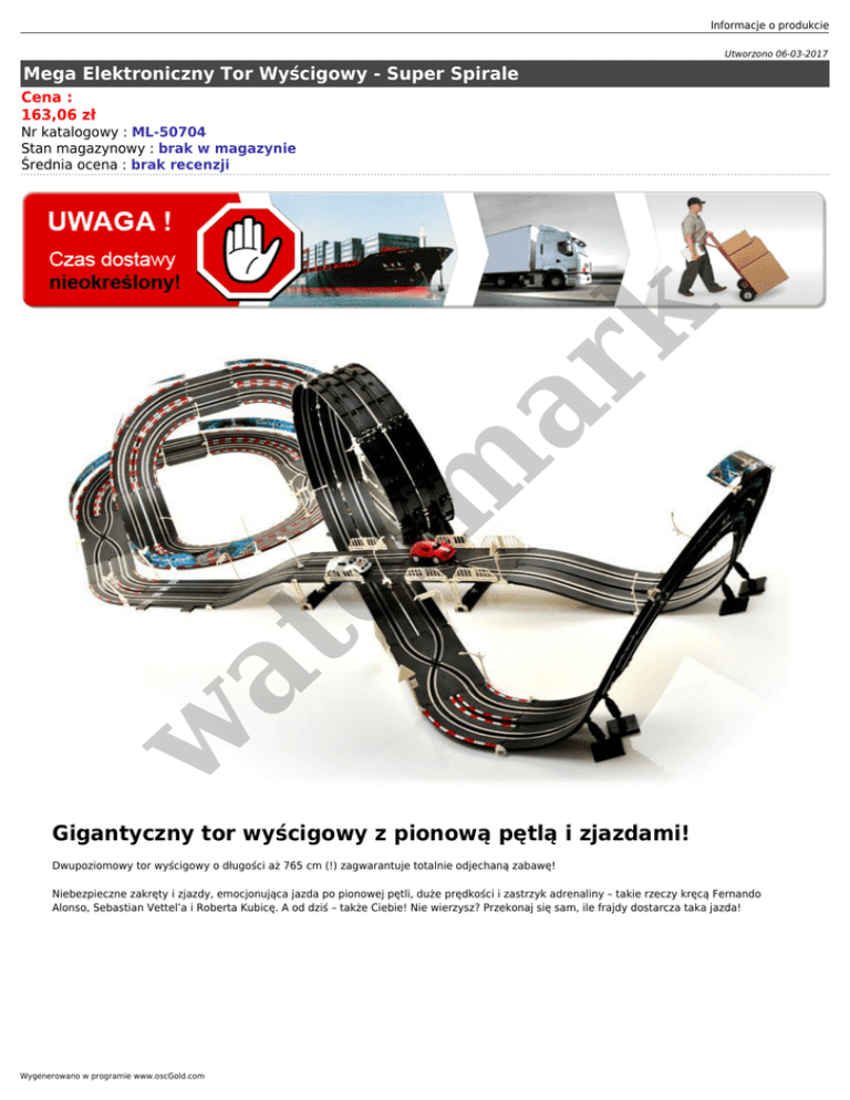 Informacje o produkcie Utworzono 06-03-2017 Mega Elektroniczny Tor Wyścigowy - Super Spirale Cena : 163,06 zł w at er m ar k Nr katalogowy : ML-50704 Stan magazynowy : brak w magazynie Średnia ocena : brak recenzji Gigantyczny tor wyścigowy z pionową pętlą i zjazdami! Dwupoziomowy tor wyścigowy o długości aż 765 cm (!) zagwarantuje totalnie odjechaną zabawę! Niebezpieczne zakręty i zjazdy, emocjonująca jazda po pionowej pętli, duże prędkości i zastrzyk adrenaliny – takie rzeczy kręcą Fernando Alonso, Sebastian Vettel’a i Roberta Kubicę. A od dziś – także Ciebie! Nie wierzysz? Przekonaj się sam, ile frajdy dostarcza taka jazda! Wygenerowano w programie www.oscGold.com er m ar k Gaz do dechy! 4 kolorowe samochody wyścigowe, które znajdziesz w zestawie, są wręcz stworzone do szybkiej jazdy. Ustawcie tor i samochodziki i… gaz do dechy! w at Kto szybciej pokona określoną ilość okrążeń i nie wypadnie z toru – ten wygrywa. (Jednocześnie można ścigać się tylko dwoma autkami). Przenieś się w ekscytujący świat wyścigów samochodowych! Oto prawdziwa gratka dla amatorów szybkiej jazdy. Daj się ponieść sportowej rywalizacji i baw się w najlepsze! Na tym torze włos Ci z głowy nie spadnie :) er m ar k Informacje o produkcie Doskonały prezent dla każdego! Kontrola prędkości at Wprawny kierowca wie kiedy należy przyspieszyć a kiedy zwolnić aby wyścig nie zakończył się wypadnięciem z toru :-) Dzięki specjalnemu joystickowi możesz regulować prędkość swojego autka. Maksymalne osiągi to aż 20km/h! Jakość i bezpieczeństwo Tor wyścigowy to zabawka przeznaczona dla dzieci powyżej 6 lat oraz młodzieży i dorosłych. w Zabawkę wykonano z wysokiej jakości, atestowanych i estetycznych materiałów. Zestaw nie posiada żadnych ostrych krawędzi ani elementów, którymi dziecko mogłoby się skaleczyć. Podczas montażu toru zalecana jest pomoc dorosłych. Pełne bezpieczeństwo użytkowania potwierdza Europejski Certyfikat bezpieczeństwa CE. Wygenerowano w programie www.oscGold.com er m ar k Zawartość zestawu: w at • tor wyścigowy • akcesoria do toru i samochodzików (transformator, wsporniki, podkłady, zatrzaski, szyny przyłączeniowe) • 2 samochody wyścigowe - biały i czerwony • 2 pojazdy typu "Formuła 1" - srebrny i czerwony • 2 joysticki • oryginalne opakowanie Wymiary: Opakowania: 70,5 x 47,5 x 8 cm Autko wyścigowe: 8 x 4 cm Formuła 1: 8,5 x 4,5 cm Długość toru: 765 cm w at er m ar k Informacje o produkcie Wygenerowano w programie www.oscGold.com