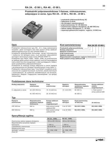 33 RA 24.. -D 06 L, RA 40.. -D 08 L Przekaniki pó³przewodnikowe 1-fazowe, niskoszumowe, za³¹czaj¹ce w zerze, typu RA 24.. -D 06 L, RA 40.. -D 08 L przekanik pó³przewodnikowy AC za³¹czanie w zerze dla obci¹¿eñ rezystancyjnych pr¹d znamionowy 10 i 25 AACrms znamionowe napiêcie obci¹¿enia: do 400 VACrms zakres napiêæ steruj¹cych: 3 - 32 VDC separacja galwaniczna wejcie - wyjcie: 4 kVACrms Opis Kod zamówieniowy Przekaniki niskoszumowe typu RA...-D..L maj¹ zastosowanie wszêdzie, gdzie wymagany jest niski poziom emisji zak³óceñ elektromagnetycznych do sieci (PN-EN 50081-1). Urz¹dzenia gospodarstwa domowego, sprzêt informatyczny i medyczny od jakiego czasu musi sprostaæ odpowiednim wymogom narzucanym przez normy (PN-EN 50081-1). Przekaniki typu RA24..-D06L i RA40..-D08L s¹ przeznaczone do aplikacji gdzie poziom emisji zak³óceñ musi byæ bezwzglêdnie niski a klient nie chce rezygnowaæ z zalet wynikaj¹cych z w³aciwoci przekaników pó³przewodnikowych. Przekaniki te realizuj¹ funkcjê za³¹czania w zerze napiêcia i s¹ przeznaczone do obci¹¿eñ rezystancyjnych (cosϕ bliski 1). Przekaniki niskoszumowe (typu "Low-Noise") s¹ g³ównie przeznaczone do urz¹dzeñ biurowych, kuchenek, pieców domowych i przemys³owych, do systemów owietleniowych sal kinowych, teatralnych, sklepów i magazynów, kserokopiarek i do sprzêtu medycznego. Przekanik pó³przewodnikowy Rodzaj za³¹czania Napiêcie znamionowe Pr¹d znamionowy Napiêcie steruj¹ce Niepowtarzalne szczytowe napiêcie blokowania Niski poziom emisji zak³óceñ EM RA 24 25 -D 06 L Podstawowe dane techniczne Rodzaj za³¹czania Napiêcie znamionowe Pr¹d znamionowy Napiêcia steruj¹ce Niepowtarzalne szczytowe napiêcie blokowania Emisja zak³óceñ elektromagnetycznych A: za³¹czanie w zerze 24: 230 VACrms 10: 10 AACrms -D: 3-32 VDC 06: 650 Vp L: Niski poziom emisji zak³óceñ EM 40: 400 VACrms 25: 25 AACrms Napiêcie znamionowe Niepowtarzalne szczytowe napiêcie blokowania Emisja zak³óceñ elektromagnetycznych Napiêcia steruj¹ce Pr¹d znamionowy 10 AACrms 25 AACrms 230 VACrms 650 Vp 3 do 32 VDC RA 2410 -D06L RA 2425 -D06L 400 VACrms 850 Vp Niski poziom emisji zak³óceñ EM Niski poziom emisji zak³óceñ EM 3 do 32 VDC RA 4010 -D08L RA 4025 -D08L 08: 850 Vp Typ Specyfikacja ogólna Znamionowy zakres napiêcia obci¹¿enia Niepowtarzalne szczytowe napiêcie blokowania Czêstotliwoæ znamionowa Wspó³czynnik mocy Aprobaty / uznania Znak CE RA 24...-D06L RA 40...-D08L 180 do 265 VACrms 340 do 530 VACrms ³ 650 Vp 45 do 65 Hz 1 UL, CSA, VDE Tak ³ 850 Vp 45 do 65 Hz 1 UL, CSA, VDE Tak 34 RA 24.. -D 06 L, RA 40.. -D 08 L Wejcie steruj¹ce Zakres napiêcia steruj¹cego Gwarantowane napiêcie za³¹czenia Gwarantowane napiêcie wy³¹czenia Napiêcie wsteczne Impedancja wejciowa Czas odpowiedzi Izolacja wejcie - wyjcie 3 do 32 VDC £3V ³1V £ 32 VDC 1 kW £ 1/2 cyklu Izolacja galwaniczna wejcie - wyjcie ³ 4000 VACrms Izolacja galwaniczna wyjcie - obudowa ³ 4000 VACrms Napiêcie odniesienia Izolacja zgodna z wymogami VDE 0700 500 VACrms Wyjcie mocy Znamionowy pr¹d obci¹¿enia AC1 Minimalny pr¹d obci¹¿enia AC1 Maks. pr¹d przeci¹¿eniowy przy t=1s Maks. niepowtarzalny pr¹d chwilowy t=20ms Pr¹d up³ywu I2t dla bezpiecznika t=1-10ms Spadek napiêcia na z³¹czu przy pr¹dzie znamionowym Maks. narost napiêcia blokowania dV/dt Pr¹d synchronizacji RA ..10 -D 0. L RA .. 25 -D 0. L 10 Arms 1 Arms £ 30 Ap 90 Ap £ 1 mArms £ 120 A2s 25 Arms 2 Arms £ 50 Ap 200 Ap £ 1 mArms £ 200 A2s £ 1,2 Vrms ³ 250 V/µs £ 20 mArms £ 1,2 Vrms ³ 250 V/µs £ 20 mArms Warunki termiczne Temperatura pracy Temperatura magazynowania Maks. temperatura z³¹cza Rth z³¹cze - obudowa RA ..10 -D 0. L RA .. 25 -D 0. L -20°C do +70°C -40°C do +100°C £ 125°C £ 2,5 K/W -20°C do +70°C -40°C do +100°C £ 125°C £ 1,8 K/W Schemat pogl¹dowy Wymiary 45.5 -4 30 WYJŒCIE MOCY 24.5 2 +3 WEJŒCIE STERUJ¥CE 1 S 5.3 Schemat funkcjonalny Zastosowaæ pastê przewodz¹c¹ termicznie 47.5 58.2 2 x M5 2 x M3 2 Wyjœcie mocy 1 Wyjœcie mocy L+ 3 Wejœcie steruj¹ce L- 4 Napiêcie synchronizuj¹ce S *** = ± 0.4 ** = ± 0.5 mm 13 35 RA 24.. -D 06 L, RA 40.. -D 08 L Obudowa Waga Materia³ obudowy P³ytka podstawy Wype³nienie Przekanik ruba Moment obrotowy Zaciski wejcia steruj¹cego ruba Moment obrotowy Zaciski wyjciowe mocy ruba Moment obrotowy Aplikacje oko³o 110 g Noryl GFN1, czarny Aluminium Silikon poliuretanowy M5 £ 1,5 Nm M3 x 6 £ 0,5 Nm Bardzo niski poziom zak³óceñ przewodzonych tych przekaników jest uzyskiwany dziêki dok³adnej synchronizacji momentu zadzia³ania triaka z momentem przejcia przez wartoæ zero napiêcia zasilania. Dlatego przekaniki te posiadaj¹ dodatkowy zacisk pod³¹czany do linii zasilania. Mo¿e on byæ do³¹czony do przewodu neutralnego lub do przewodu fazowego w zale¿noci w jaki sposób za³¹czane jest obci¹¿enie. Przekaniki te s³u¿¹ do sterowania obci¹¿eniami rezystancyjnymi, gdzie cosj bliski jest 1. Podczas wysterowania przekanika, dla RA..10-D 0. L minimalny pr¹d obci¹¿enia wynosi 1A, natomiast dla RA..25-D 0. L - 2A. M5 x 6 £ 2,4 Nm Okrelenie rezystancji termicznej Akcesoria (pr¹d obci¹¿enia w funkcji temperatury otoczenia) Radiator Zaczep na szynê Bezpieczniki Warystory Dodatkowych informacji proszê szukaæ w czêci "AKCESORIA". RA ..10 -D 0. L Dobór radiatora Porównaj wartoæ rezystancji termicznej wyznaczonej na podstawie pr¹du i temperatury pracy przekanika, znalezion¹ w tabeli i dobierz radiator o rezystancji termicznej ni¿szej, najbli¿szej tej wartoci. Radiator RA ..25 -D 0. L Radiator nie wymagany RHS 100 RHS 45A RHS 45B RHS 90 RHS 45A plus wentylator RHS 45B plus wentylator RHS 112 RHS 301 RHS 90 plus wentylator RHS 112 plus wentylator RHS 301 plus wentylator Skontaktuj siê ze swoim dystrybutorem Rezystancja termiczna Dla mocy rozpraszanej --3,00 K/W 2,70 K/W 2,00 K/W 1,35 K/W 1,35 K/W 1,20 K/W 1,10 K/W 0,80 K/W 0,45 K/W 0,40 K/W 0,25 K/W --> 25 