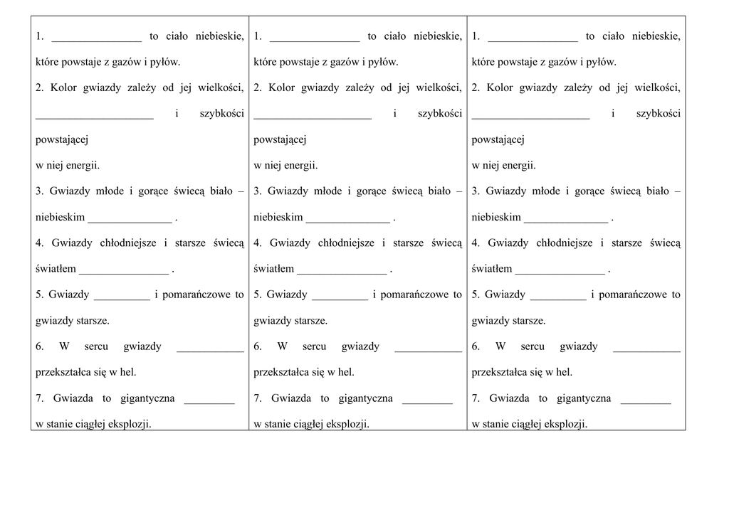 1. ________________ to ciało niebieskie, 1. ________________ to ciało niebieskie, 1. ________________ to ciało niebieskie, które powstaje z gazów i pyłów. które powstaje z gazów i pyłów. które powstaje z gazów i pyłów. 2. Kolor gwiazdy zależy od jej wielkości, 2. Kolor gwiazdy zależy od jej wielkości, 2. Kolor gwiazdy zależy od jej wielkości, _____________________ i szybkości _____________________ i szybkości _____________________ powstającej powstającej powstającej w niej energii. w niej energii. w niej energii. i szybkości 3. Gwiazdy młode i gorące świecą biało – 3. Gwiazdy młode i gorące świecą biało – 3. Gwiazdy młode i gorące świecą biało – niebieskim _______________ . niebieskim _______________ . niebieskim _______________ . 4. Gwiazdy chłodniejsze i starsze świecą 4. Gwiazdy chłodniejsze i starsze świecą 4. Gwiazdy chłodniejsze i starsze świecą światłem ________________ . światłem ________________ . światłem ________________ . 5. Gwiazdy __________ i pomarańczowe to 5. Gwiazdy __________ i pomarańczowe to 5. Gwiazdy __________ i pomarańczowe to gwiazdy starsze. 6. W sercu gwiazdy starsze. gwiazdy ____________ 6. W sercu gwiazdy starsze. gwiazdy ____________ 6. W sercu gwiazdy ____________ przekształca się w hel. przekształca się w hel. przekształca się w hel. 7. Gwiazda to gigantyczna _________ 7. Gwiazda to gigantyczna _________ 7. Gwiazda to gigantyczna _________ w stanie ciągłej eksplozji. w stanie ciągłej eksplozji. w stanie ciągłej eksplozji.