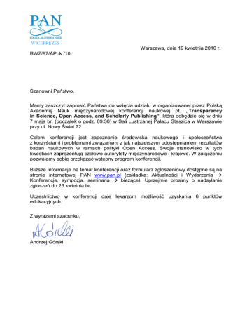 WICEPREZES Warszawa, dnia 19 kwietnia 2010 r. BWZ/97/APok /10 Szanowni Państwo, Mamy zaszczyt zaprosić Państwa do wzięcia udziału w organizowanej przez Polską Akademię Nauk międzynarodowej konferencji naukowej pt. „Transparency in Science, Open Access, and Scholarly Publishing”, która odbędzie się w dniu 7 maja br. (początek o godz. 09:30) w Sali Lustrzanej Pałacu Staszica w Warszawie przy ul. Nowy Świat 72. Celem konferencji jest zapoznanie środowiska naukowego i społeczeństwa z korzyściami i problemami związanymi z jak najszerszym udostępnianiem rezultatów badań naukowych w ramach polityki Open Access. Swoje stanowisko w tych kwestiach zaprezentują czołowe autorytety międzynarodowe i krajowe. W załączeniu pozwalamy sobie przekazać wstępny program konferencji. BliŜsze informacje na temat konferencji oraz formularz zgłoszeniowy dostępne są na stronie internetowej PAN www.pan.pl (zakładka: Aktualności i Wydarzenia Konferencje, sympozja, seminaria bieŜące). Uprzejmie prosimy o nadsyłanie zgłoszeń do 26 kwietnia br. Uczestnictwo w konferencji daje lekarzom moŜliwość uzyskania 6 punktów edukacyjnych. Z wyrazami szacunku, Andrzej Górski International conference Transparency in Science, Open Access, and Scholarly Publishing Polish Academy of Sciences 7 May 2010 Warsaw 09:30 - 09:50 Welcome (Prof. Andrzej Górski, Vice-President of the Polish Academy of Sciences) 09:50 - 11:50 Session I Open Access: key to transparency in science (Dr. Virginia Barbour, Public Library of Science, Chief Editor, PLoS Medicine, UK) The French action in Open Access (Prof. Jean-François Bach, Académie des sciences; Université René Descartes, Paris, France) Open Access to Address Research and Academia in Poland (prof. Mieczysław Muraszkiewicz, Politechnika Warszawska, Uniwersytet Warszawski, Poland) Open Access and Evidence-Based Medicine: A Chinese Perspective (Dr. Yao-long Chen, Evidence-Based Medicine Center of Lanzhou University, Lanzhou City, China) 11:50 – 12.10 Discussion 12.10 - 13:40 Lunch 13.40 - 15:40 Session II A pathway towards Open Science in Poland (Prof. Marek Niezgódka, Interdisciplinary Centre for Mathematical and Computational Modelling, University of Warsaw, Poland) Clinical Trials, Ethics, and Information Technologies: Emerging Capabilities for Autonomy, Risk Assessment, and Reporting (Dr. Jonathan Kimmelman, McGill University, Montreal, Canada) Humanities Monograph Series of the Foundation for Polish Science (Prof. Włodzimierz Bolecki, Foundation for Polish Science, Poland) 15.40 - 17:00 Panel discussion