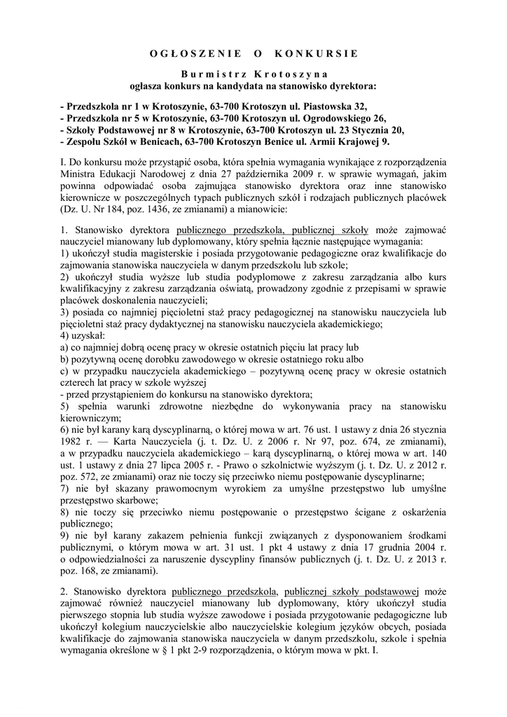 OGŁOSZENIE O KONKURSIE Burmistrz Krotoszyna ogłasza konkurs na kandydata na stanowisko dyrektora: - Przedszkola nr 1 w Krotoszynie, 63-700 Krotoszyn ul. Piastowska 32, - Przedszkola nr 5 w Krotoszynie, 63-700 Krotoszyn ul. Ogrodowskiego 26, - Szkoły Podstawowej nr 8 w Krotoszynie, 63-700 Krotoszyn ul. 23 Stycznia 20, - Zespołu Szkół w Benicach, 63-700 Krotoszyn Benice ul. Armii Krajowej 9. I. Do konkursu może przystąpić osoba, która spełnia wymagania wynikające z rozporządzenia Ministra Edukacji Narodowej z dnia 27 października 2009 r. w sprawie wymagań, jakim powinna odpowiadać osoba zajmująca stanowisko dyrektora oraz inne stanowisko kierownicze w poszczególnych typach publicznych szkół i rodzajach publicznych placówek (Dz. U. Nr 184, poz. 1436, ze zmianami) a mianowicie: 1. Stanowisko dyrektora publicznego przedszkola, publicznej szkoły może zajmować nauczyciel mianowany lub dyplomowany, który spełnia łącznie następujące wymagania: 1) ukończył studia magisterskie i posiada przygotowanie pedagogiczne oraz kwalifikacje do zajmowania stanowiska nauczyciela w danym przedszkolu lub szkole; 2) ukończył studia wyższe lub studia podyplomowe z zakresu zarządzania albo kurs kwalifikacyjny z zakresu zarządzania oświatą, prowadzony zgodnie z przepisami w sprawie placówek doskonalenia nauczycieli; 3) posiada co najmniej pięcioletni staż pracy pedagogicznej na stanowisku nauczyciela lub pięcioletni staż pracy dydaktycznej na stanowisku nauczyciela akademickiego; 4) uzyskał: a) co najmniej dobrą ocenę pracy w okresie ostatnich pięciu lat pracy lub b) pozytywną ocenę dorobku zawodowego w okresie ostatniego roku albo c) w przypadku nauczyciela akademickiego – pozytywną ocenę pracy w okresie ostatnich czterech lat pracy w szkole wyższej - przed przystąpieniem do konkursu na stanowisko dyrektora; 5) spełnia warunki zdrowotne niezbędne do wykonywania pracy na stanowisku kierowniczym; 6) nie był karany karą dyscyplinarną, o której mowa w art. 76 ust. 1 ustawy z dnia 26 stycznia 1982 r. — Karta Nauczyciela (j. t. Dz. U. z 2006 r. Nr 97, poz. 674, ze zmianami), a w przypadku nauczyciela akademickiego – karą dyscyplinarną, o której mowa w art. 140 ust. 1 ustawy z dnia 27 lipca 2005 r. - Prawo o szkolnictwie wyższym (j. t. Dz. U. z 2012 r. poz. 572, ze zmianami) oraz nie toczy się przeciwko niemu postępowanie dyscyplinarne; 7) nie był skazany prawomocnym wyrokiem za umyślne przestępstwo lub umyślne przestępstwo skarbowe; 8) nie toczy się przeciwko niemu postępowanie o przestępstwo ścigane z oskarżenia publicznego; 9) nie był karany zakazem pełnienia funkcji związanych z dysponowaniem środkami publicznymi, o którym mowa w art. 31 ust. 1 pkt 4 ustawy z dnia 17 grudnia 2004 r. o odpowiedzialności za naruszenie dyscypliny finansów publicznych (j. t. Dz. U. z 2013 r. poz. 168, ze zmianami). 2. Stanowisko dyrektora publicznego przedszkola, publicznej szkoły podstawowej może zajmować również nauczyciel mianowany lub dyplomowany, który ukończył studia pierwszego stopnia lub studia wyższe zawodowe i posiada przygotowanie pedagogiczne lub ukończył kolegium nauczycielskie albo nauczycielskie kolegium języków obcych, posiada kwalifikacje do zajmowania stanowiska nauczyciela w danym przedszkolu, szkole i spełnia wymagania określone w § 1 pkt 2-9 rozporządzenia, o którym mowa w pkt. I. 3. Stanowisko dyrektora zespołu publicznych szkół może zajmować nauczyciel mianowany lub dyplomowany, który posiada kwalifikacje do zajmowania stanowiska nauczyciela w szkole wchodzącej w skład zespołu, w której wymagania dotyczące kwalifikacji nauczycieli są najwyższe, oraz spełnia wymagania określone w § 1 pkt 2-9 rozporządzenia, o którym mowa w pkt. I. 4. Stanowisko dyrektora publicznego przedszkola, publicznej szkoły oraz zespołu publicznych szkół może zajmować osoba niebędąca nauczycielem, która spełnia łącznie następujące wymagania: 1) posiada obywatelstwo polskie, z tym że wymóg ten nie dotyczy obywateli państw członkowskich Unii Europejskiej, państw członkowskich Europejskiego Porozumienia o Wolnym Handlu (EFTA) — stron umowy o Europejskim Obszarze Gospodarczym oraz Konfederacji Szwajcarskiej; 2) ukończyła studia magisterskie; 3) posiada co najmniej pięcioletni staż pracy, w tym co najmniej dwuletni staż pracy na stanowisku kierowniczym; 4) ma pełną zdolność do czynności prawnych i korzysta z praw publicznych; 5) nie toczy się przeciwko niej postępowanie o przestępstwo ścigane z oskarżenia publicznego lub postępowanie dyscyplinarne; 6) spełnia wymagania określone w § 1 pkt 2, 5, 7 i 9 rozporządzenia, o którym mowa w pkt. I. 5. Stanowisko dyrektora w publicznym przedszkolu, publicznej szkole oraz zespole publicznych szkół może zajmować również nauczyciel mianowany lub dyplomowany, zatrudniony na stanowisku wymagającym kwalifikacji pedagogicznych w urzędzie organu administracji rządowej, kuratorium oświaty, Centrum Edukacji Artystycznej, Centralnej Komisji Egzaminacyjnej i okręgowych komisjach egzaminacyjnych, oraz nauczyciel mianowany lub dyplomowany urlopowany lub zwolniony z obowiązku świadczenia pracy na podstawie przepisów ustawy z dnia 23 maja 1991 r. o związkach zawodowych (j. t. Dz. U. z 2001 r. Nr 79, poz. 854, ze zmianami), spełniający wymagania określone w rozporządzeniu, z wyjątkiem wymogu posiadania co najmniej dobrej oceny pracy albo pozytywnej oceny dorobku zawodowego. II. Oferty osób przystępujących do konkursu, zgodnie z rozporządzeniem Ministra Edukacji Narodowej z dnia 8 kwietnia 2010 r. w sprawie regulaminu konkursu na stanowisko dyrektora publicznej szkoły lub publicznej placówki oraz trybu pracy komisji konkursowej (Dz. U. Nr 60, poz. 373, ze zmianami), powinny zawierać: - uzasadnienie przystąpienia do konkursu oraz koncepcję funkcjonowania i rozwoju publicznego przedszkola lub publicznej szkoły; - poświadczoną przez 