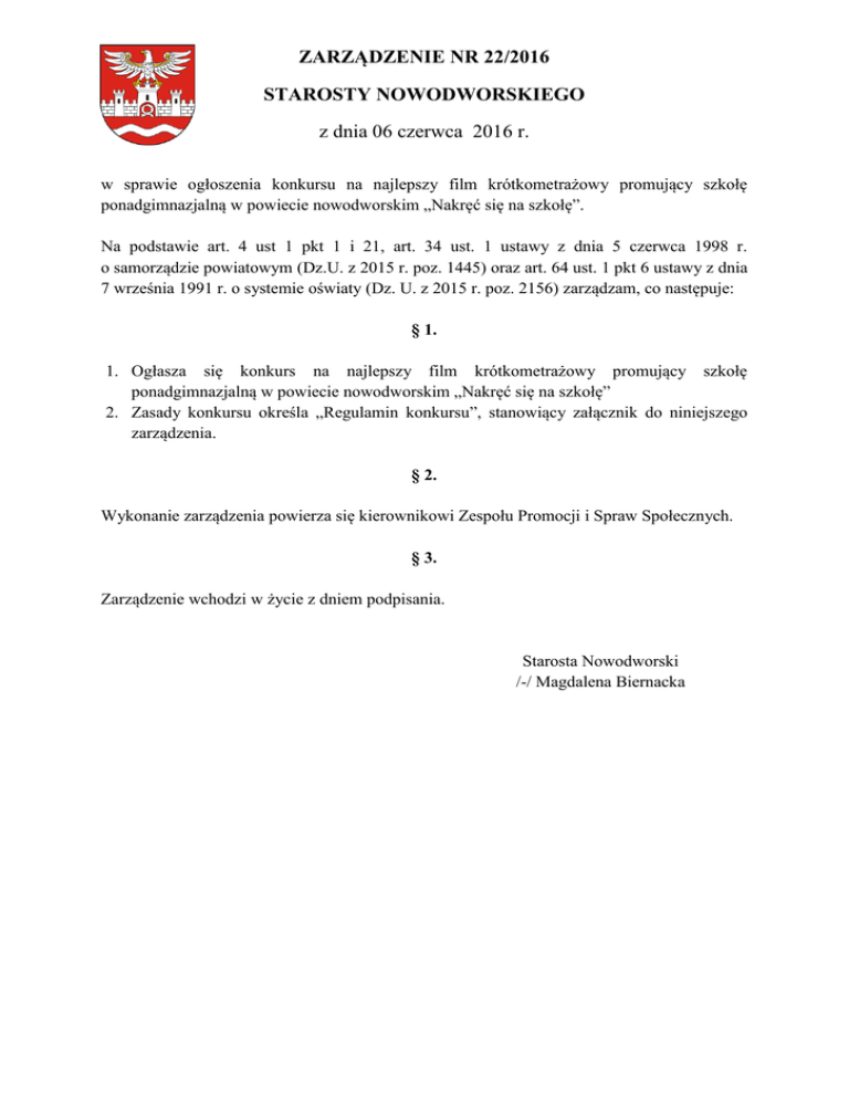 ZARZĄDZENIE NR 22/2016 STAROSTY NOWODWORSKIEGO z