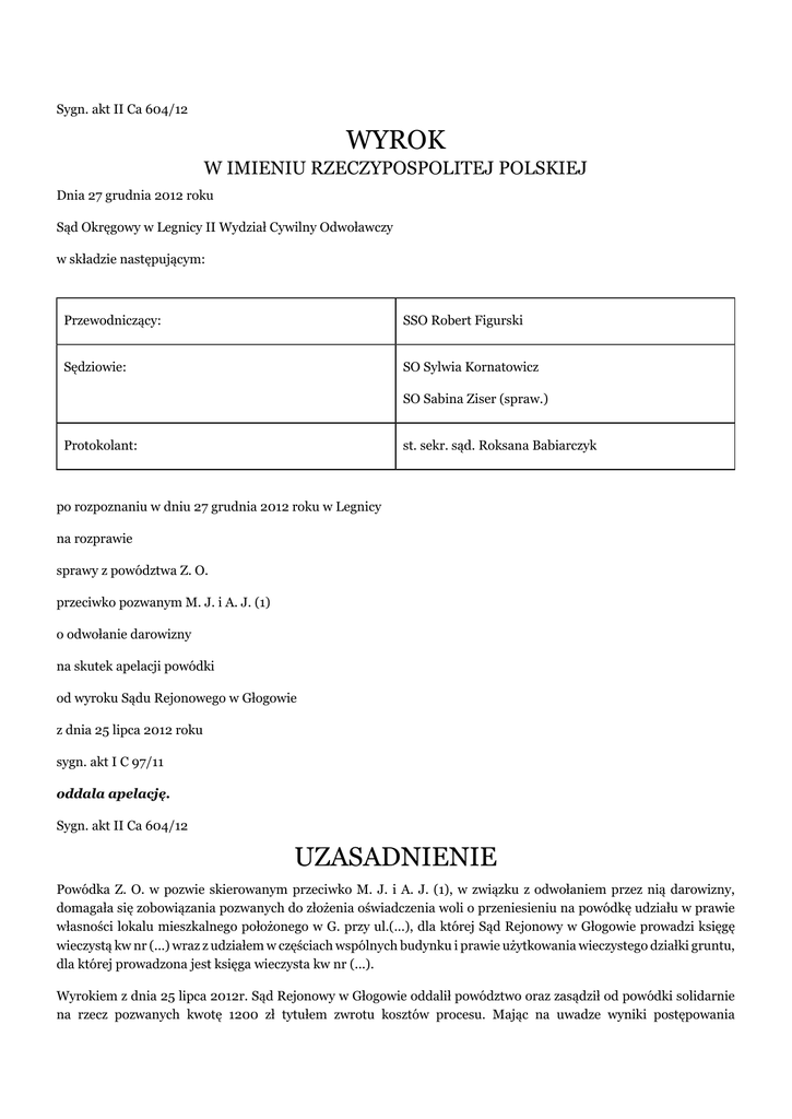 Sygn. akt II Ca 604/12 WYROK W IMIENIU RZECZYPOSPOLITEJ POLSKIEJ Dnia 27 grudnia 2012 roku Sąd Okręgowy w Legnicy II Wydział Cywilny Odwoławczy w składzie następującym: Przewodniczący: SSO Robert Figurski Sędziowie: SO Sylwia Kornatowicz SO Sabina Ziser (spraw.) Protokolant: st. sekr. sąd. Roksana Babiarczyk po rozpoznaniu w dniu 27 grudnia 2012 roku w Legnicy na rozprawie sprawy z powództwa Z. O. przeciwko pozwanym M. J. i A. J. (1) o odwołanie darowizny na skutek apelacji powódki od wyroku Sądu Rejonowego w Głogowie z dnia 25 lipca 2012 roku sygn. akt I C 97/11 oddala apelację. Sygn. akt II Ca 604/12 UZASADNIENIE Powódka Z. O. w pozwie skierowanym przeciwko M. J. i A. J. (1), w związku z odwołaniem przez nią darowizny, domagała się zobowiązania pozwanych do złożenia oświadczenia woli o przeniesieniu na powódkę udziału w prawie własności lokalu mieszkalnego położonego w G. przy ul.(...), dla której Sąd Rejonowy w Głogowie prowadzi księgę wieczystą kw nr (...) wraz z udziałem w częściach wspólnych budynku i prawie użytkowania wieczystego działki gruntu, dla której prowadzona jest księga wieczysta kw nr (...). Wyrokiem z dnia 25 lipca 2012r. Sąd Rejonowy w Głogowie oddalił powództwo oraz zasądził od powódki solidarnie na rzecz pozwanych kwotę 1200 zł tytułem zwrotu kosztów procesu. Mając na uwadze wyniki postępowania dowodowego Sąd Rejonowy uznał, że zachowanie pozwanych wobec powódki nie wyczerpuje znamion zachowania odpowiadającego rażącej niewdzięczności. Powódka sama zgodziła się na zamieszkanie w lokalu wnuka S. po czym wycofała tę zgodę bo zdenerwowało ją, że wprowadził się on przed Bożym Narodzeniem podczas gdy ona chciała aby miało to miejsce po Ś.. Przyznała, że nie jest w żaden sposób ograniczona w korzystaniu z kuchni czy łazienki, ale z nich nie korzysta bo przeszkadzają jej znajdujące się tam rzeczy dziecka. W tych okolicznościach Sąd uznał, że nie można przyjąć, że pozwani dopuścili się rażącej niewdzięczności zezwalając synowi na zamieszkanie w tym lokalu. Dodatkowo zauważył, że powódka nie korzystała z niego w pełnym zakresie gdyż mieszkała z B. K.. Ponadto mieszkanie to jest 3 pokojowe i powódka wybrała sobie największy pokój. Brak jest również dowodów na to aby wnuk zachowywał się niewłaściwie w tym urządzał głośne spotkania towarzyskie. Świadkowie przedstawieni przez nią – sąsiedzi nie potwierdzili tego faktu, nie ma ponadto dowodów na zachowanie wnuka, które naruszałoby godność powódki. Za nieuzasadnione uznał Sąd pierwszej instancji również zarzuty dotyczące braku opieki podczas choroby i braku pomocy finansowej. Wskazał, że powódka pomimo kilku przewlekłych chorób i podeszłego wieku jest osobą samodzielną, która opiekuje się małym dzieckiem. Jedynym konkretnym przykładem braku pomocy w chorobie było zapalenie płuc, jakie powódka przeszła w 2010r. przy czym celowo nie zawiadomiła żadnej córek o tym fakcie bo chciała się przekonać kto do niej zadzwoni. Co do sytuacji finansowej to nie była ona zła albowiem oprócz emerytury dodatkowo otrzymywała wynagrodzenie za opiekę nad dzieckiem. Powódka sama przyznała, że nie brakowało jej pieniędzy i pomagała finansowo córce A. J. (2). Orzeczenie o kosztach procesu wydane zostało na podstawie art. 102 kpc obciążając powódkę częściowo kosztami zastępstwa prawnego. Z wyrokiem powyższym w całości nie zgodziła się powódka wnosząc apelację, w której zarzuciła naruszenie art. 233 par. 1 kpc poprzez błędną i dowolną ocenę zebranego w sprawie materiału dowodowego. W jej ocenie zachowanie pozwanych nosi cechy rażącej niewdzięczności albowiem wprowadzili do mieszkania na siłę wnuka S. wraz z konkubiną a jej rzeczy przenieśli do jednego pokoju. Wnuk wyrzucił ją z pokoju, używa wobec niej słów wulgarnych, tak samo jak córka D. K.. Osoby te zaatakowały ją w dniu 24 marca 2012r. na co posiada obdukcję lekarską. Nie ma warunków do nocowania w mieszkaniu oraz obawia się o swoje życie i zdrowie. Wskazując na powyższe domagała się zmiany zaskarżonego wyroku i uwzględnienie powództwa. Sąd Okręgowy zważył co następuje: Apelacja powódki jest pozbawiona uzasadnionych podstaw prawnych. Sąd Rejonowy poczynił prawidłowe ustalenia faktyczne, które są wynikiem poprawnej analizy zebranego w sprawie materiału dowodowego. W żadnym miejscu Sąd pierwszej instancji nie naruszył zasad oceny materiału dowodowego określonych w przepisie art. 233 par. 1 kpc, przeciwnie pozostając z nimi w zgodzie przeprowadził analizę i wnioskowanie, któremu nie sposób skutecznie zarzucić dowolności czy sprzeczności z zebranym w sprawie materiałem dowodowym. Te okoliczności spowodowały, że Sąd Okręgowy przyjął ustalenia Sądu pierwszej instancji za własne. W materiale dowodowym, wbrew zarzutowi apelacji brak jest dowodów potwierdzających twierdzenia powódki o rażącej niewdzięczności pozwanych. To na powódce spoczywał zgodnie z treścią art. 6 kpc obowiązek udowodnienia tej okoliczności tymczasem całokształt zeznań przesłuchanych w sprawie świadków nie pozostawia żadnych wątpliwości co do tego, że w zachowaniu pozwanych wobec powódki trudno dopatrzyć się niewdzięczności, a co dopiero rażącej. Sąd Najwyższy w wyroku z dnia 17 listopada 2011r., IV CSK 113/11, wskazał, że rażącą niewdzięczność w rozumieniu art. 898 par. 1 kc musi cechować znaczne nasilenie złej woli skierowanej na wyrządzenie darczyńcy krzywdy lub szkody majątkowej. Czynami świadczącymi o rażącej niewdzięczności obdarowanego są odmówienie pomocy w chorobie, odmowa pomocy osobom starszym, rozpowszechnianie uwłaczających informacji o darczyńcy, pobicie czy się ciężkie znieważenia. Z przeprowadzonych w sprawie dowodów wynika, że do zamieszkania w lokalu przy ul.(...) wnuka S. J. doszło za zgodą powó