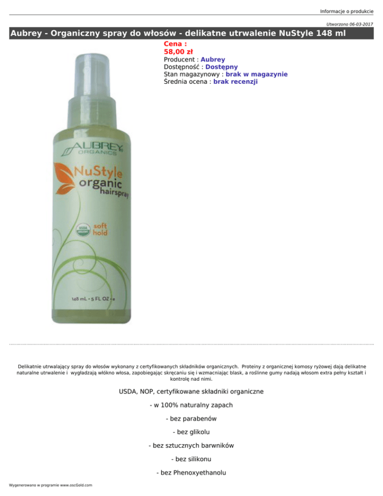 Informacje o produkcie Utworzono 06-03-2017 Aubrey - Organiczny spray do włosów - delikatne utrwalenie NuStyle 148 ml Cena : 58,00 zł Producent : Aubrey Dostępność : Dostępny Stan magazynowy : brak w magazynie Średnia ocena : brak recenzji Delikatnie utrwalający spray do włosów wykonany z certyfikowanych składników organicznych. Proteiny z organicznej komosy ryżowej dają delikatne naturalne utrwalenie i wygładzają włókno włosa, zapobiegając skręcaniu się i wzmacniając blask, a roślinne gumy nadają włosom extra pełny kształt i kontrolę nad nimi. USDA, NOP, certyfikowane składniki organiczne - w 100% naturalny zapach - bez parabenów - bez glikolu - bez sztucznych barwników - bez silikonu - bez Phenoxyethanolu Wygenerowano w programie www.oscGold.com - bez PEG i SLS - bez składników GMO - fizjologiczne pH - hypoalergiczny Kluczowe składniki: proteiny z organicznej komosy ryżowej - utrwalają fryzurę, wygładzają włókno włosa i nadają połysk; organiczna guma arabska i syrop ryżowy - pogrubiają włosy, dodają objętości i kontroli nad włosami. Składniki: Aqua, alcohol denat. (38b, lavender*), chenopodium quinoa seed extract*, acacia gum*, oryza sativa (rice) extract*, citrus aurantium dulcis (orange) peel oil*, citrus medica limonum (lemon) peel oil*, citrus aurantifolia (lime) oil*, eucalyptus globulus leaf oil*. *Składniki organiczne