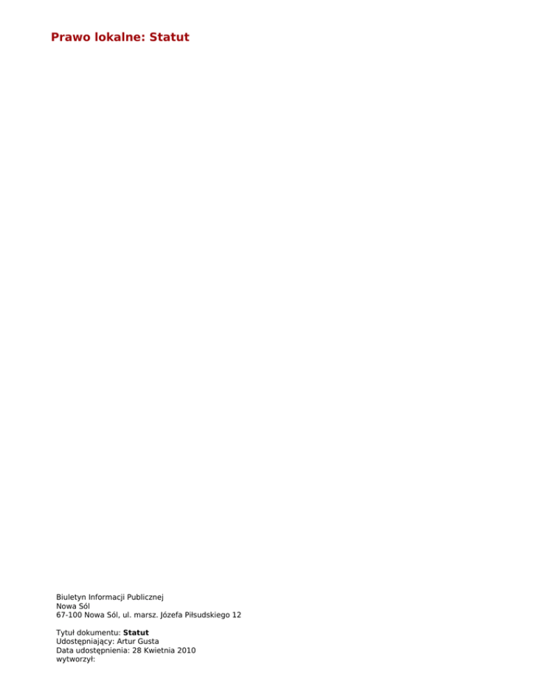 Prawo lokalne: Statut Biuletyn Informacji Publicznej Nowa Sól 67-100 Nowa Sól, ul. marsz. Józefa Piłsudskiego 12 Tytuł dokumentu: Statut Udostępniający: Artur Gusta Data udostępnienia: 28 Kwietnia 2010 wytworzył: