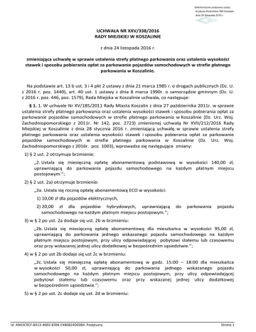 Elektronicznie podpisany przez: Krystyna Kościńska; RM Koszalin dnia 24 listopada 2016 r. UCHWAŁA NR XXV/338/2016 RADY MIEJSKIEJ W KOSZALINIE z dnia 24 listopada 2016 r. zmieniająca uchwałę w sprawie ustalenia strefy płatnego parkowania oraz ustalenia wysokości stawek i sposobu pobierania opłat za parkowanie pojazdów samochodowych w strefie płatnego parkowania w Koszalinie. Na podstawie art. 13 b ust. 3 i 4 pkt 2 ustawy z dnia 21 marca 1985 r. o drogach publicznych (Dz. U. z 2016 r. poz. 1440), art. 40 ust. 1 ustawy z dnia 8 marca 1990r. o samorządzie gminnym (Dz. U. z 2016 r. poz. 446, poz. 1579), Rada Miejska w Koszalinie uchwala, co następuje: § 1. 1. W uchwale Nr XV/185/2011 Rady Miasta Koszalin z dnia 27 października 2011r. w sprawie ustalenia strefy płatnego parkowania oraz ustalenia wysokości stawek i sposobu pobierania opłat za parkowanie pojazdów samochodowych w strefie płatnego parkowania w Koszalinie (Dz. Urz. Woj. Zachodniopomorskiego z 2011r. Nr 142, poz. 2723) zmienionej uchwałą Nr XVII/212/2016 Rady Miejskiej w Koszalinie z dnia 28 stycznia 2016 r. zmieniającą uchwałę w sprawie ustalenia strefy płatnego parkowania oraz ustalenia wysokości stawek i sposobu pobierania opłat za parkowanie pojazdów samochodowych w strefie płatnego parkowania w Koszalinie (Dz. Urz. Woj. Zachodniopomorskiego z 2016r. poz. 1003), wprowadza się następujące zmiany: 1) § 2 ust. 2 otrzymuje brzmienie: „2. Ustala się miesięczną opłatę abonamentową podstawową w wysokości 140,00 zł, uprawniającą do parkowania pojazdu samochodowego na każdym płatnym miejscu postojowym.”; 2) § 2 ust. 2a) otrzymuje brzmienie: „2a. Ustala się roczną opłatę abonamentową ECO w wysokości: 1) 10,00 zł dla pojazdów elektrycznych, 2) 20,00 zł dla pojazdów hybrydowych, uprawniającą samochodowego na każdym płatnym miejscu postojowym.”; do parkowania pojazdu 3) w § 2 po ust. 2a dodaje się ust. 2b w brzmieniu: „2b. Ustala się miesięczną opłatę abonamentową dla mieszkańca w wysokości 95,00 zł, uprawniającą do parkowania jednego wskazanego pojazdu samochodowego na każdym płatnym miejscu postojowym, przy ulicy odpowiadającej pobytowi stałemu lub czasowemu oraz przy wskazanej jednej ulicy dodatkowej w bezpośrednim sąsiedztwie.”; 4) w § 2 po ust 2b dodaje się ust 2c w brzmieniu: „2c. Ustala się miesięczną opłatę abonamentową w godz. 15:00 – 18:00 dla mieszkańca w wysokości 50,00 zł, uprawniającą do parkowania jednego wskazanego pojazdu samochodowego na każdym płatnym miejscu postojowym, przy ulicy odpowiadającej pobytowi stałemu lub czasowemu oraz przy wskazanej jednej ulicy dodatkowej w bezpośrednim sąsiedztwie.”; 5) w § 2 po ust. 2c dodaje się ust. 2d w brzmieniu: Id: A9A3C9CF-8A13-46B3-8394-E486B24D03B4. Podpisany Strona 1 „2d. Ustala się miesięczną opłatę abonamentową w godz. 16:00 – 18:00 dla mieszkańca w wysokości 30,00 zł, uprawniającą do parkowania jednego wskazanego pojazdu samochodowego na każdym płatnym miejscu postojowym, przy ulicy odpowiadającej pobytowi stałemu lub czasowemu oraz przy wskazanej jednej ulicy dodatkowej w bezpośrednim sąsiedztwie.”. 2. W Regulaminie pobierania opłat w strefie płatnego parkowania, stanowiącym załącznik nr 2 do uchwały Nr XV/185/2011 Rady Miasta Koszalina z dnia 27 października 2011r., w sprawie ustalenia strefy płatnego parkowania oraz ustalenia wysokości stawek i sposobu pobierania opłat za parkowanie pojazdów samochodowych w strefie płatnego parkowania w Koszalinie, wprowadza się następujące zmiany: 1) w § 1 ust. 2 pkt 10 otrzymuje brzmienie: „10) abonament podstawowy – dokument opłacony z góry, zawierający w szczególności numer seryjny, numer rejestracyjny pojazdu, uprawniający do wielokrotnego parkowania wskazanego pojazdu, na płatnych miejscach postojowych w SPP w czasie jego ważności;”; 2) w § 1 ust. 2 pkt 10a otrzymuje brzmienie: „10a) abonament ECO - dokument opłacony z góry, zawierający w szczególności numer seryjny, numer rejestracyjny pojazdu, uprawniający do wielokrotnego parkowania w całym obszarze strefy pojazdów z napędem elektrycznym, hybrydowym (spalinowo – elektrycznym), wystawiony na podstawie wpisu w dowodzie rejestracyjnym pojazdu samochodowego lub świadectwa homologacji lub świadectwa zgodności WE dla kompletnych pojazdów w czasie jego ważności;”; 3) w § 1 ust. 2 po pkt 10a dodaje się pkt 10b w brzmieniu: „10b) abonament dla mieszkańca - dokument opłacony z góry, zawierający w szczególności numer seryjny, numer rejestracyjny pojazdu oraz ulice na których obowiązuje, uprawniający do wielokrotnego parkowania pojazdu, na płatnych miejscach postojowych w SPP na wskazanych w nim ulicach w czasie jego ważności; wystawiony na podstawie dowodu rejestracyjnego potwierdzającego prawo własności lub współwłasności pojazdu samochodowego i dokumentu poświadczającego miejsce pobytu stałego lub czasowego przy ulicy na której zostały wyznaczone płatne miejsca postojowe w obszarze SPP; poprzez własność pojazdu należy również rozumieć samochody osób, posiadających ważną umowę leasingową lub umowę przewłaszczenia;”; 3a) w § 1 ust. 2 po pkt 10b dodaje się pkt 10c w brzmieniu: „10c) abonament w godz. 15:00 – 18:00 dla mieszkańca - dokument opłacony z góry, zawierający w szczególności numer seryjny, numer rejestracyjny pojazdu oraz ulice na których obowiązuje, uprawniający do wielokrotnego parkowania pojazdu, na płatnych miejscach postojowych w SPP na wskazanych w nim ulicach w czasie jego ważności; wystawiony na podstawie dowodu rejestracyjnego potwierdzającego prawo własności lub współwłasności pojazdu samochodowego i dokumentu poświadczającego miejsce pobytu stałego lub czasowego przy ulicy na której zostały wyznaczone płatne miejsca postojowe w obszarze SPP; poprzez własność pojazdu należy również rozumieć samochod