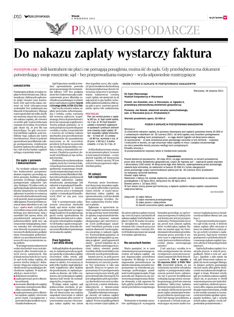 D10 Wtorek rp.pl/prawo ◊ 6 września 2011 PRAWO GOSPODARCZE Do nakazu zapłaty wystarczy faktura POSTĘPOWANIE | Jeśli kontrahent nie płaci i nie pomagają ponaglenia, można iść do sądu. Gdy przedsiębiorca ma dokument potwierdzający swoje roszczenie, sąd – bez przeprowadzania rozprawy – wyda odpowiednie rozstrzygnięcie ŁUKASZ SITEK Pamiętajmy jednak, że nakaz zapłaty to broń obosieczna. Tak samo jak my z fakturą do sądu może pójść również nasz kontrahent. Gdy sąd wyda nakaz, stanowi on tytuł zabezpieczenia wykonalny bez nadawania mu klauzuli wykonalności. Dlatego warto sprawdzić nie tylko, kiedy my możemy starać się o uzyskanie nakazu zapłaty, ale również co zrobić, gdy to przeciwko nam zostanie on wydany. Oczywiście gdy okaże się, że jest dla nas krzywdzący, bo gdy rzeczywiście mieliśmy zapłacić, a nie zrobiliśmy tego, nakazu nie warto kwestionować. Może to jedynie spowodować przedłużenie całego postępowania, zwiększenie kosztów sądowych i odsetek, jakie i tak trzeba będzie zapłacić od tego, co jesteśmy winni. Do sądu z pozwem i dokumentami Na wydanie nakazu zapłaty bez konieczności przeprowadzania rozprawy pozwalają sądowi przepisy kodeksu postępowania cywilnego regulujące postępowanie nakazowe (art. 4841 i kolejne). Wynika z nich, że sąd rozpoznaje sprawę na posiedzeniu niejawnym na wniosek zgłoszony w pozwie (co oznacza, że ten, kto dochodzi swoich racji, czyli powód, musi przygotować takie pismo). Pozew powinien zawierać dane określone w art. 126 k.p.c. >patrz wzór , czyli przede wszystkim oznaczenie sądu, do którego jest skierowany, imię i nazwisko lub nazwę stron, ich przedstawicieli ustawowych i pełnomocników (jeśli tacy są), oznaczenie rodzaju pisma, osnowę wniosku lub oświadczenia oraz dowody na poparcie przytoczonych okoliczności, podpisy stron (ewentualnie pełnomocników czy przedstawicieli ustawowych) oraz wymienienie załączników. W postępowaniu nakazowym wolno dochodzić roszczeń pieniężnych albo świadczenia innych rzeczy zamiennych. Aby jednak można było liczyć na to, że sąd wyda nakaz zapłaty, do pozwu trzeba dołączyć dokumenty. Mają one wskazywać na okoliczności uzasadniające dochodzone żądanie. W myśl art. 485 k.p.c. może to być: ∑ dokument urzędowy, ∑ zaakceptowany przez dłużnika rachunek, ∑ wezwanie dłużnika do zapłaty i pisemne oświadczenie dłużnika o uznaniu długu, ∑ zaakceptowane przez dłużnika żądanie zapłaty, zwrócone przez bank i niezapłacone z powodu braku środków na rachunku bankowym. Sąd Najwyższy orzekł, że również upoważnienie powoda przez pozwanego do wystawienia faktury VAT bez podpisu może być traktowane jako zaakceptowanie przez dłużnika rachunku uzasadniające wydanie przez sąd nakazu zapłaty (wyrok z 23 lutego 2006, II CSK 131/05). Sąd wyda również nakaz zapłaty przeciwko zobowiązanemu z weksla, czeku, warrantu lub rewersu należycie wypełnionego, których prawdziwość i treść nie nasuwają wątpliwości. Trzeba jednak pamiętać, że w razie przejścia na powoda praw z weksla, z czeku, z warrantu lub z rewersu do wydania nakazu niezbędne jest przedstawienie dokumentów do uzasadnienia roszczenia (o ile oczywiście przejście tych praw na powoda nie wynika bezpośrednio z weksla, z czeku, z warrantu lub z rewersu). Chodzi tu o protest, dowody notyfikacji czy np. rachunek zwrotny. Podstawą do wydania nakazu zapłaty może być również dołączona do pozwu umowa, dowód spełnienia wzajemnego świadczenia niepieniężnego oraz dowód doręczenia dłużnikowi faktury lub rachunku, jeżeli powód dochodzi należności zapłaty świadczenia pieniężnego lub odsetek w transakcjach handlowych określonych w ustawie z 12 czerwca 2003 o terminach zapłaty w transakcjach handlowych (DzU nr 139, poz. 1323 ze zm.). Gdy w postępowaniu nakazowym roszczenia dochodzi bank, sąd może wydać nakaz zapłaty na podstawie wyciągu z ksiąg bankowych podpisanego przez osoby upoważnione do składania oświadczeń w zakresie praw i obowiązków majątkowych banku i opatrzonego pieczęcią banku oraz dowodu doręczenia dłużnikowi pisemnego wezwania do zapłaty. Dwa tygodnie i ani dnia dłużej Jeśli sąd dojdzie do przekonania, że żądania powoda są zgodne z prawdą, wyda nakaz zapłaty. Oczywiście tylko wtedy, gdy uzna żądania powoda za uzasadnione w całości. A to oznacza, że jeśli tylko będzie miał jakiekolwiek wątpliwości albo dojdzie do przekonania, że żądania powoda są słuszne, ale tylko częściowo, nie wyda nakazu zapłaty. Sprawa trafi wtedy do normalnego trybu, z rozprawą. Wydając nakaz zapłaty, sąd jednocześnie orzeknie, że pozwany ma w ciągu dwóch tygodni od doręczenia mu nakazu zaspokoić roszczenie w całości wraz z kosztami albo wnieść w tym terminie zarzuty. Otrzymujący nakaz zapłaty ma zatem dwa tygodnie na to, aby zapłacić przeciwnikowi dochodzoną kwotę powiększoną o koszty (te wynoszą od pozwu w postępowaniu nakazowym czwartą część opłaty, nie mniej niż 30 zł; najczęściej w grę będzie wchodziła opłata stosunkowa obliczana jako 5 proc. wartości przedmiotu sporu lub zaskarżenia). PRZYKŁAD Pan Jan wniósł pozew o zapłatę 80 tys. zł. Sąd ustalił opłatę na 1 tys. zł. W myśl bowiem ustawy o kosztach sądowych w sprawach cywilnych stanowi ona czwartą część opłaty. W tym wypadku opłata stosunkowa – w myśl art. 13 ustawy – od 80 tys. wyniosła 4 tys. zł (5 proc. x 80 tys.). A jedna czwarta z 4 tys. to 1 tys. zł. Jeśli jednak pozwany uważa, że nie powinien płacić, to może w tym samym terminie – a więc dwóch tygodni od doręczenia nakazu – wnieść zarzuty. W tym celu trzeba przygotować odpowiednie pismo. W całości lub częściowo Pozwany może kwestionować doręczony mu nakaz zapłaty w całości albo tylko w pewnej części (wtedy w części niezaskarżonej nakaz zapłaty się uprawomocnia, czyli