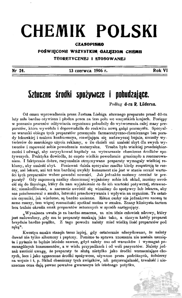 CHEMIK POLSKI CZASOPISMO POŚWIĘCONE WSZYSTKIM OAŁJgZIOM CHEMII TEORETYCZNEJ I STOSOWANEJ Nr 24. 13 czerwca 1906 r. Rok VI Sztuczne środki spożywcze i pobudzające. Podług d-ra R. Ludersa. Od czasu wprowadzenia przez Justusa Liebiga sławnego preparatu przed 40-tu laty szła bardzo ożywiona i płodna praca na tem polu we wszystkich krajach. Postępy w poznaniu procesów odżywiania organizmu pobudziły do wytworzenia całej masy preparatów, która wywołała i doprowadziła do rozkwitu nową gałąź przemysłu. Specjalne warunki obiegu tych preparatów przemysłu farmaceutyczno-chemicznego bez porady lekarskiej i szalona konkurencya, rozwijająca się nadzwyczaj bujnie, zmusiły wytwórców do szerokiego użycia reklamy, o ile chcieli oni znaleść zbyt dla swych wjtworów i zapewnić sobie powodzenie materyalce. Trzeba było wielkiej przedsiębiorczości i odwagi, aby zaryzykować kapitały na wytwarzanie chemiczne środków spożywczych. Praktyka dowiodła, że często wielkie powodzenie graniczyło z rozczarowaniem. I faktycznie dobre, racyonalnie otrzymywane preparaty wymagały wielkiej reklamy, aby znaleść zbyt. Ponieważ dzieła specyalne rzadko kiedy rozpatrują te rzeczy, ani lekarz, ani też tem bardziej zwykły konsument nie jest w stanie ocenić wartości tych preparatów wobec powodzi nowości. Jak jednakże możemy oceniać te prer paraty? Gdj zapomocą analizy chemicznej wyjaśnimy sobie ich skład, musimy zwrócić się do fizyologa, który da nam wyjaśnienie co do ich wartości pożywczej, strawności,'nieszkodliwości, a nareszcie zwrócić się winniśmy do spożywcy lub lekarza, aby nas poinformował o smaku, łatwości przechowywania i wpływie na organizm. Te ostatnie czynniki, jak wiadomo, są bardzo zmienne. Bóżne osoby nie jednakowo znoszą te same rzeczy, tem więcej rozmaitości spotkać można w smaku. Znany klinicysta żartem lecz trafnie określa smak preparatów sztucznych w sposób następujący. Wynalazca uważa je za bardzo smaczne, za nim idzie człowiek zdrowy, który n jest zadowolony, gdy mu te preparaty smakują jako tako, a chorym każdy preparat brzydnie bardzo prędko. Z tego powodu należy mieć wielką ilość preparatów pod ręką". Kwestya smaku stanęła teraz lepiej, gdy ostatecznie zdecydowano, że należy dawać nie tylko albumozy i peptozy. Pomimo to sprawa znoszenia nie została usunięta i pytanie to będzie istniało zawsze, gdyż zależy ono od warunków i wymagań poszczególnych konsumentów, a w wielu przypadkach i od woli pacyentów. Należy jednak zwrócić uwagę, że preparaty te służą nietylko jako środki wzmacniające chorych, lecz i jako zgęszczone środki spożywcze, używane przez podróżnych, żołnierzy na wojnie i t. p. Skład chemiczny tych związków, ich przyswajalność, trwałość i nieznaczna cena dają pewne poważne gwarancye ich istotnego pożytku. 450 Nr 24 CHEMIK POLSKI. Postaramy się podać klasyfikacyę i ocenę tych preparatów w zależności od ich głównego składnika i głównych cech, jako: 1) preparaty białkowe z mięsa, mleka, jajek i roślin, 2) węglowodany, 3) tłuszcze, 4) środki pobudzające z ekstraktów mięsnych i roślinnych, 5) preparaty mleczne dla niemowląt, 6) różne sole pożywne i związki fosforowo-białkowe. I. Preparaty białkowe. Tabelka poniższa dać może pojęcie o składzie chemicznym tego najważniejszego działu pożywczych preparatów białkowych. % wody A. Z białka mięsnego. Kalodal Myogen Somatoza Soson Tropon . . . . . B. Z białka mlecznego. Bioson Eukazyna Galaktogen Somatoza mleczna . . Nutroza Plasmon Sanatogen C. Z białka z jajek. Pokarm Heydena. , . Protogen D. Z białka roślinnego. Aleuronat Laktogal Roborat Tutulina 12,2 9,0 3,3 3-9 6,25 9,2 18,0 9,2 12,5 9,8 2,36 7,0 11,6 11,9 białka 95 83,25 81,50 85,70 83,90 69,30 84-90 68-70 74,9 85—90 74,5 85-90 6,72 0,1-0,8 1,2 6,7 6,9 1,13 ,% tłuszczu 1,8$ lecytyny 10,18 3,87 8,39 85,31 30,0 82-85,0 15,55 83 87—94 Uwagi ekstraktu 6,08 N=97,12? białko? H lecytyny W lecytyny a) P r e p a r a t y b i a ł k o w e z m i ę s a . Ponieważ mięso jest jednym z najważniejszych środków spożywczych, zawierających białko, nic też dziwnego, że służy ono za materyał surowy do wytwarzania pierwsz}'ch białkowych środków spożywczych. Gdy abstrahować będziemy od ekstraktów mięsnych i soków, służących jako środki pobudzające, najstarsze takie preparaty miały postać Carne pura, mosqueras, mączki mięsnej i t. p. Za temi pierwszemi preparatami surowerai poszły albumozy i peptony. Te ostatnie są, jak wiadomo, produktami przemiany białek, powstającemi pod wpływem trawienia naturalnego lub sztucznego zapomocą fermentów zwierzęcych lub roślinnych. Preparaty te opierają się na tem przypuszczeniu, że całe białko, przed wejściem do organizmu musi przybrać najpierw postać peptonu. Prace Brilckego, Voita i innych stwierdziły, że w żołądku i w kiszkach spotkać zawsze można obok peptonu niezmienione białko. Voit zbudował następnie teoryę, że peptony służyć mogą tylko jako środki, oszczędzające białko, gdyż nie są one w stanie usunąć straty białka w organizmie i że tylko niezmienione, niespeptonizowane białko służyć może do odbudowy organów. Fakty te pozbawiły racyonalnej podstawy stosowanie peptonów, 1 chory żołądek jest jeszcze w stanie trawić białko i dawanie albumoz i peptonów może być uniknięte. W wielkich ilościach mogą one nawet drażnić i szkodzić więcej, niż inne preparaty białkowe. Rozstrzygający wpływ na rezultat oceny preparatów mogą więc mieć tylko pozostałe wspomniane czynniki. Nr 24 CHEMIK 451 POLSKI. Rozejrzmy się w pojedynczych preparatach. Następująca tabliczka daje nam pojęcie o składzie preparatów, będących obecnie na rynku. Podczas obliczania kaloryj białko dawało ich 4,1, gdy opisane dalej węglowodany i tłuszcze obliczyć można na 9,3 i 4,1 kaloryi. Preparaty białkowe z mięsa. N
