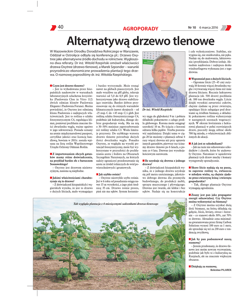 40 AGROPORADY Nr 10 6 marca 2016 Alternatywą drzewo tlenowe W Mazowieckim Ośrodku Doradztwa Rolniczego w Warszawie, Oddział w Ostrołęce odbyła się konferencja pt.: Drzewo Oxytree jako alternatywne źródło dochodu w rolnictwie. Wygłoszono dwa referaty. Dr inż. Witold Rzepiński omówił właściwości drzewa Oxytree (drzewo tlenowe), a Marek Szponder – warunki przyrodniczo-ekonomiczne prowadzenia plantacji tego drzewa. O rozmowę poprosiliśmy dr. inż. Witolda Rzepińskiego. ■■Z importowaniem obcych gatunków mamy różne doświadczenia, na przykład bardzo złe z barszczem Sosnowskiego? – Oxytree jest drzewem nieinwazyjnym, nasiona są niepłodne. ■■Jakimi właściwościami charakteryzuje się to drzewo? – Z doświadczeń hiszpańskich i węgierskich wynika, że jest to drzewo o dużych liściach, mało wymagające ■■Jak szybko rośnie? – Oxytree niezwykle szybo rośnie. Już w 6 roku od posadzenia osiąga nawet 15 m wysokości, a jego pień średnicę 35 cm. Drzewo rośnie prosto, pień nie ma sęków. System korzenio- Fot. Bolesław Pilarek i bardzo wytrzymałe. Może rosnąć nawet na glebach piaszczystych. Jest mało wrażliwe na pH gleby, toleruje wartości od 5,0 do 8,9 pH. Jest wykorzystywane jako drzewo stabilizujące osuwiska. Bardzo dobrze przystosowuje się do różnych warunków klimatycznych (nawet skrajnych – od -25 stop. C do +45 stop. C) i gleb. Jest rośliną szlaku fotosyntetycznego C4, podobnie jak kukurydza, dlatego dobrze gospodaruje wodą. Ma na nią o 30–50% mniejsze zapotrzebowanie niż rośliny szlaku C3. Woda limituje przyrosty. Do szybkiego wzrostu drzewo tlenowe potrzebuje dużych ilości dwutlenku węgla. Ponadto Oxytree, ze względu na wysoki potencjał fotosyntetyczny, może być wykorzystane w przyszłości do pochłaniania azotu i fosforu na Obszarach Szczególnie Narażonych, na których należy ograniczyć przedostawanie się azotu ze źródeł rolniczych do wód powierzchniowych i gruntowych. Dr inż. Witold Rzepiński wy sięga do głębokości 9 m i pobiera składniki pokarmowe z całego profilu glebowego. Korona może osiągnąć szerokość 10 m. Po ścięciu z korzeni odrasta kilka pędów. Trzeba pozostawić najsilniejszy. Dzięki temu w ciągu 20 lat możemy z plantacji zebrać 4 razy więcej drewna niż przy uprawie innych gatunków, pierwszy raz ścinamy drzewo tlenowe po 6 latach, a potem co 4 lata. Drewno jest wysokojakościowym surowcem. ■■Ile uzyskuje się drewna z jednego drzewa? – Z doświadczeń hiszpańskich wynika, że z jednego drzewa uzyskuje się pół metra sześciennego, jakościowo dobrego drewna dla przemysłu budowlanego, do produkcji mebli, sprzętu muzycznego i pływającego. Drewno jest twarde, ale lekkie i bez sęków. Nadaje się na konstrukcje Tak wygląda plantacja z 4-miesięcznymi sadzonkami drzewa tlenowego Fot. www.oxytree.com ■■Czym jest drzewo tlenowe? – Jest to wyhodowana przez hiszpańskich naukowców w warunkach laboratoryjnych szlachetna krzyżówka (Paulownia Clon in Vitro 112) dwóch odmian klonów Paulownia Elegante i Paulownia Forunei. Można powiedzieć, że Oxytree jest odmianą klonu Paulownia o najlepszych właściwościach. Jest to roślina o szlaku fotosyntetycznym C4, regulująca klimat, ponieważ pochłania znaczne ilości dwutlenku węgla, ważne ogniwo w jego sekwestracji. Posiada uznany na arenie międzynarodowej paszport, certyfikat jakości oraz licencję handlową, bowiem w 2011r. została wpisana na listę roślin Wspólnotowego Urzędu Ochrony Odmian Roślin. i cele wykończeniowe. Stabilne, nie wygina się, nie zniekształca, nie pęka. Nadaje się do malowania, lakierowania i przyklejania. Dobrze izoluje. Aktualnie najdroższa i najlepsza deska windsurfingowa wykonana jest z tego drewna. ■■Wspomniał pan o dużych liściach. – Ogromne liście (25–45 cm) zużywają 10-krotnie więcej dwutlenku węgla i wytwarzają więcej tlenu niż inne drzewa liściaste. Rocznie hektarowa plantacja (ok. 500 drzew) pochłania ok. 100 ton dwutlenku węgla. Liście dzięki wysokiej zawartości cukrów, chętnie zjadane są przez zwierzęta, opadające liście zalegające pod drzewami są źródłem biomasy, a składniki pokarmowe roślina wykorzystuje w następnych sezonach wegetacyjnych. W okresie kwitnienia z hektarowej plantacji w pełni rozwiniętych drzew, pszczoły mogą zebrać około 700 kg miodu, o właściwościach zbliżonych do akacji. ■■A jak jest ze szkodnikami? – Jak na razie nie odnotowano szkodników i chorób, które by atakowały Oxytree. Natomiast w sąsiedztwie plantacji tych drzew muchy i komary występowały sporadycznie. ■■Skoro liście nadają się na paszę, to zapewne rośliny te, zwłaszcza w młodym wieku, są chętnie zjadane przez zwierzynę leśną i zwierzęta gospodarskie? – Tak, dlatego plantacje Oxytree wymagają ogrodzenia. ■■Znany jest pan jako propagator energii odnawialnej. Czy Oxytree można wykorzystać na biomasę? – Z Oxytree można uzyskać dużą ilość biomasy, na którą składają się gałęzie, liście, kwiaty, owoce i korzenie – co stanowi około 30%, zaś 70% to drewno. Aktualnie cena minimalna gwarantowana przez firmę Carbon Solutions wynosi 100 euro za 1 metr, ale sprzedaje się też za 230 euro z tendencją zwyżkową. ■■Jak by pan podsumował naszą rozmowę? – Jestem przekonany, że drzewo tlenowe jest moim nowym wyzwaniem, podobnie jak było to z kukurydzą na Kurpiach, ale na znacznie większym obszarze. ■■Dziękuję za rozmowę. Bolesław PILAREK tygodnik PORADNIK rolniczy