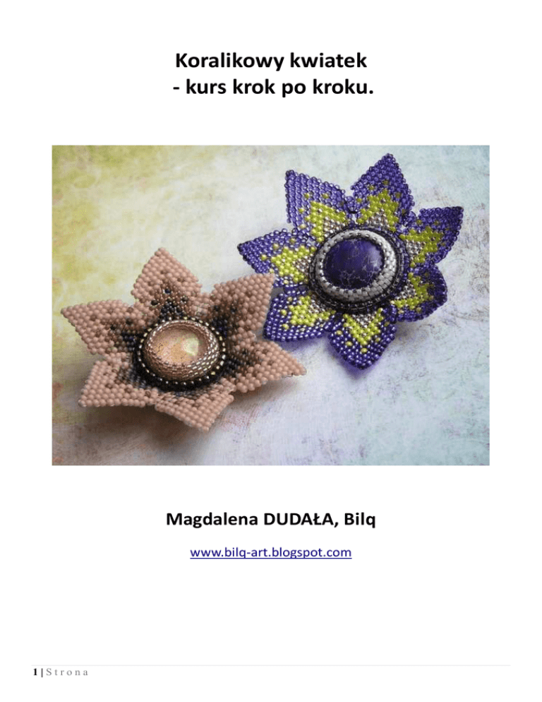 Koralikowy kwiatek - kurs krok po kroku. Magdalena DUDAŁA, Bilq www.bilq-art.blogspot.com 1|Strona Tutorial przeznaczony jest głównie dla osób, które z plecionkami/haftem koralikowym miały już co nieco do czynienia, ale postaram się wytłumaczyć wszystko tak, by było zrozumiałe nawet dla początkujących – mam nadzieję że mi się to uda. TECHNIKI: haft koralikowy (oplatanie kaboszonu ścięgiem peyote), flat peyote. MATERIAŁY: − kaboszon, najlepiej w rozmiarze 15-20 mm − koraliki toho treasures/miyuki delica (mogą zostać zastąpione przez koraliki okrągłe w rozmiarze 11/0 – ok. 2-2,22mm) i 15/0 (ok. 1,5mm) do obszycia kaboszonu − koraliki 8/0 (3-3,2mm) – mogą zostać zastąpione przez koraliki w dowolnym rozmiarze, posłużą jako „obramowanie” obszytego kaboszonu. − koraliki 11/0 w pasujących do siebie trzech kolorach (najlepiej ciemny, średni, jasny) − igła do nawlekania koralików (rozm. 10-12, oczko do ok. 0,45 mm) − nici, mogą być typowe do plecionek, mogą być też szewskie (ja używam amanda gabor 60 lub ariadna tytan 60e). Najlepiej jest dobrać je do koloru koralików. − filc lub inny podkład do przyszycia kaboszonu – najlepiej w kolorze pasującym do naszej pracy − kawałek skóry lub zamszu do podszycia naszego haftu – najlepiej w kolorze pasującym do naszej pracy. − zapięcie broszkowe − klej (najlepiej dwuskładnikowy, np. uhu lub dragon – są najskuteczniejsze) 2|Strona CZĘŚĆ I: HAFT KORALIKOWY Rozrabiamy odrobinę kleju, po czym przyklejamy kaboszon do naszego podkładu. Ja użyłam niezbyt grubego filcu, złożonego na pół, żeby go usztywnić). Czekamy aż klej wyschnie. Jeżeli używamy kleju dwuskładnikowego, najlepiej wykonać ten etap dzień wcześniej, aby klej zdążył wyschnąć. Jeżeli kaboszon jest nieprzezroczysty, nie ma większego znaczenia jakiego kleju użyjemy – może to być nawet kropelka lub super glue. 3|Strona Nawlekamy nitkę, najlepiej o długości 1-1,5 metra. Wiążemy supełek na końcu nici (zostawiając ok. 5-7 cm „ogonka”). Wbijamy igłę od spodu naszego podkładu, jak najbliżej kaboszonu. Nawlekamy 4 koraliki treasures (lub nasz odpowiednik). Kierunek igły zawsze wskazuje strzałka. 4|Strona 1. Wbijamy igłę kawałek dalej, tak aby znalazło się miejsce dla naszych 4 koralików. 2. Wbijamy igłę od spodu 2 koraliki wcześniej. 5|Strona 3. Przewlekamy igłę z nicią przez te 2 koraliki. 4. Nawlekamy 4 kolejne koraliki, powtarzamy czynności 1-4 aż będziemy mieli opleciony cały kaboszon. 6|Strona Istotne jest aby liczba koralików w naszym pierwszym rzędzie była parzysta. Lepiej jest dodać o 1 koralik za mało, niż o 1 za dużo – i tak nam się one odrobinę ścieśnią przy dodaniu drugiego rzędu. Należy też uważać na naciąganie nici – nie może być ona naciągana ani za mocno, ani za lekko. Jak widać koraliki nie są ułożone idealnie równo. Warto jest przewlec przez nie nitkę dodatkowe kilka razy. Jeżeli używamy koralików z mniejszą dziurką, należy uważać żeby nie przesadzić z ilością nici. 7|Strona Nasza igła z nitką powinna w tej chwili wychodzić z dowolnego koralika pierwszego rzędu. Będziemy teraz pracować ścięgiem peyote. Tym razem będziemy musieli mocniej naciągać nić. Nawlekamy 1 koralik treasure, omijamy koralik z rzędu poniżej, wbijamy igłę w następny koralik. Znowu nawlekamy 1 koralik, omijamy koralik z rzędu poniżej, wbijamy igłę w następny koralik. Powtarzamy czynność dopóki nie opleciemy całego kaboszonu. 8|Strona Przechodzimy do następnego rzędu. Po nawleczeniu ostatniego koralika z poprzedniego rzędu, przebijamy się przez koralik z naszego pierwszego rzędu oraz przez pierwszy koralik z rzędu poprzedniego (w tym przypadku drugiego). Kontynuujemy pracę ścięgiem peyotowym. Tym razem jest to łatwiejsze, gdyż dodane koraliki są wyraźnie widoczne. Czyli: nawlekamy 1 koralik, przeprowadzamy przez koralik z poprzedniego (drugiego) rzędu, nawlekamy kolejny koralik, przeprowadzamy przez następny koralik poprzedniego (drugiego) rzędu. Kontynuujemy do oplecenia całego kaboszonu. 9|Strona Dodajemy jeszcze 2-3 rzędy koralików treasure, zależnie od wypukłości naszego kaboszonu. Kiedy widzimy że nasze koraliki przestają przylegać do kaboszonu, nie dodajemy już więcej rzędów. Czas na użycie mniejszych koralików w celu zwężenia splotu. Dodajemy kolejny rządek, tym razem używając koralików 15/0. Pamiętamy o mocnym naciągnięciu nici, tak aby koraliki ładnie przylegały do kaboszonu. Jeżeli nadal odstają, może to oznaczać że dodaliśmy za dużo rzędów koralikami treasure. 10 | S t r o n a Przechodzimy igłą z nitką do pierwszego rzędu i wbijamy się w nasz podkład tak aby igła z nicią znalazły się na spodzie. Dowiązujemy naszą nitkę do wcześniej pozostawionego „ogonka”. Jeżeli zostało nam jeszcze przynajmniej 30-40 cm nici nie odcinamy jej, przyda się przy następnym etapie. Jeśli został nam tylko kawałeczek, lepiej jest ją uciąć i nawlec nową nić (ok. 50 cm) Ponownie wbijamy się od spodu w nasz podkład, tym razem jak najbliżej oplecionego kaboszonu. Nawlekamy 4 koraliki 8/0 (lub w innym rozmiarze jeśli wolimy). Kontynuujemy dokładnie jak przy robieniu pierwszego rzędu koralikami treasures. Zdjęcie przedstawia koraliki po 1 tylko przejściu nici, jeżeli użyjemy dużych koralików musimy jeszcze przewlec nić tyle razy, aż uznamy rząd za wystarczająco równy. Po ukończeniu wbijamy się w podkład i dowiązujemy naszą nitkę do poprzednich. Nadmiar odcinamy. 11 | S t r o n a 1. Wycinamy teraz nasz opleciony kaboszon, jak najbliżej koralików. Uważamy przy tym aby nie przeciąć żadnych nici. 2. Obrysowujemy nasz ucięty kaboszon na kawałku skóry/zamszu który przygotowaliśmy wcześniej. 12 | S t r o n a 3. Wycinamy odrysowany kształt. 4. Przyklejamy do wyciętego kaboszonu, mocno dociskając. Możemy użyć kleju 